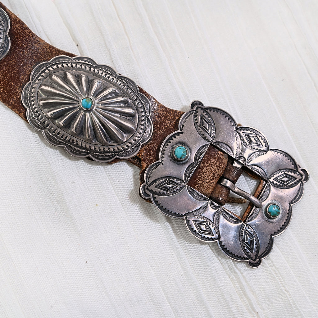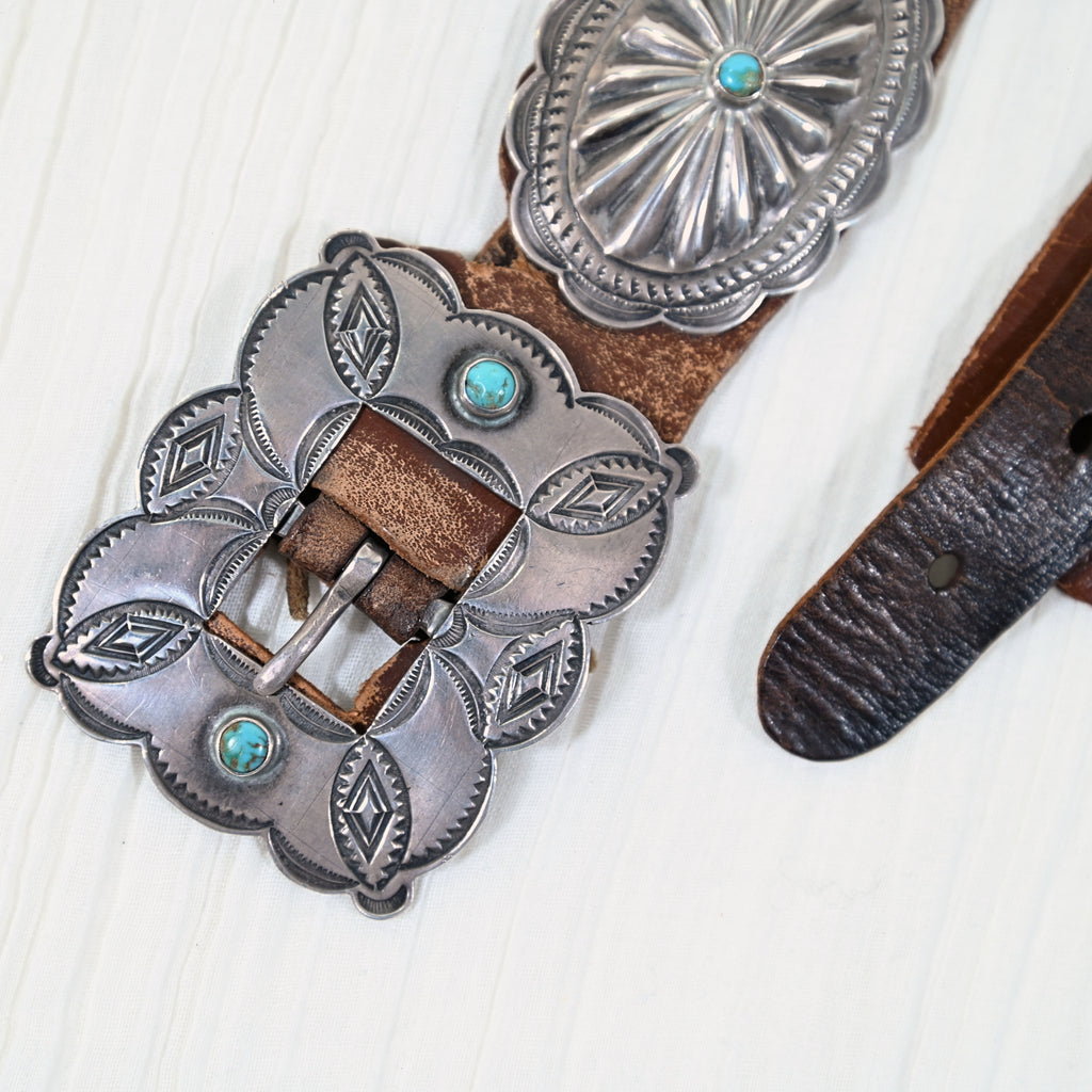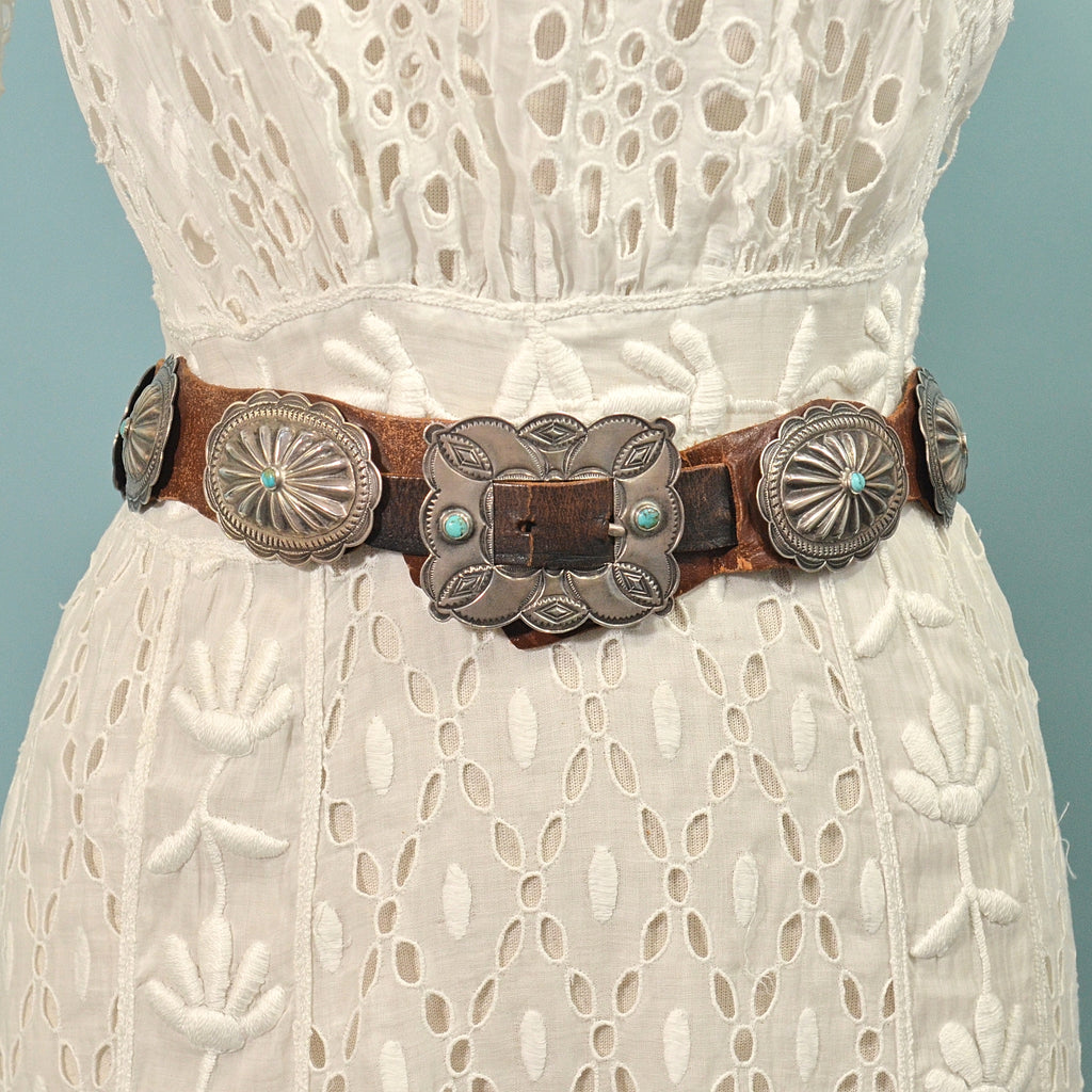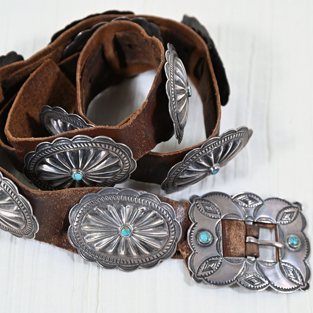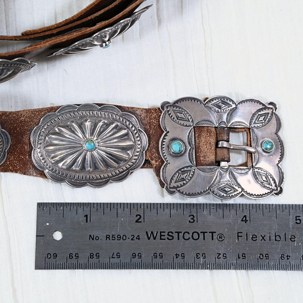 Beautiful 1930s Navajo Leather, Silver, and Turquoise Concho Belt. Almost 100 years old!