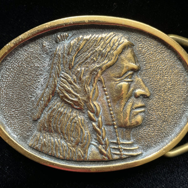 SOLD Vintage 70s Solid Brass Native American Indian Belt Buckle, BTS
