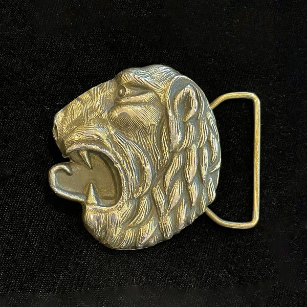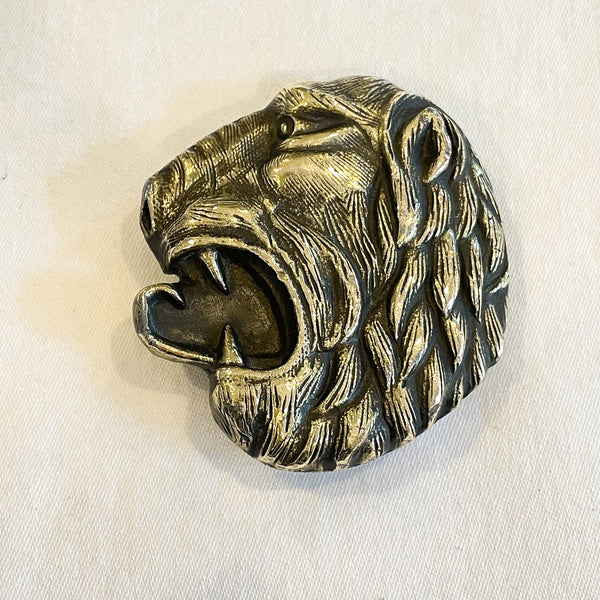Vintage 70s Lion Brass Belt Buckle, Indiana Metal Craft, Fierce Roaring Lion Buckle