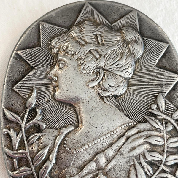 Bergamot Brass Works Vintage 70s Solid Brass Belt Buckle, Victorian Woman Pewter