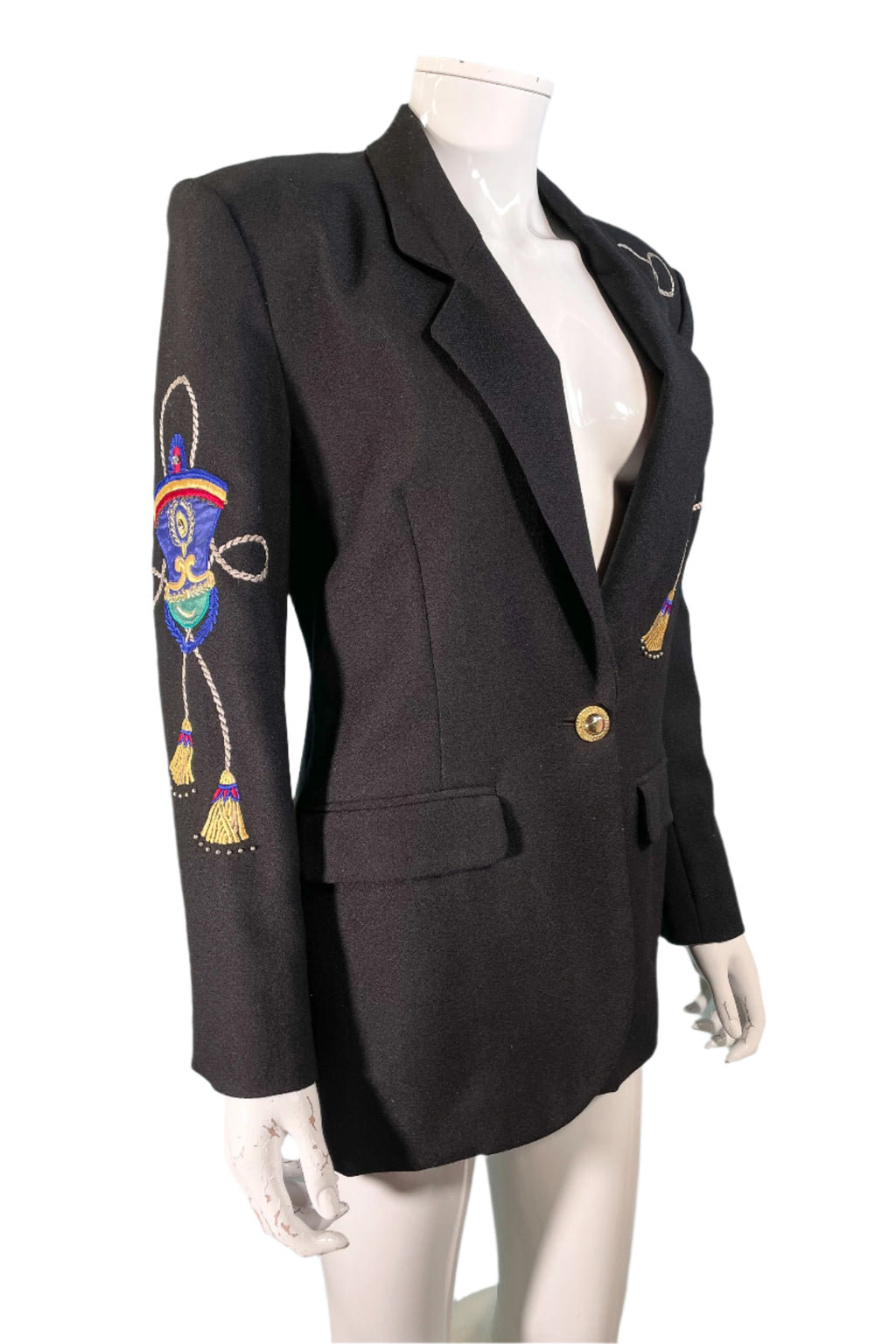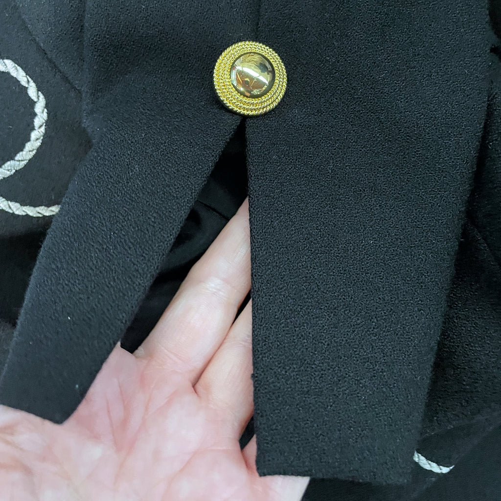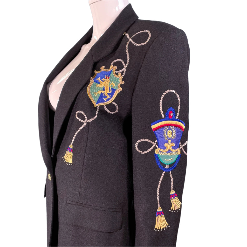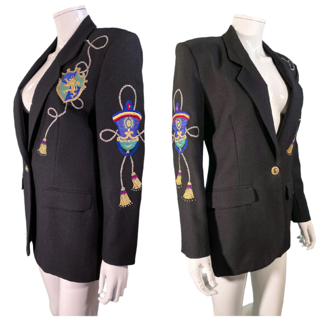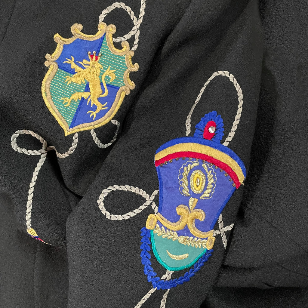Black wool statement blazer with embroidered/applique patches.