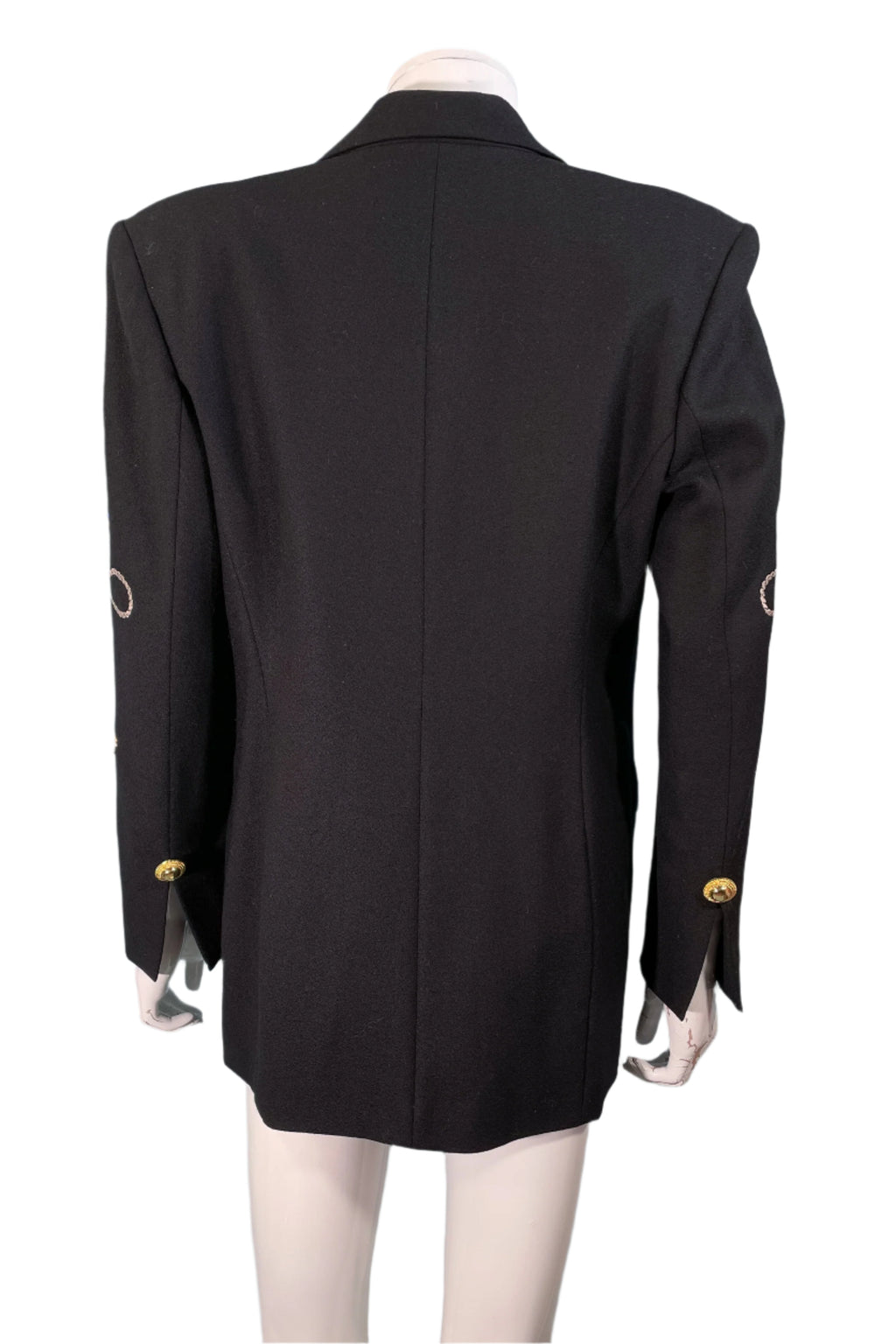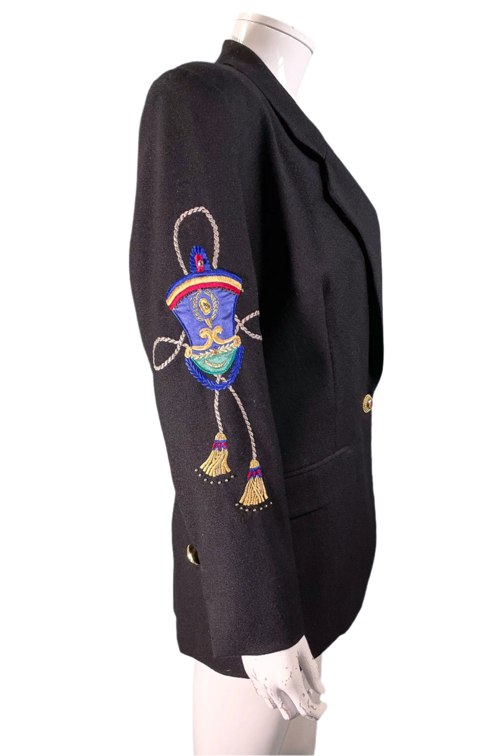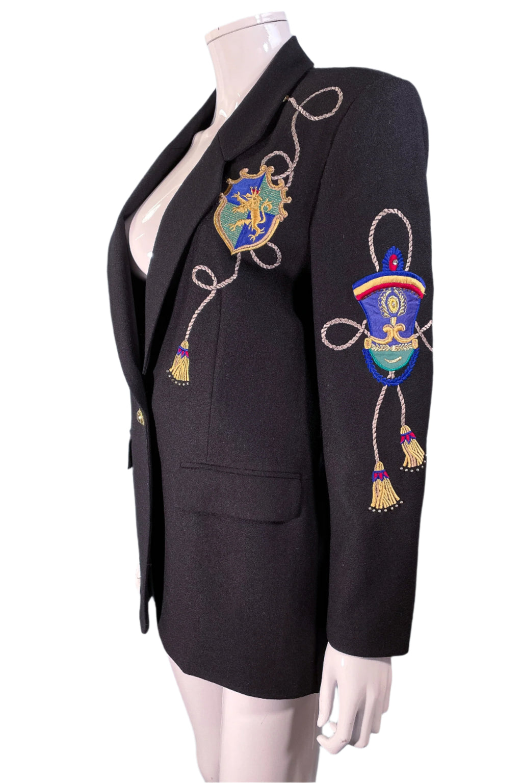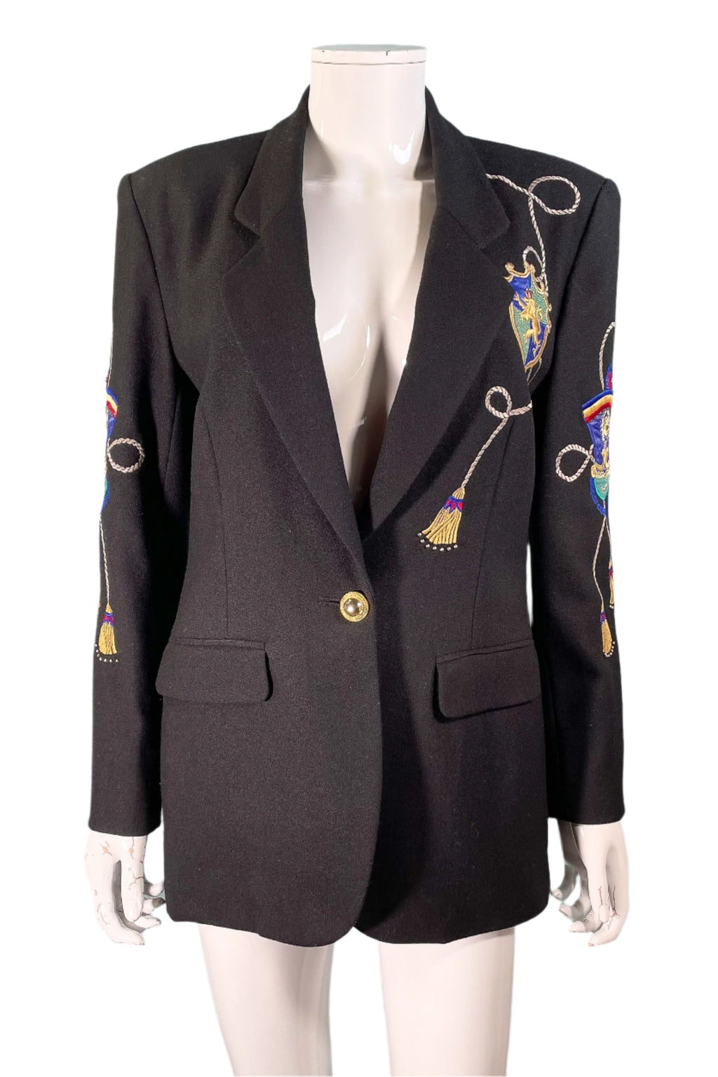 Black wool statement blazer with embroidered/applique patches.
