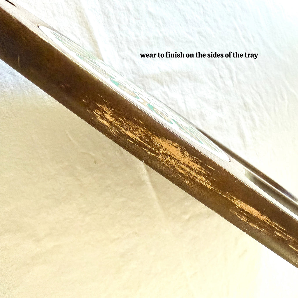 CONDITION: Very good, signs of wear and use. Has been cleaned, wood has been sealed with food-safe butcher block oil. No chips or cracks. There is loss of finish color on the sides of the tray.