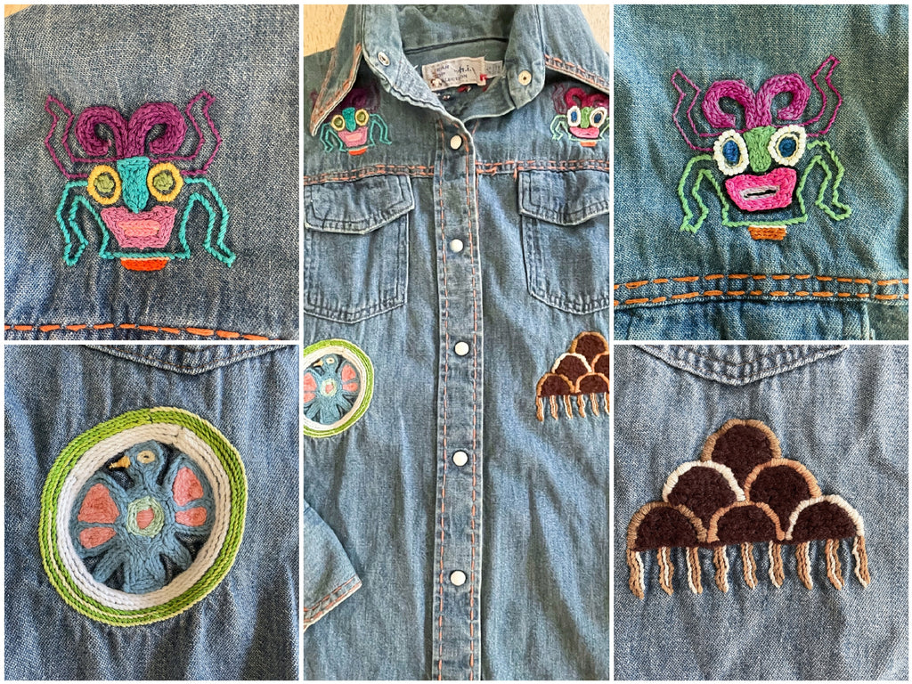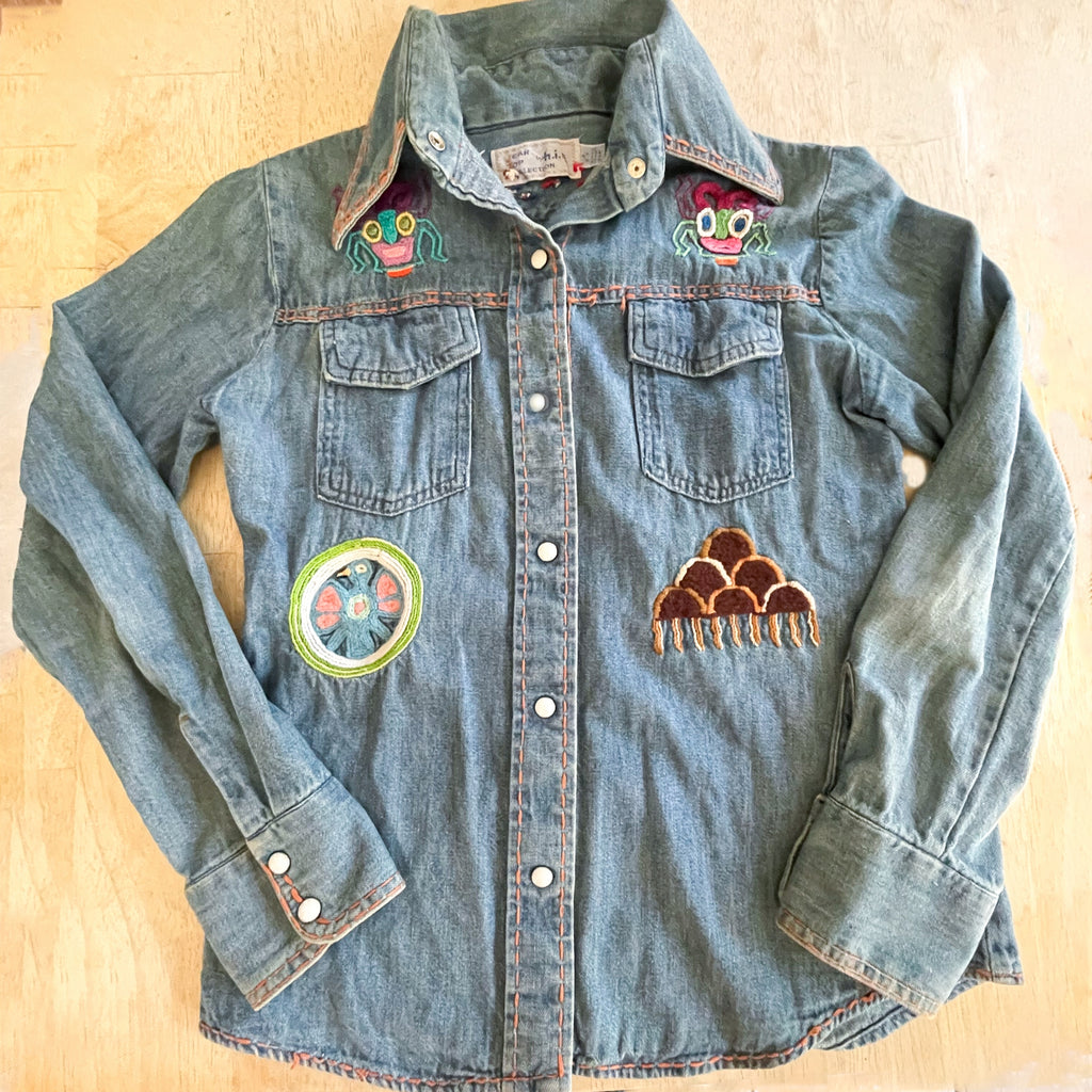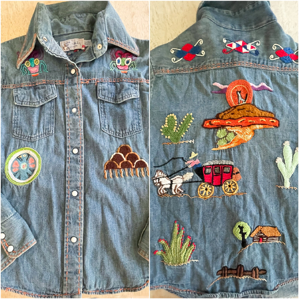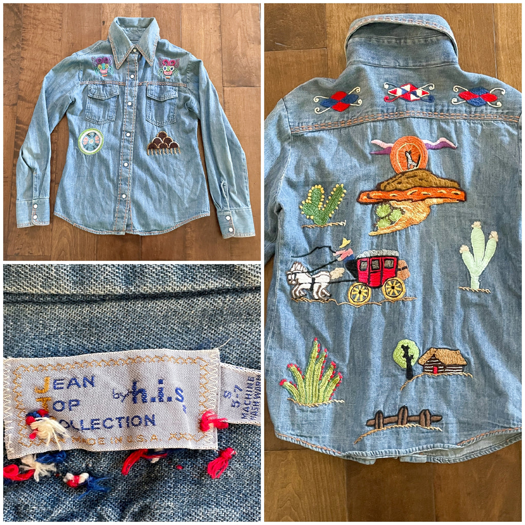 Vintage 60s 70s hand embroidered denim shirt with pearl snaps.