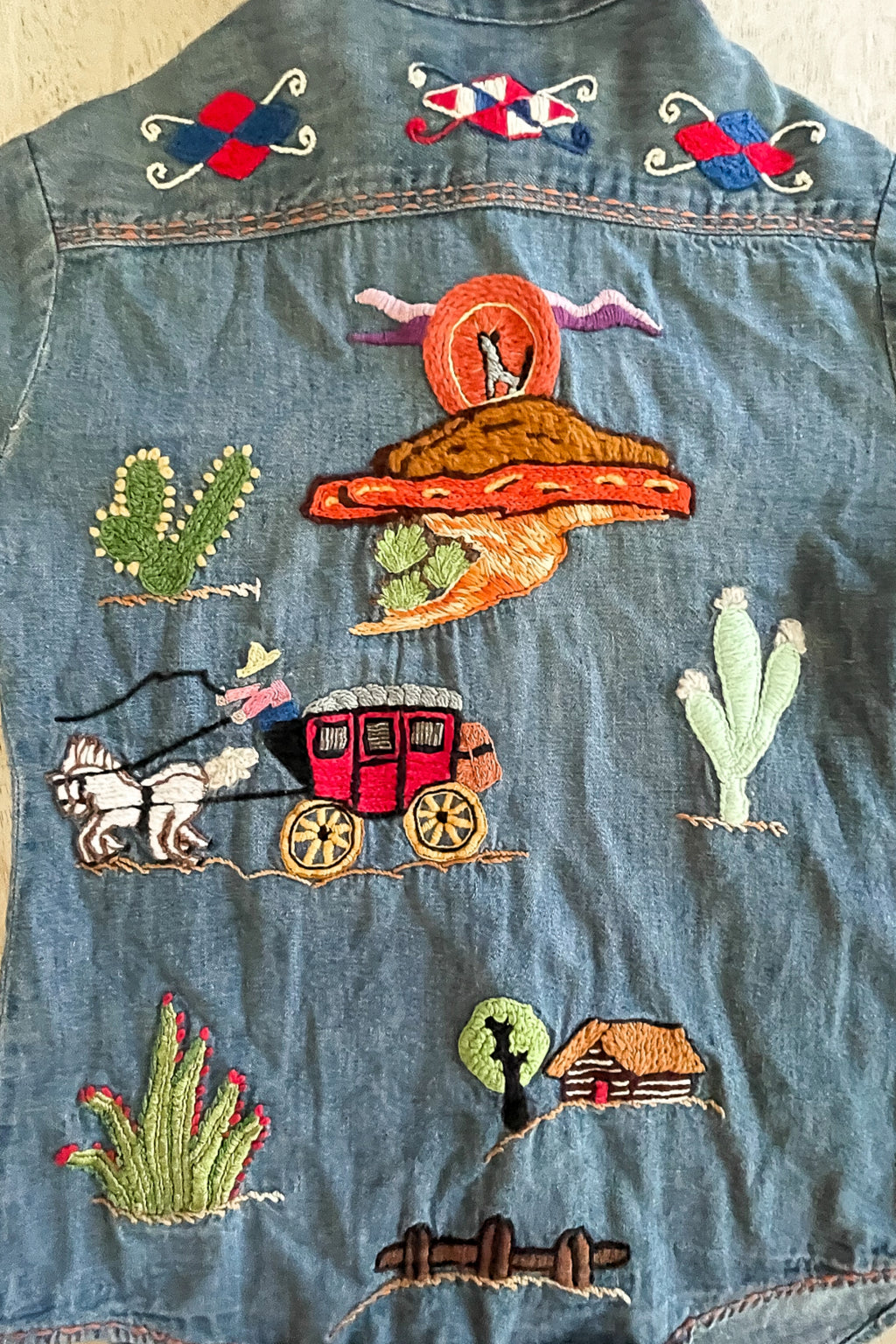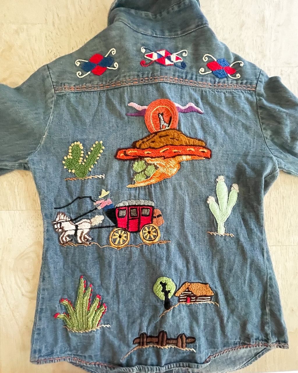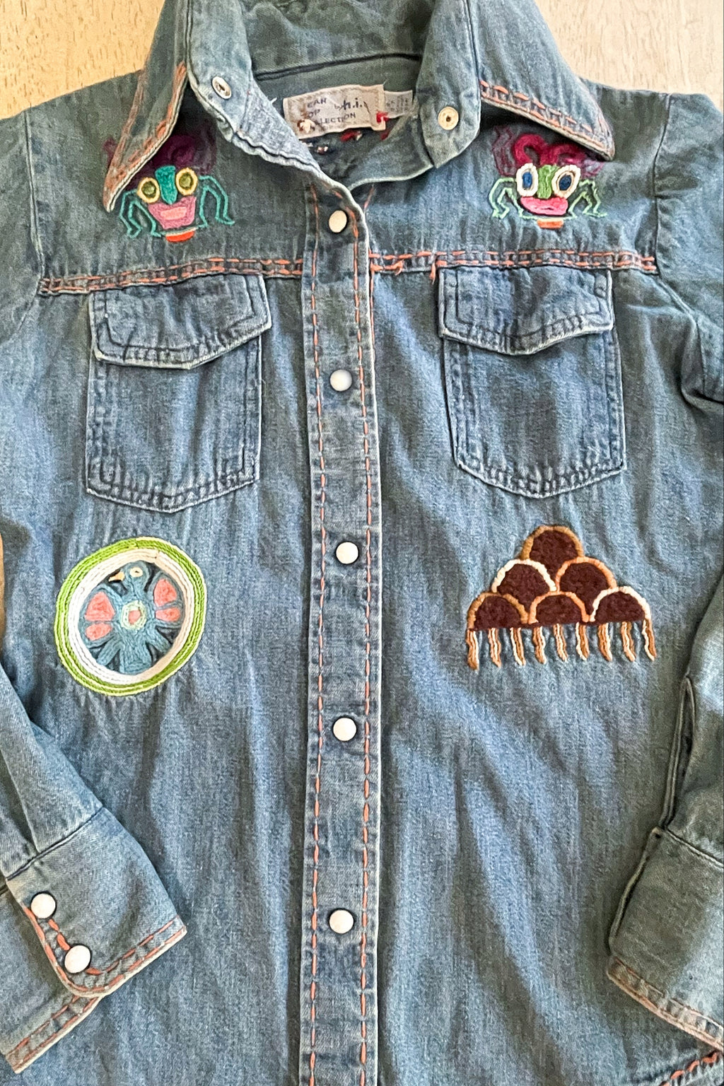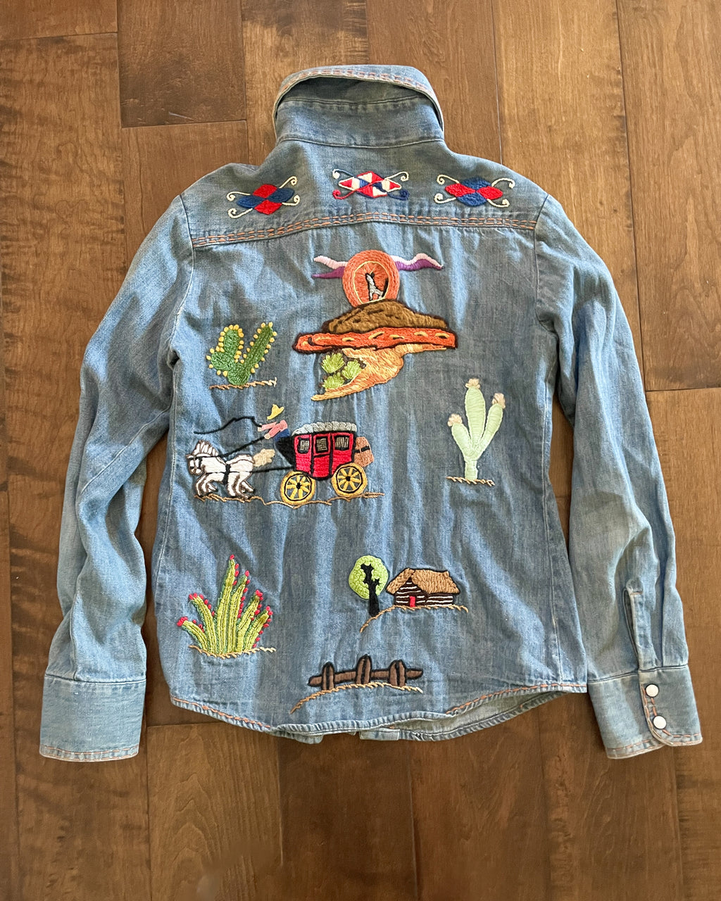 Vintage 60s 70s hand embroidered denim shirt with pearl snaps.