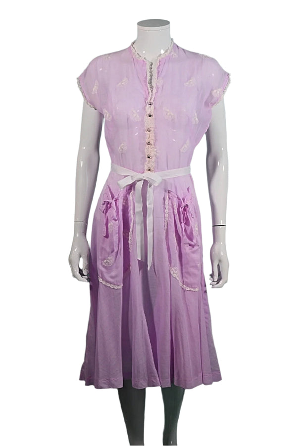 Vintage 40s Doris Dobson Embroidered Orchid Dress + Glass Buttons, Pockets, XS/S