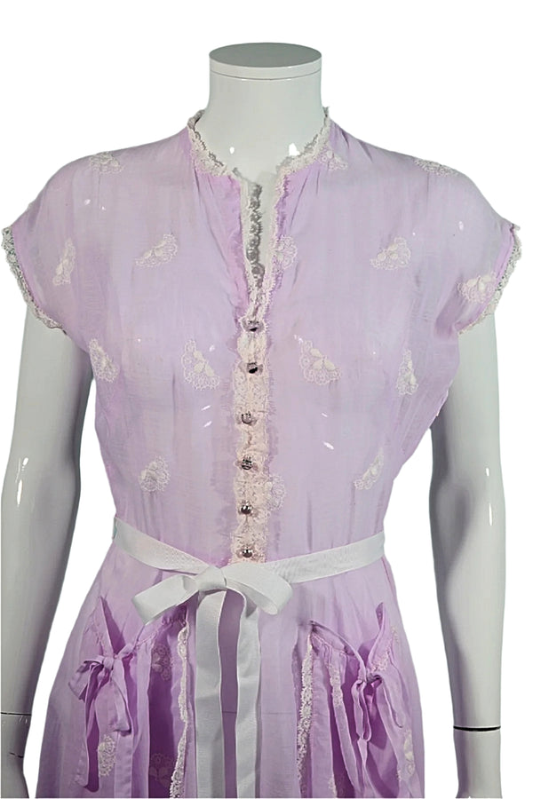 VTG 40s Sheer Floral Dress, Pussy Bow/Peter Pan Collar Purple Daisy Dress S