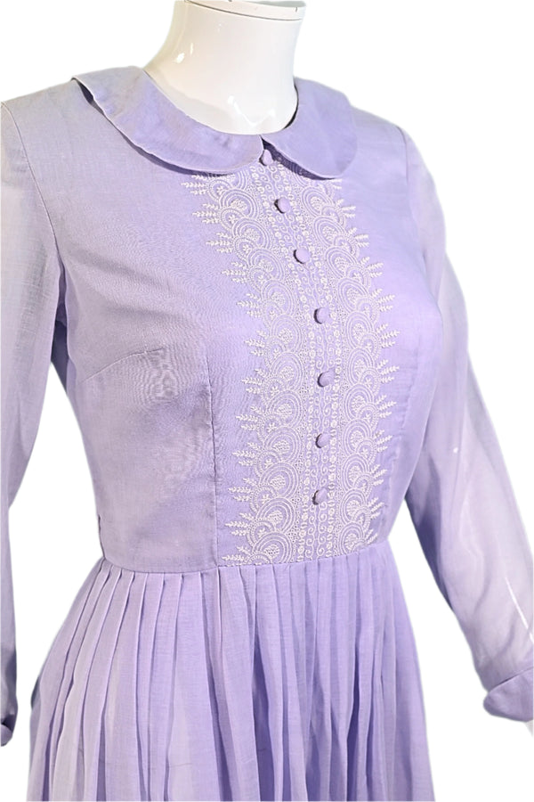 Vintage 60s Lavender Embroidered Cottagecore Dress, Peter Pan Collar S