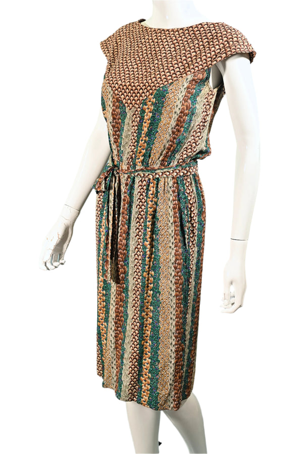 Argenti Vintage 70s Silk Dress, Feather Print Sheath Dress S
