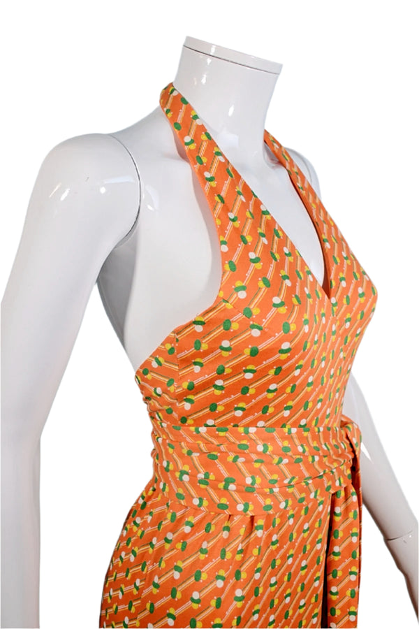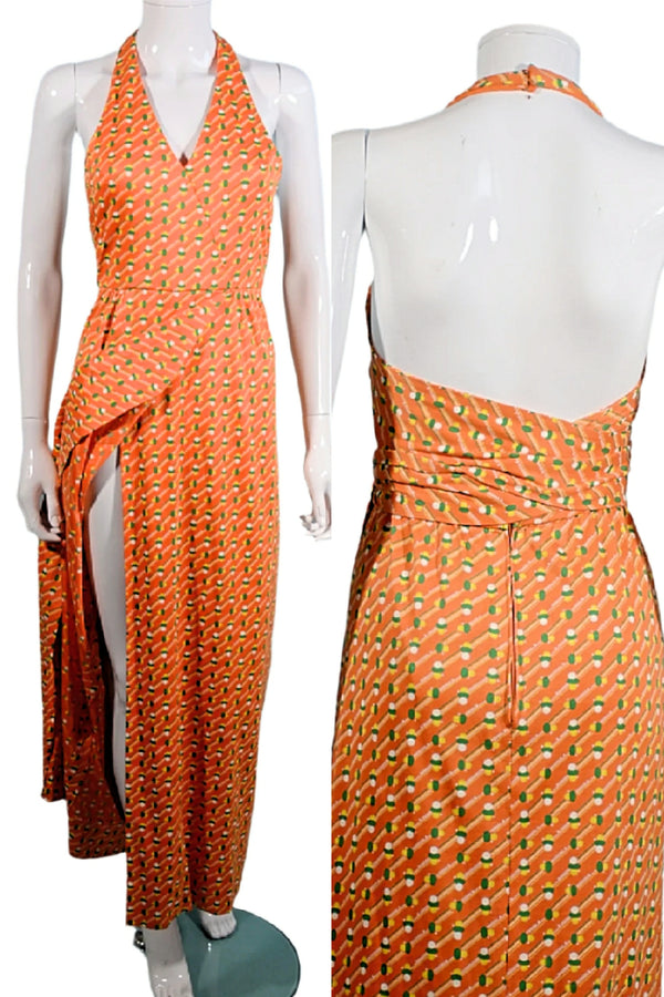 Geoffrey Beene Boutique 1970s Halter Maxi Dress, Slit Skirt Belt S
