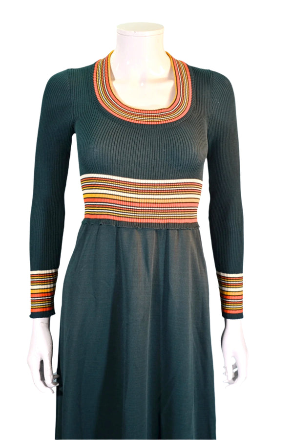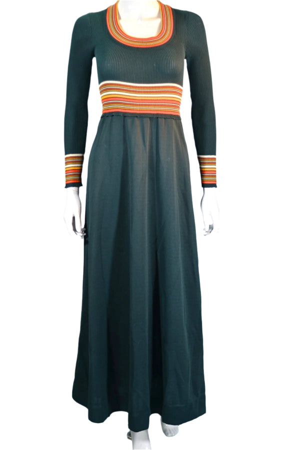 Vintage 1970s Dark Green Knit Maxi Dress, Striped Details XS/S
