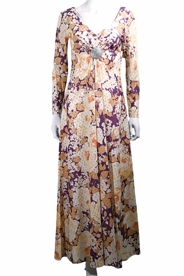 60s Sparkle Maxi Dress, 70s Floral Peach/Purple Dress XS