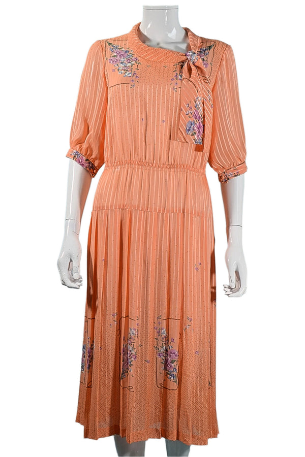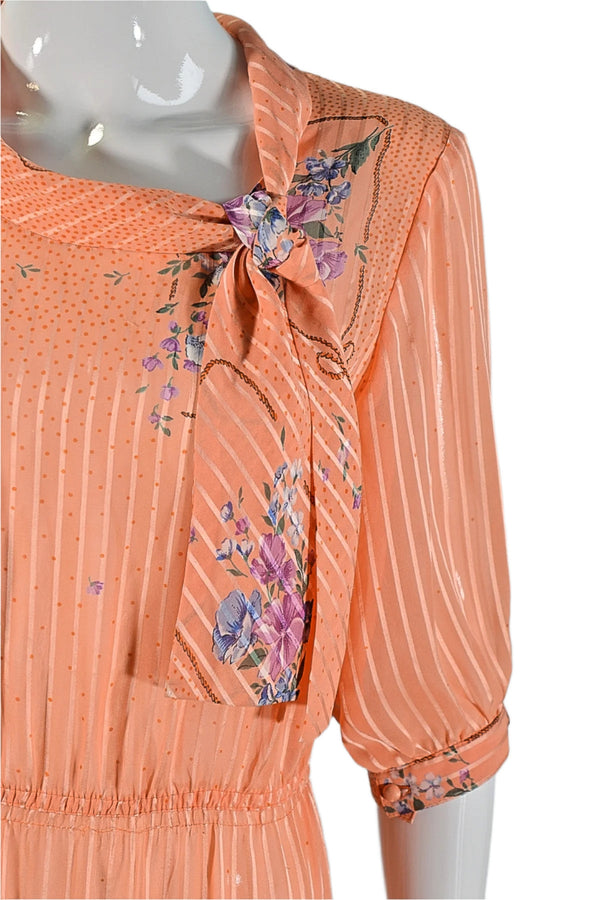 Vintage 70s Does 30s Floral Print Dress, Peach Semi Sheer Dress M