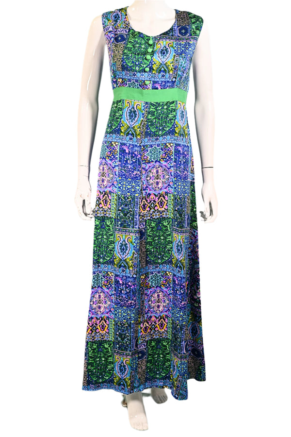 Vintage 60s/70s Beautiful Bohemian Print Maxi Dress, Hippie Festival Dress M