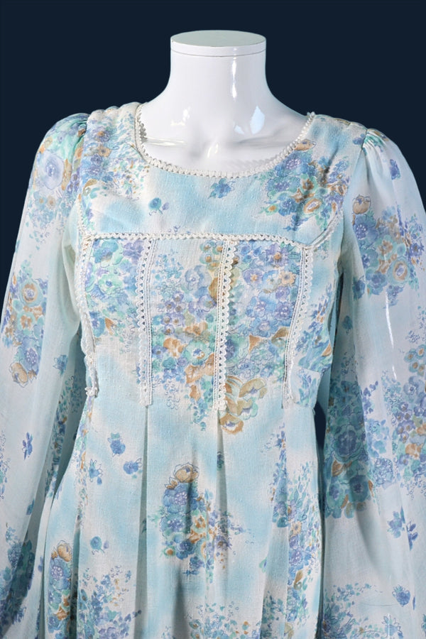 Vintage Angel Sleeve Maxi Dress, Blue Floral 70s Hippie Dress S