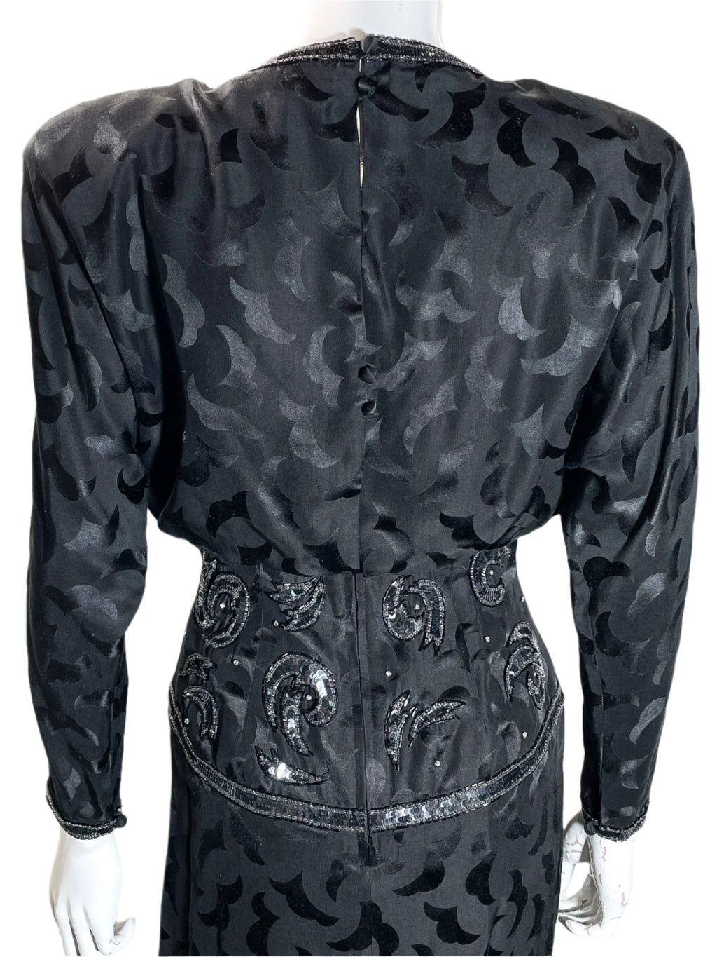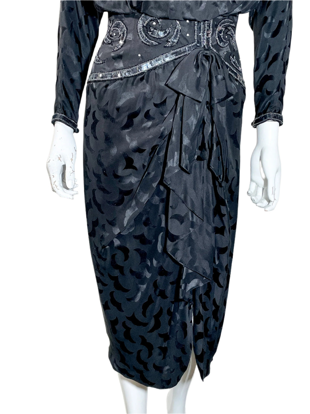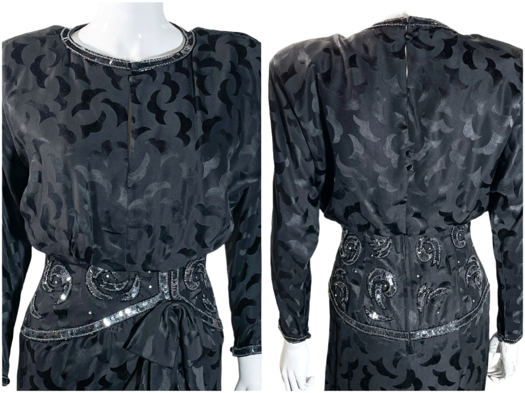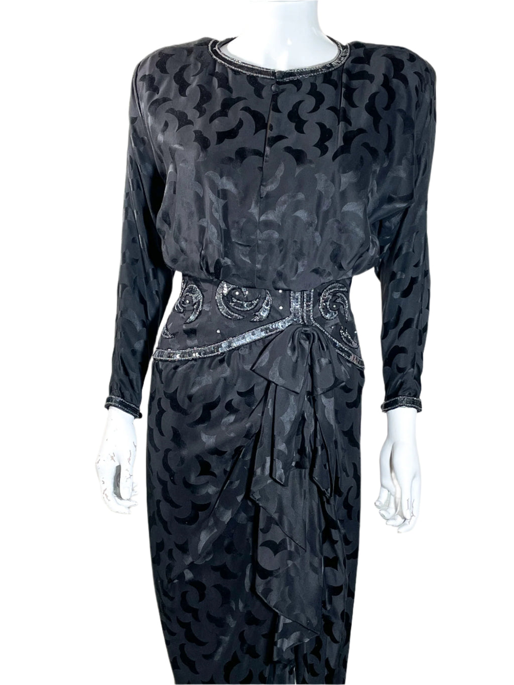 Lovely black silk with sequin and beaded details along the waist and hips. Beads on neckline & sleeve cuffs.