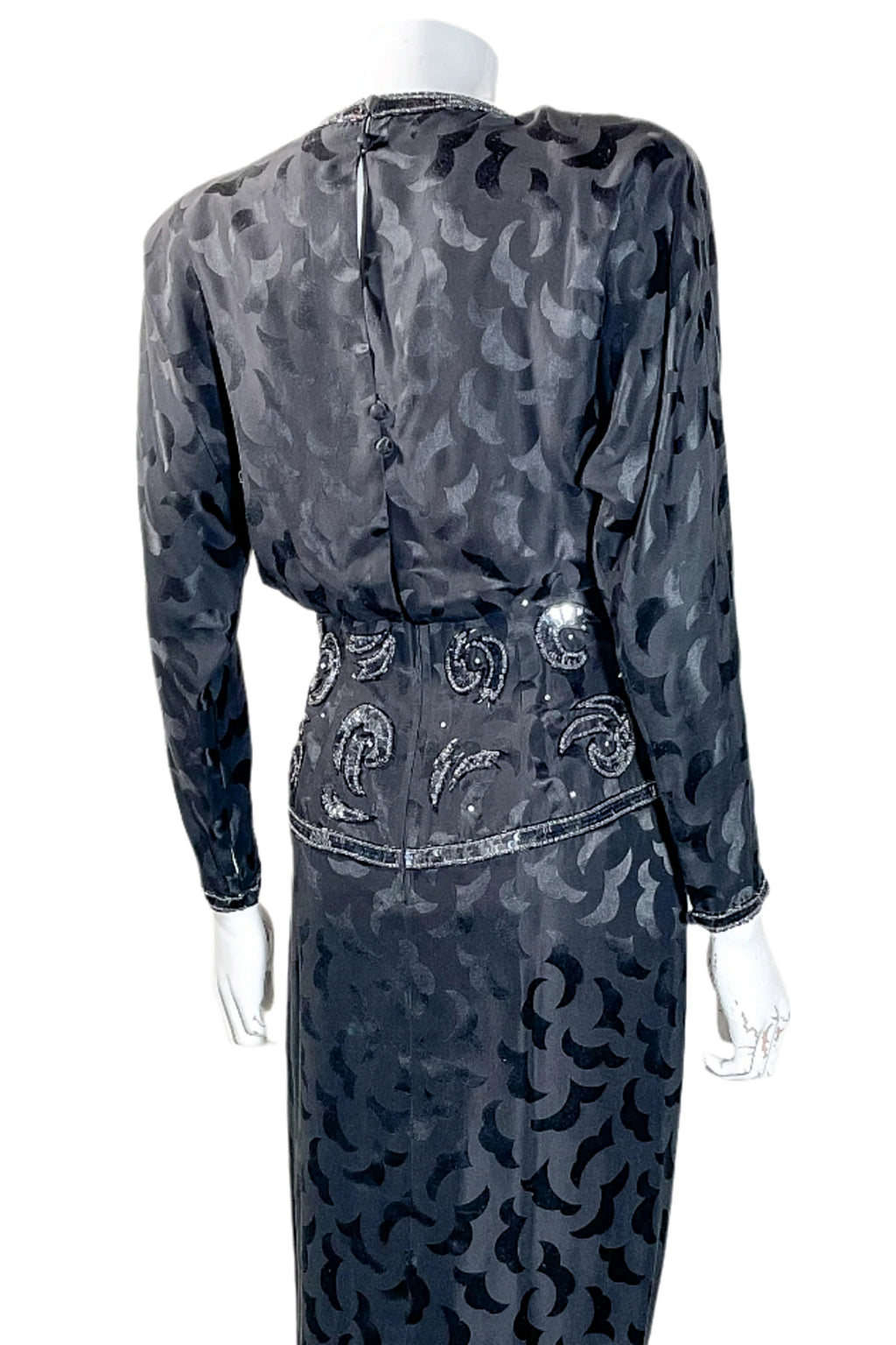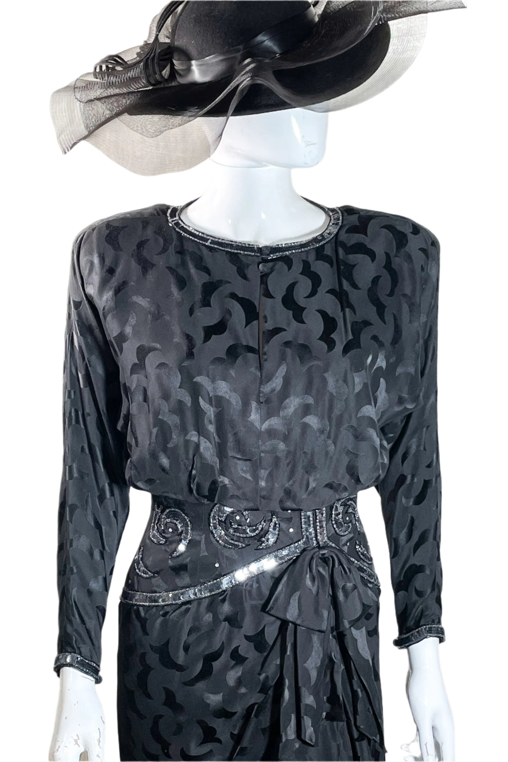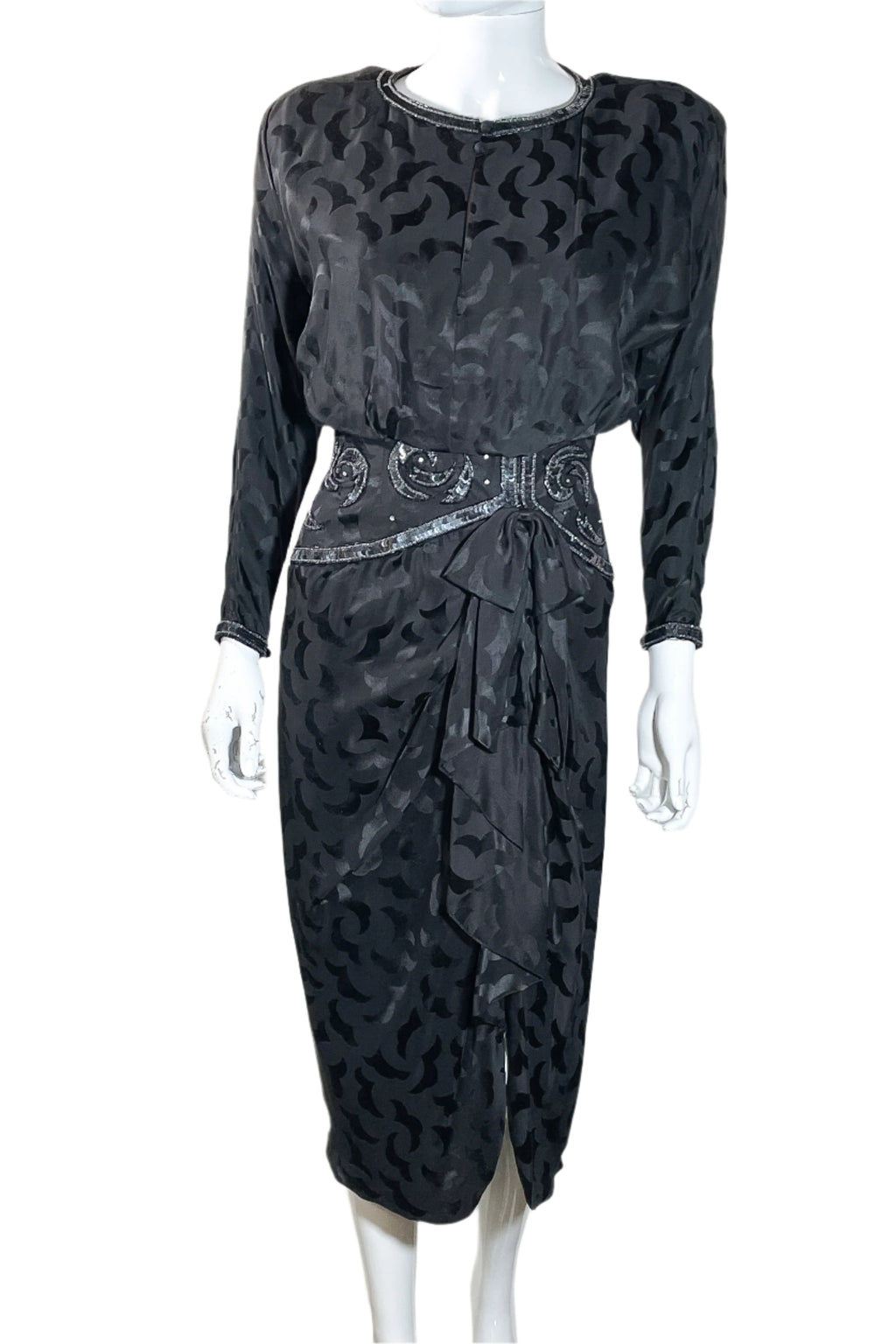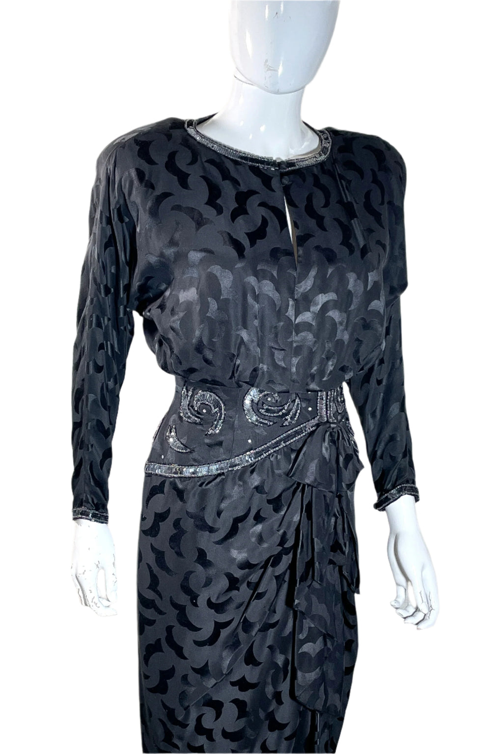 Lovely black silk with sequin and beaded details along the waist and hips. Beads on neckline & sleeve cuffs.