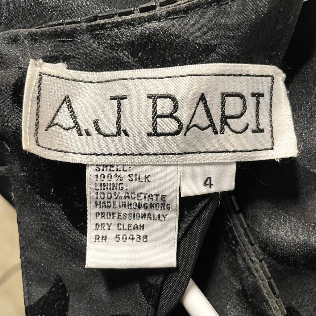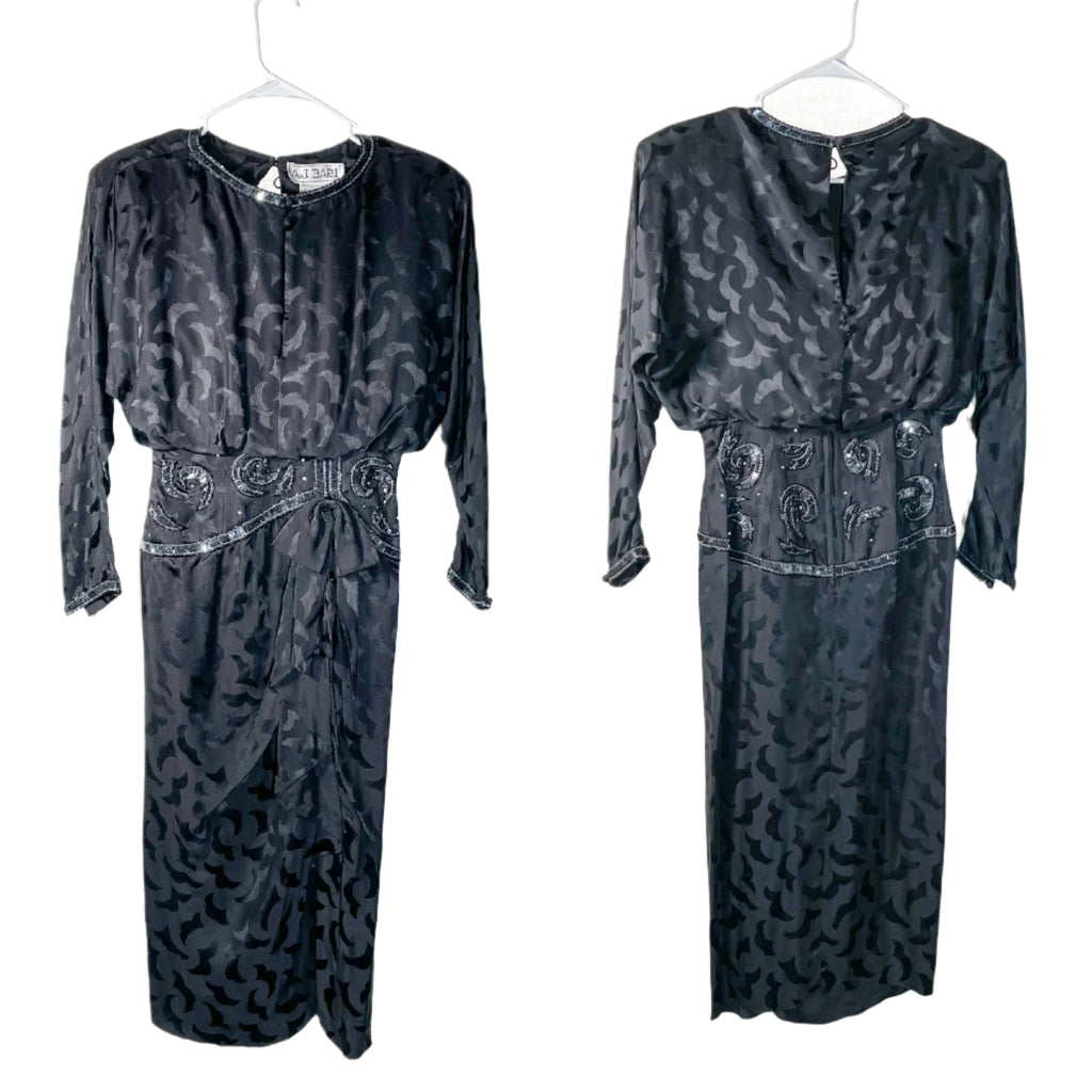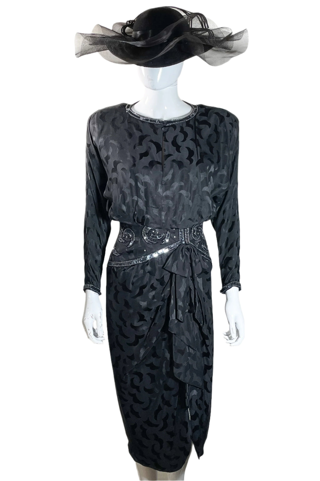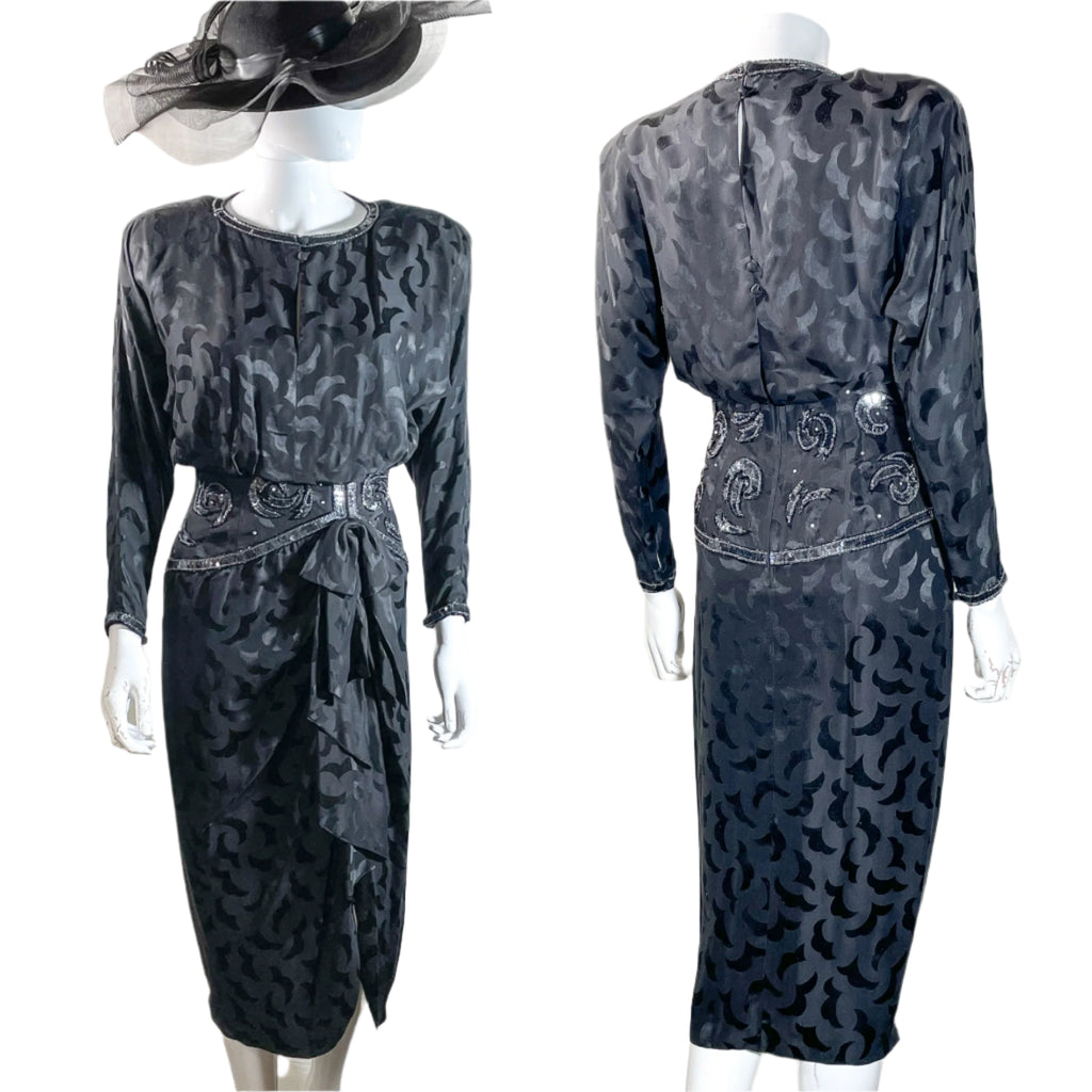 Lovely black silk with sequin and beaded details along the waist and hips. Beads on neckline & sleeve cuffs.