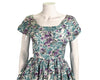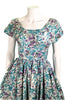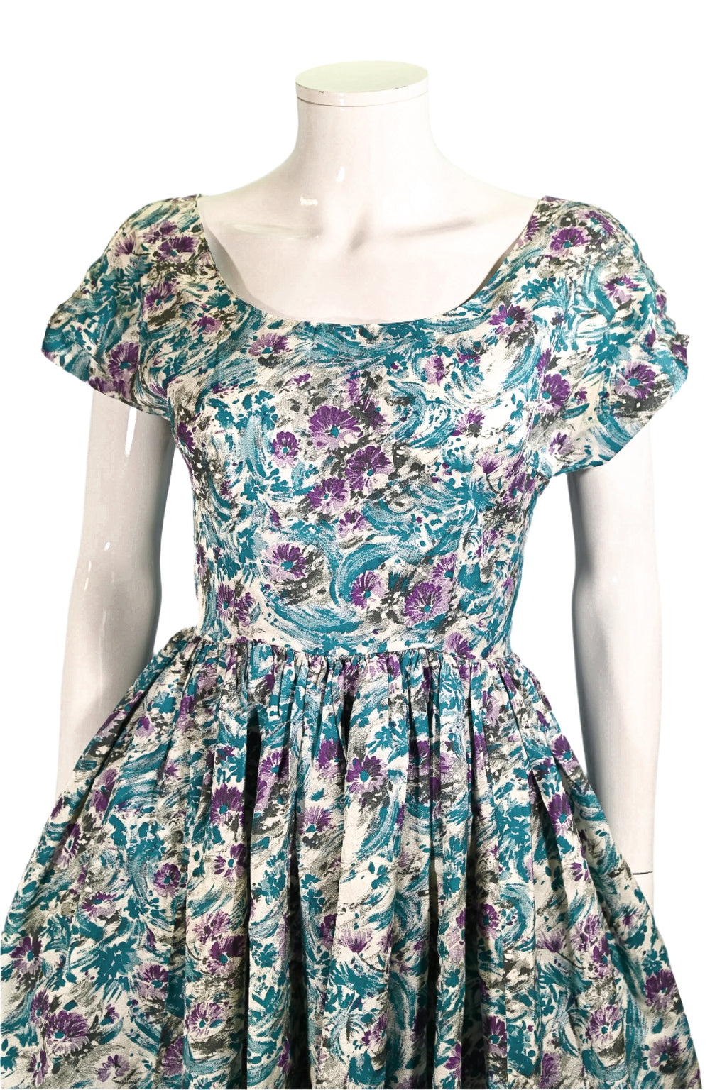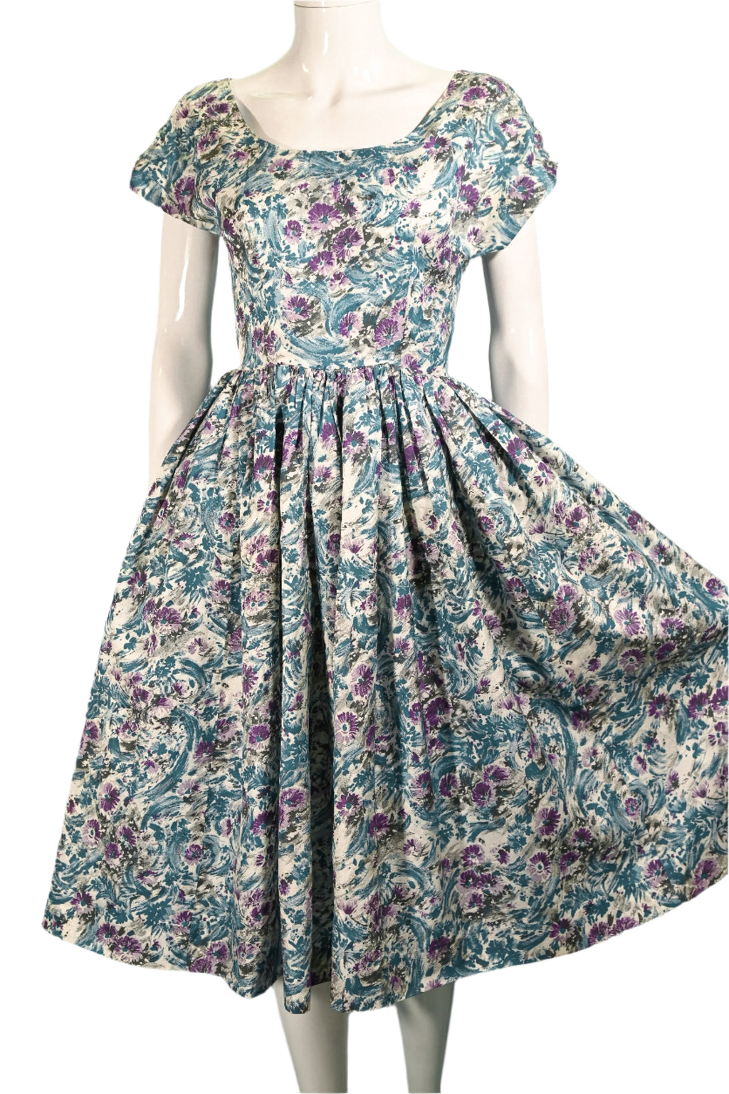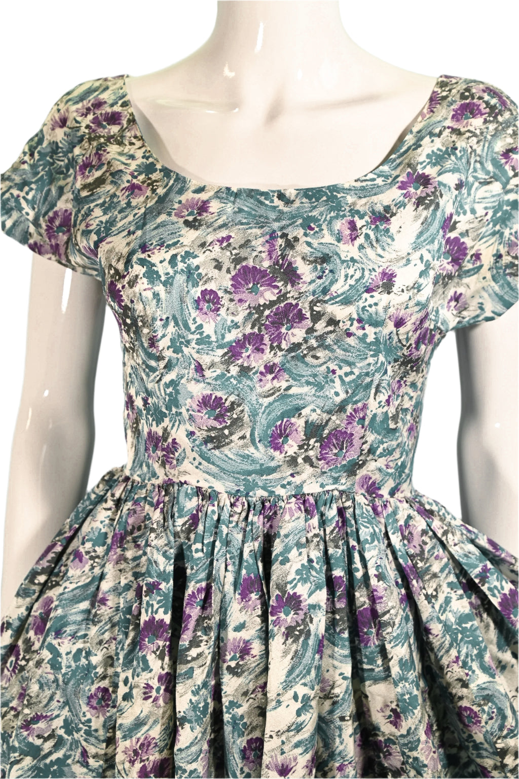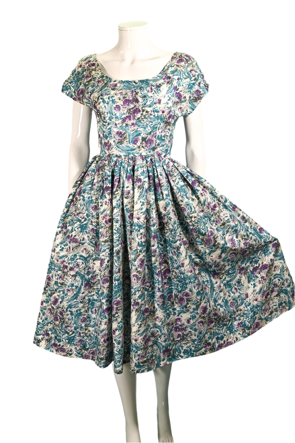 50s Teal Purple Floral Dress, Fit and Flare Fitted 26" Waist