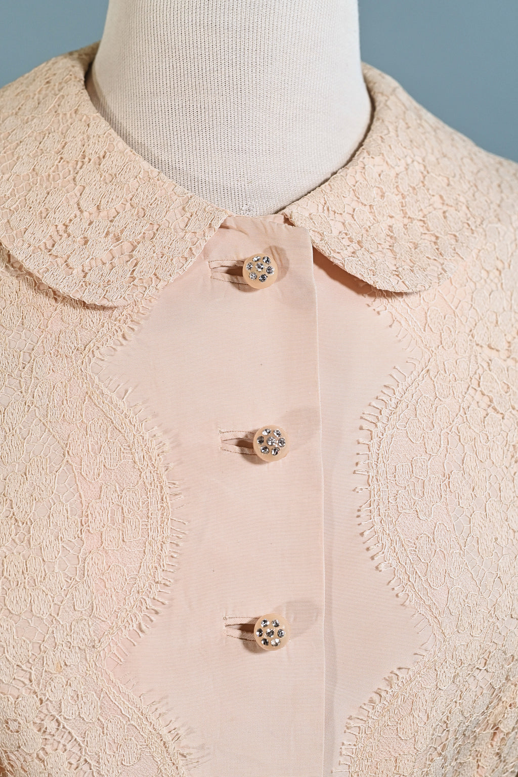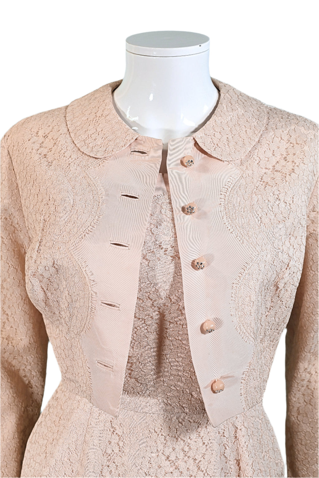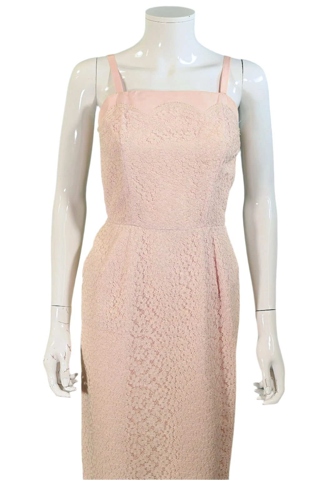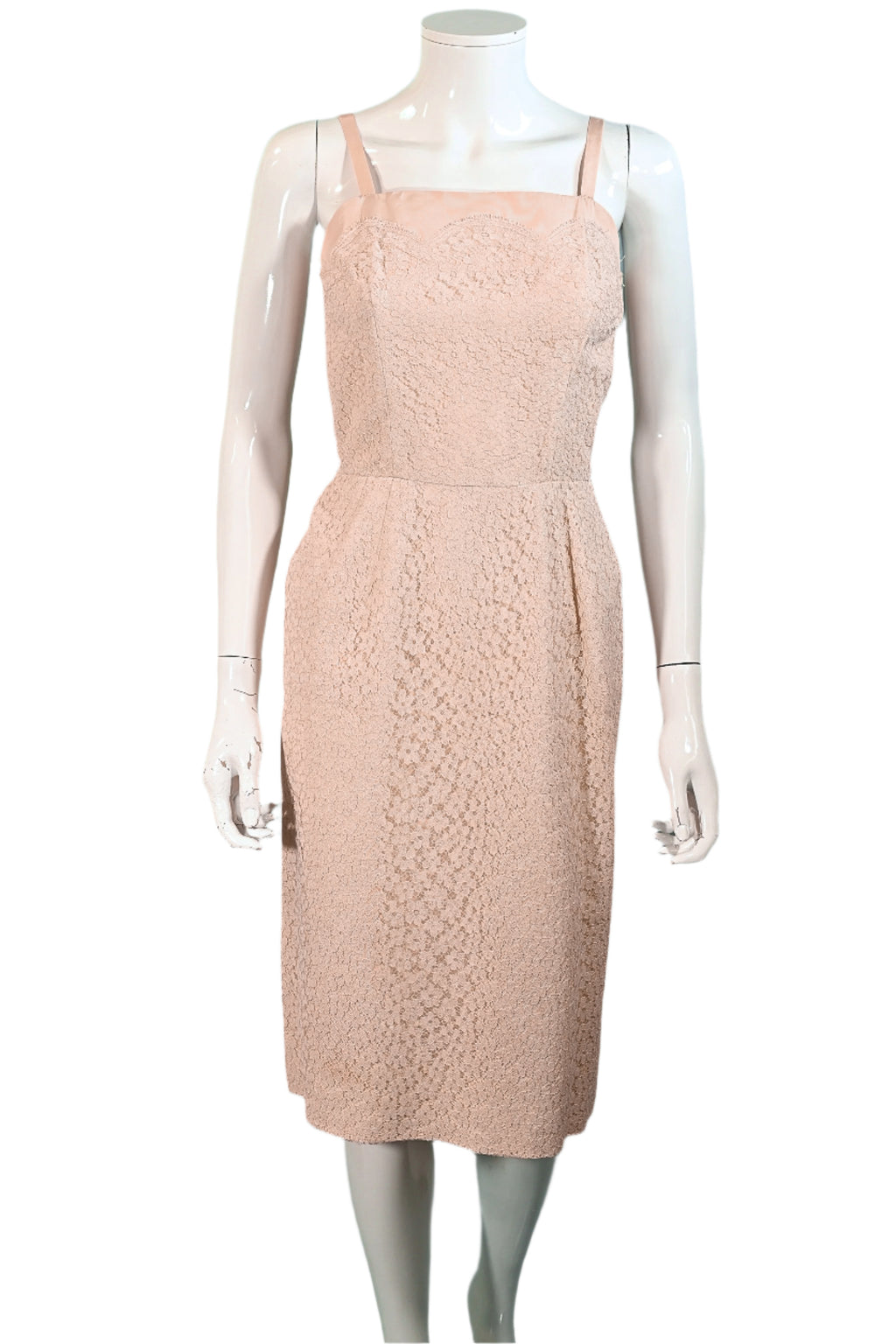 Strappy 1950s lace dress with a fitted waist, darts at bodice/bust to allow room for bust.