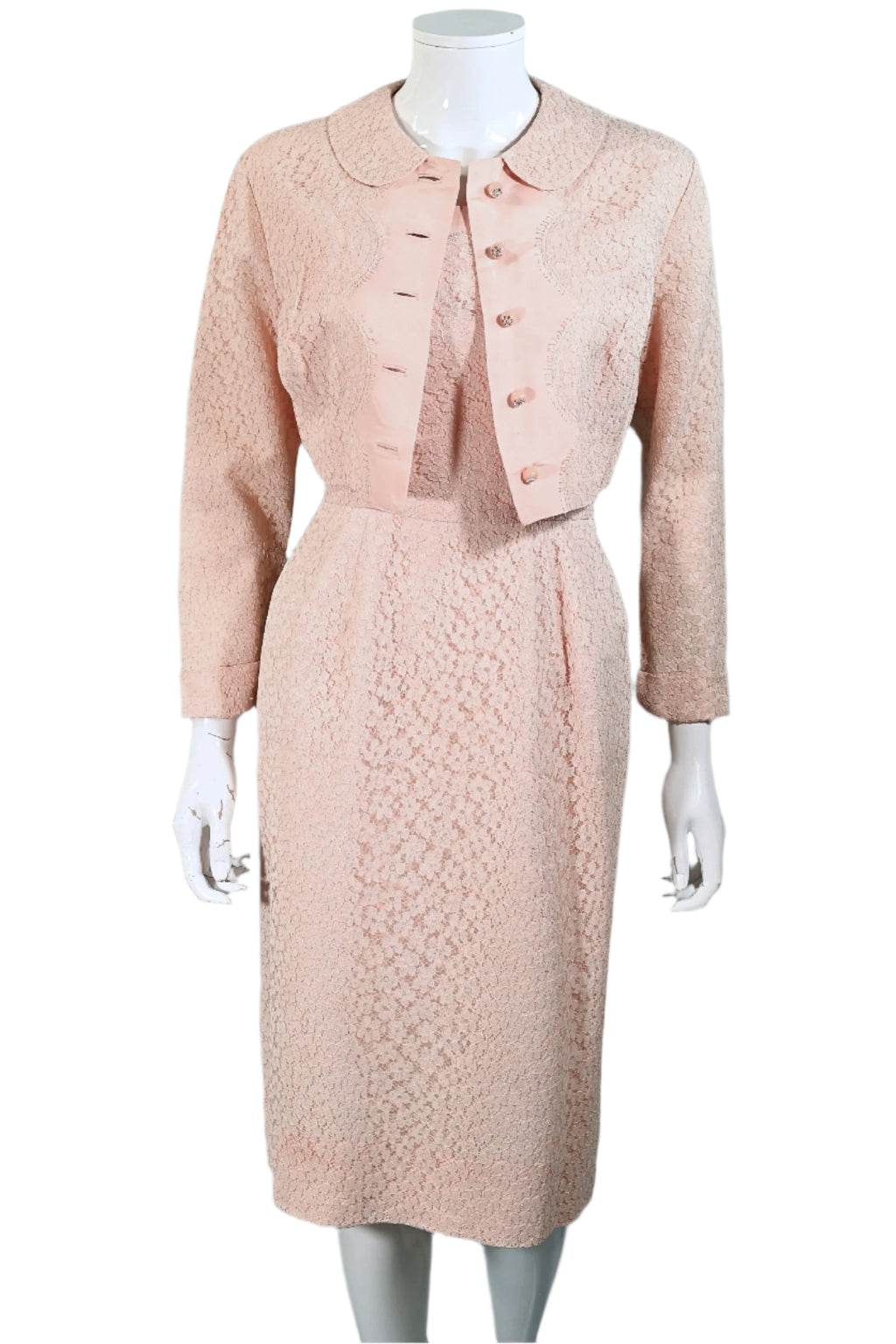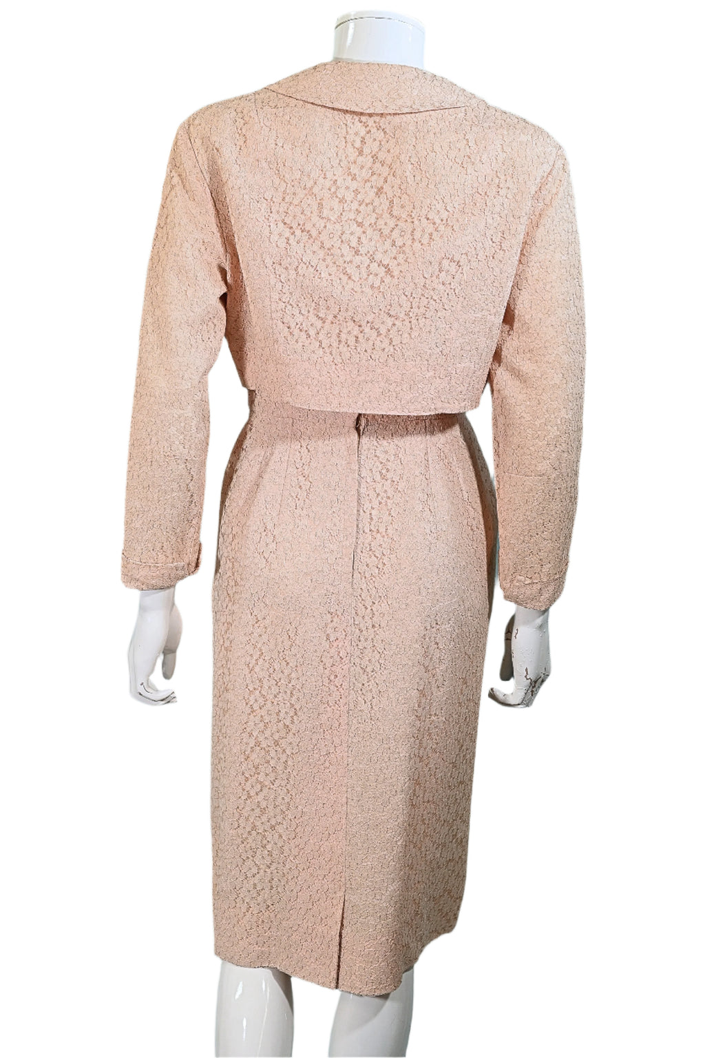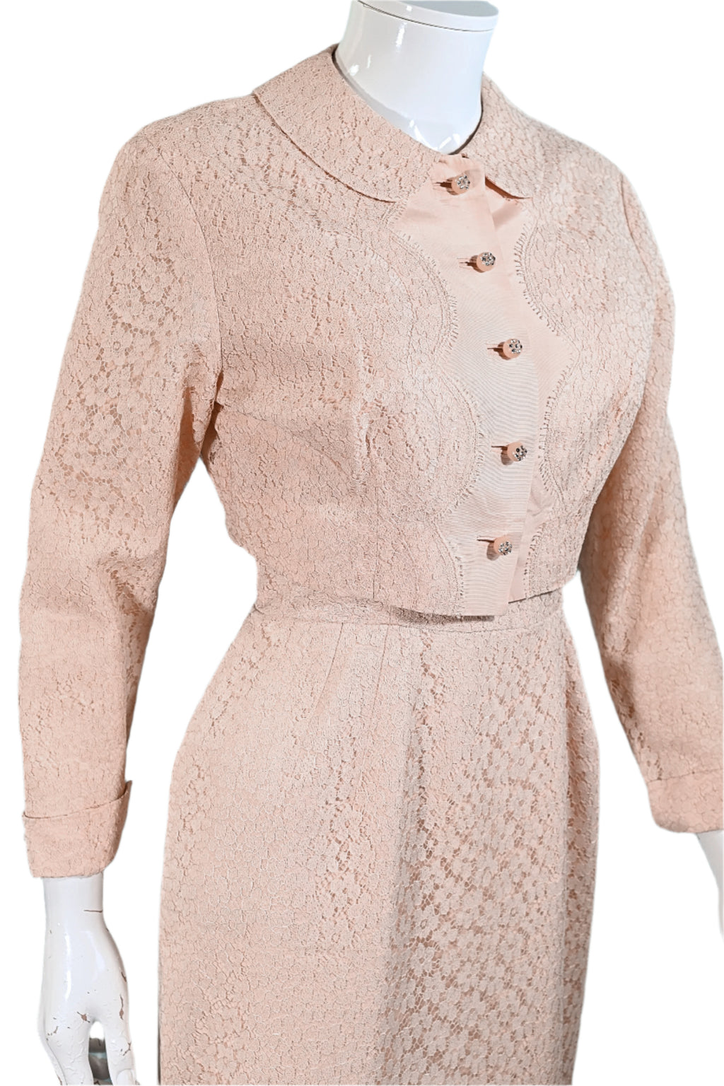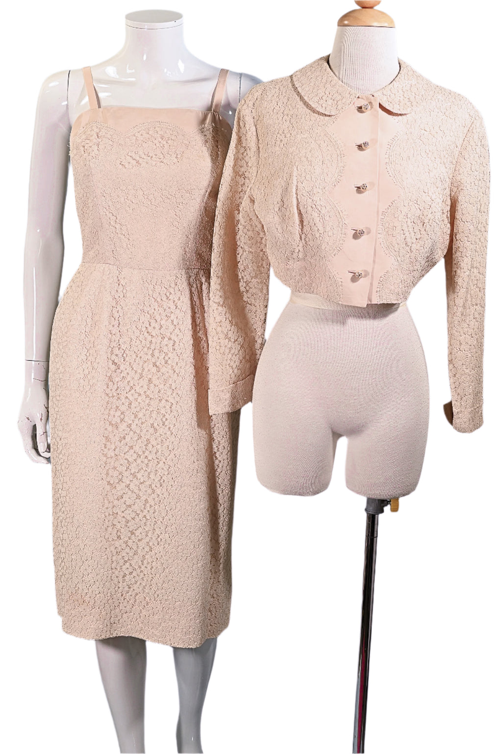 Strappy 1950s lace dress with a fitted waist, darts at bodice/bust to allow room for bust.