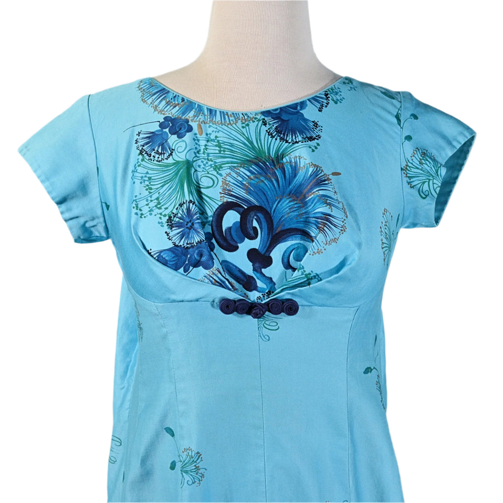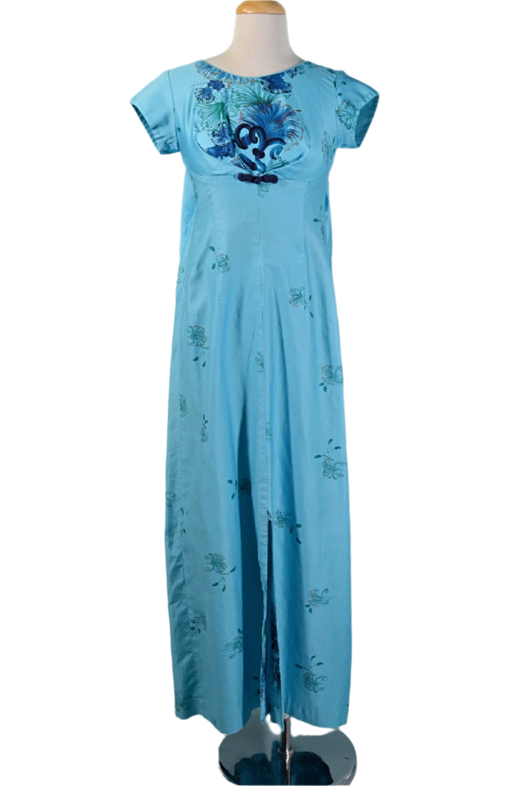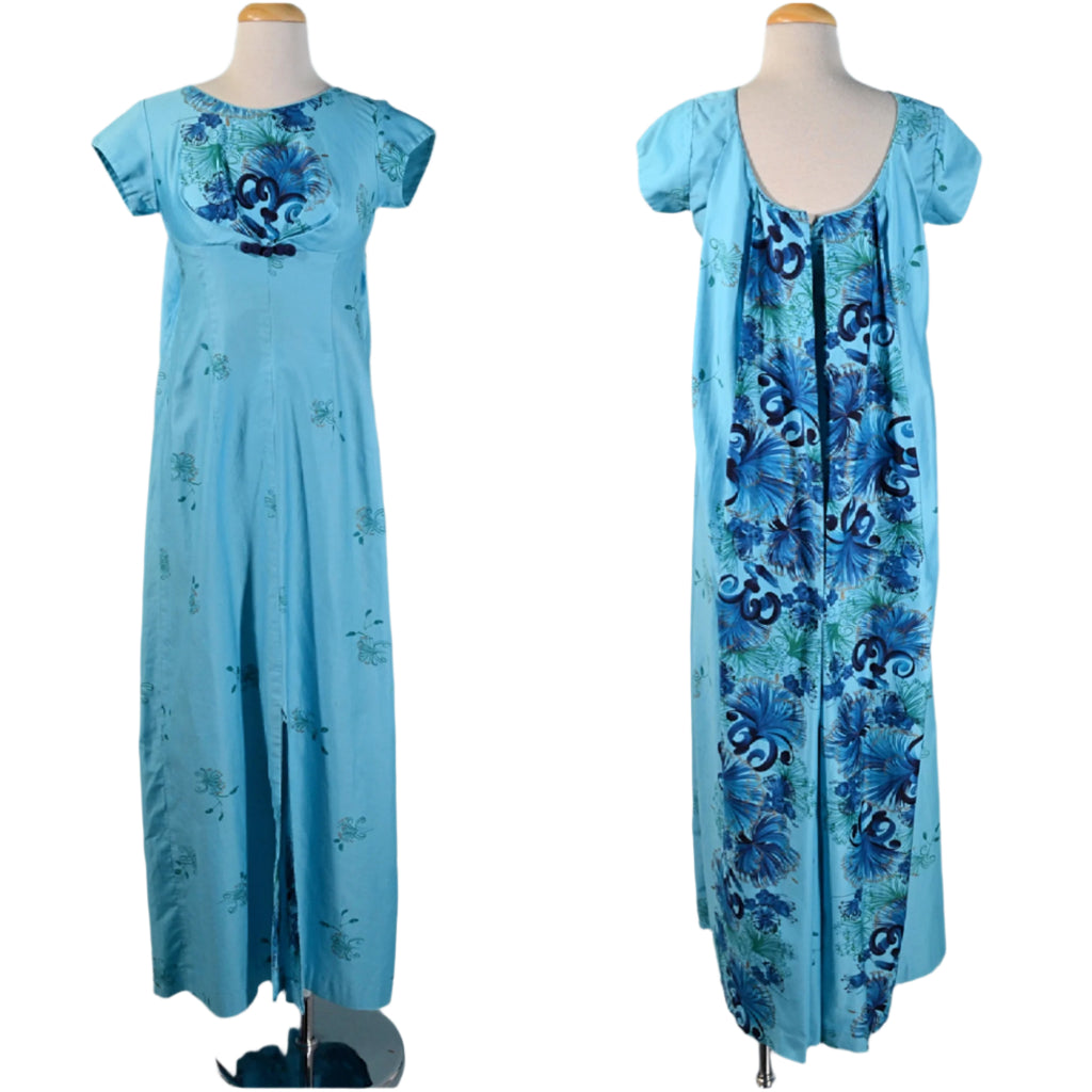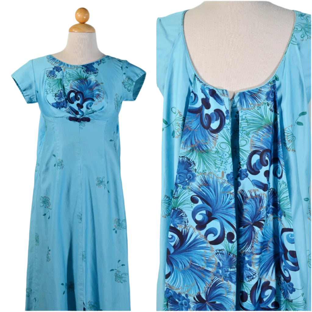 Vintage Beautiful Blue 50s Hawaiian Maxi Dress, Watteau Pleated Party Dress XXS