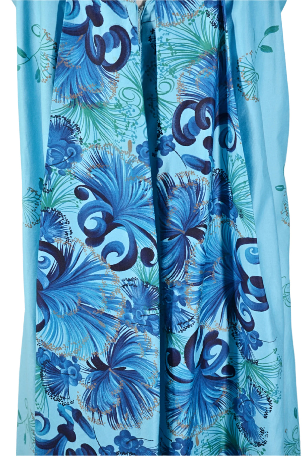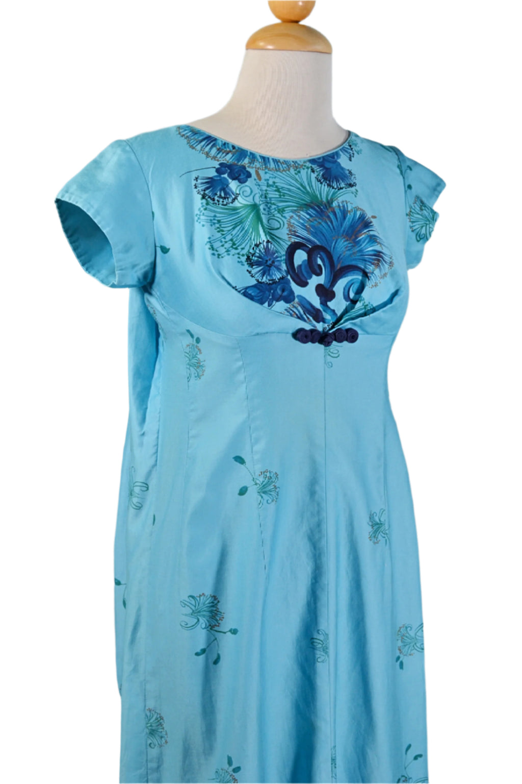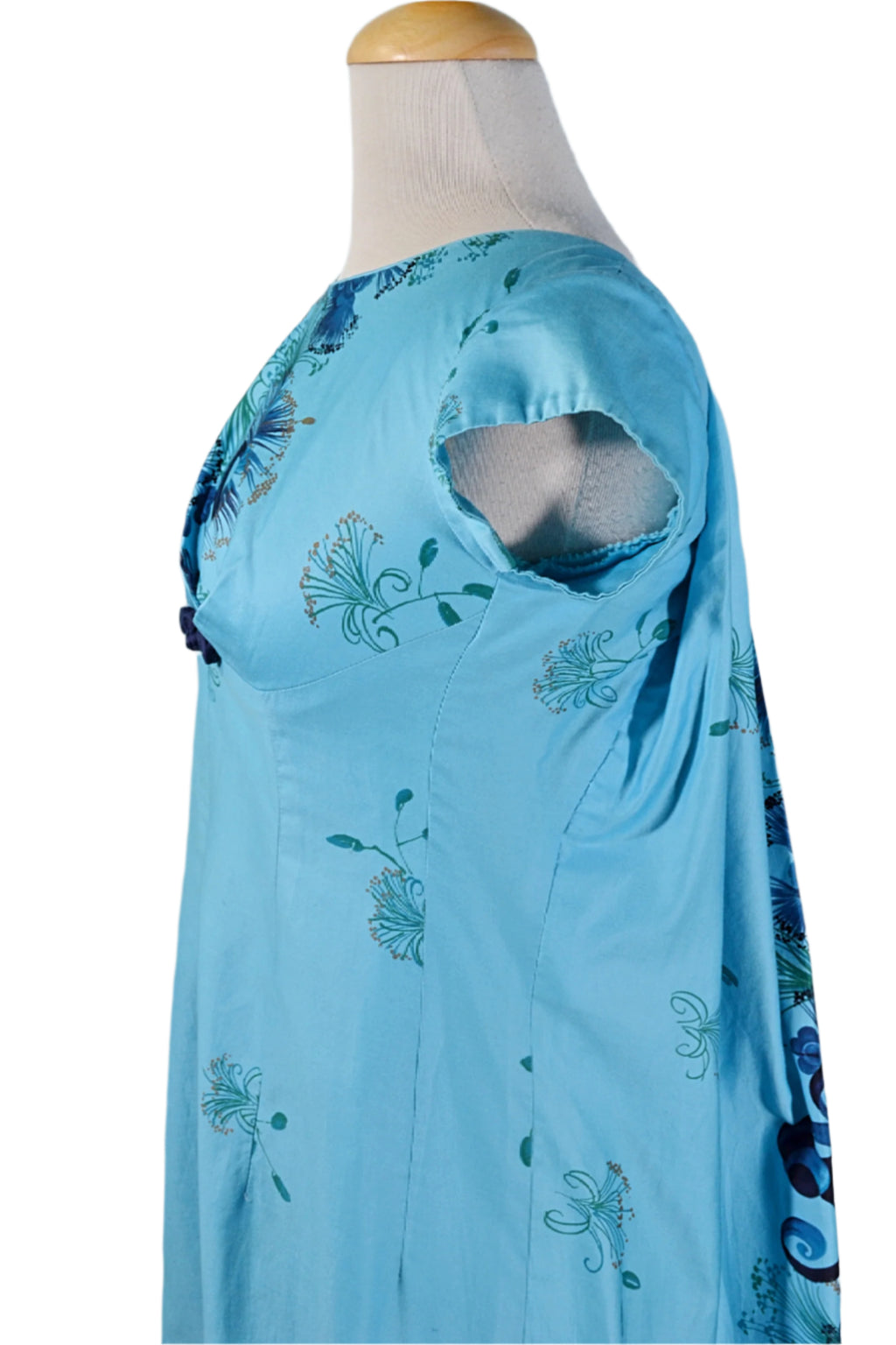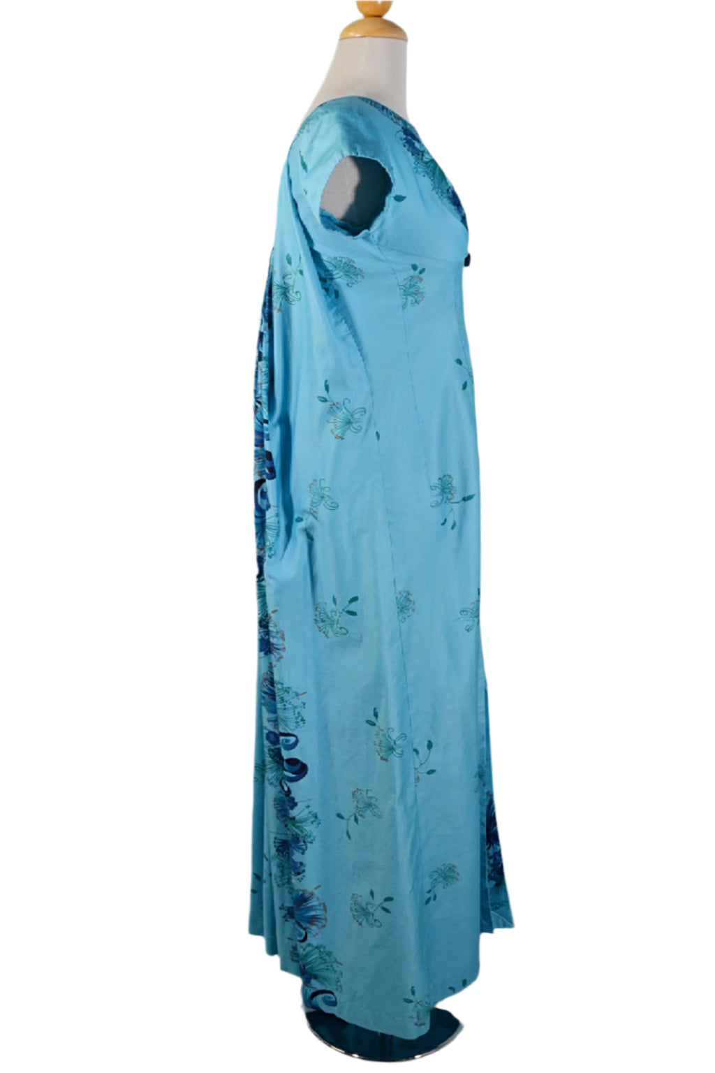 Vintage Beautiful Blue 50s Hawaiian Maxi Dress, Watteau Pleated Party Dress XXS