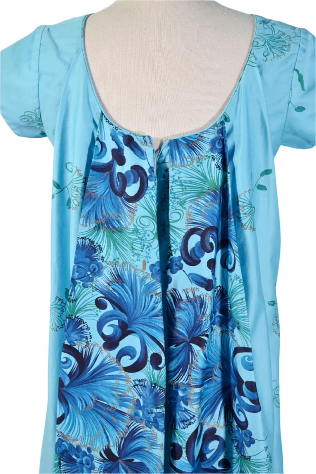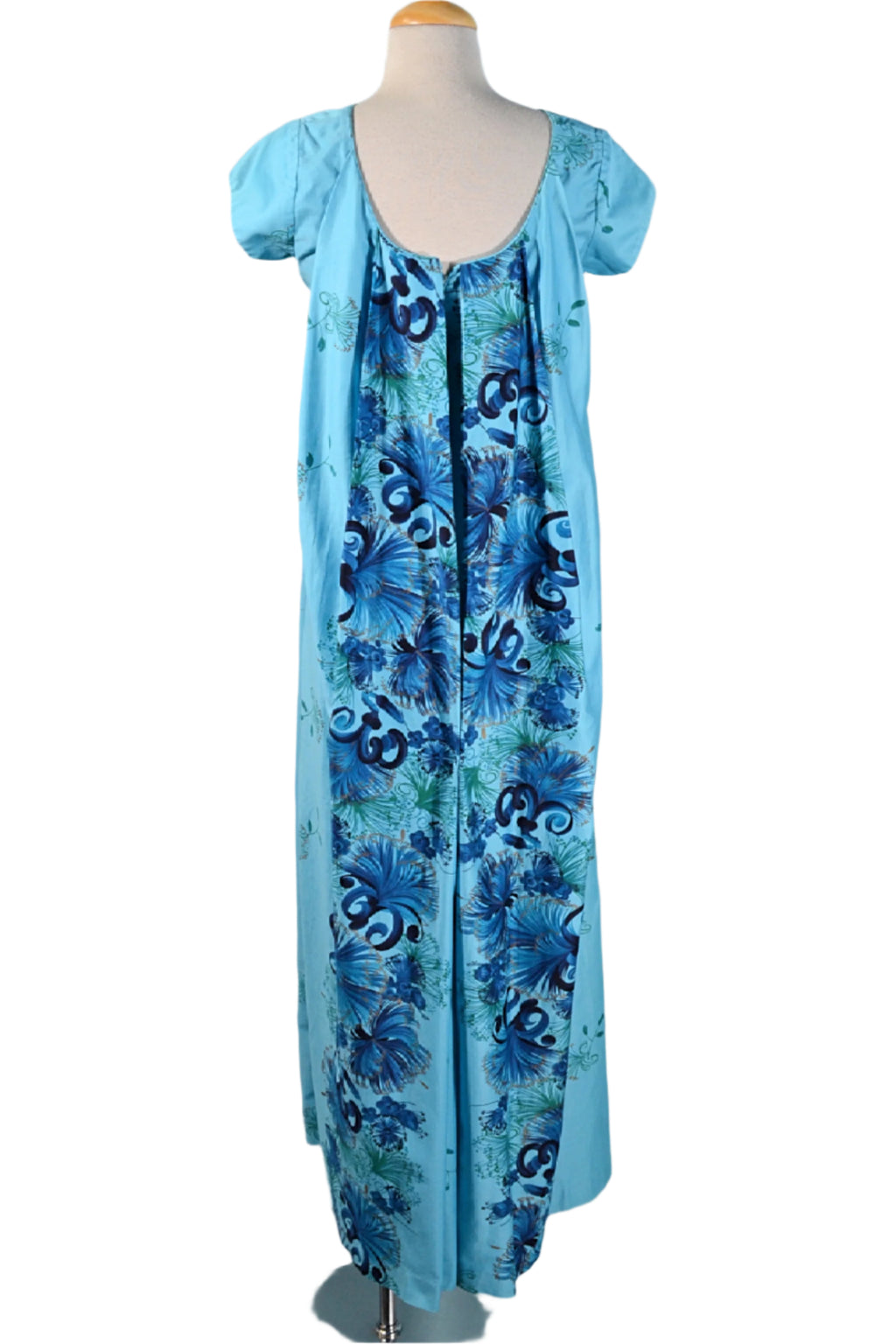 Beautiful vintage 50s Hawaiian muumuu maxi dress with Watteau pleats at the back, and a slit at the front.
