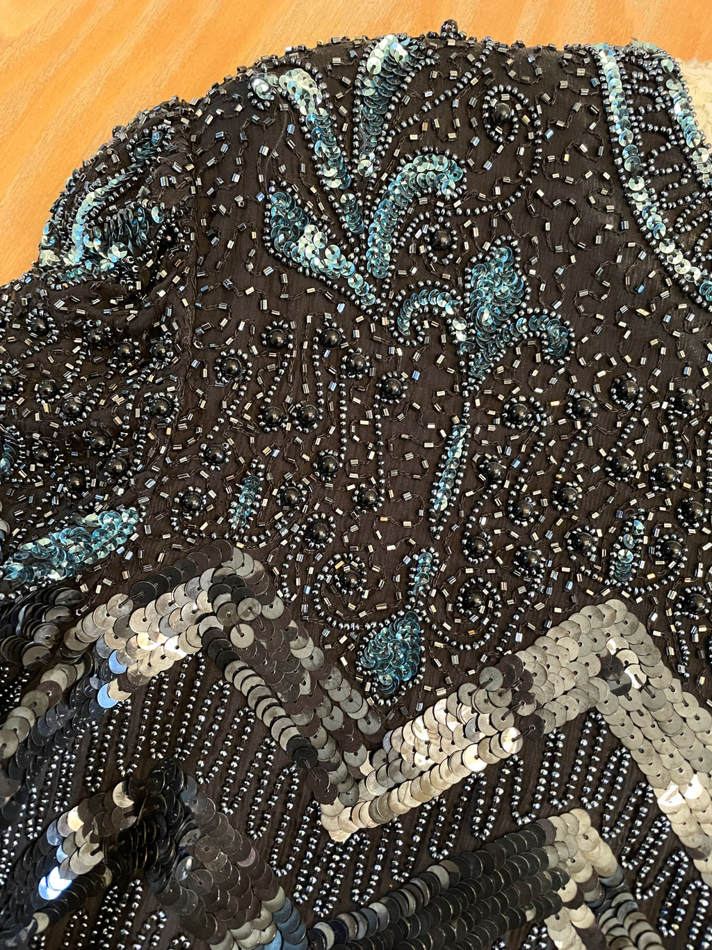 Beads in a zigzag pattern, sequins in a herringbone geometric pattern, blue sequin flowers on top bodice. Hemline & cuffs are zigzag design.