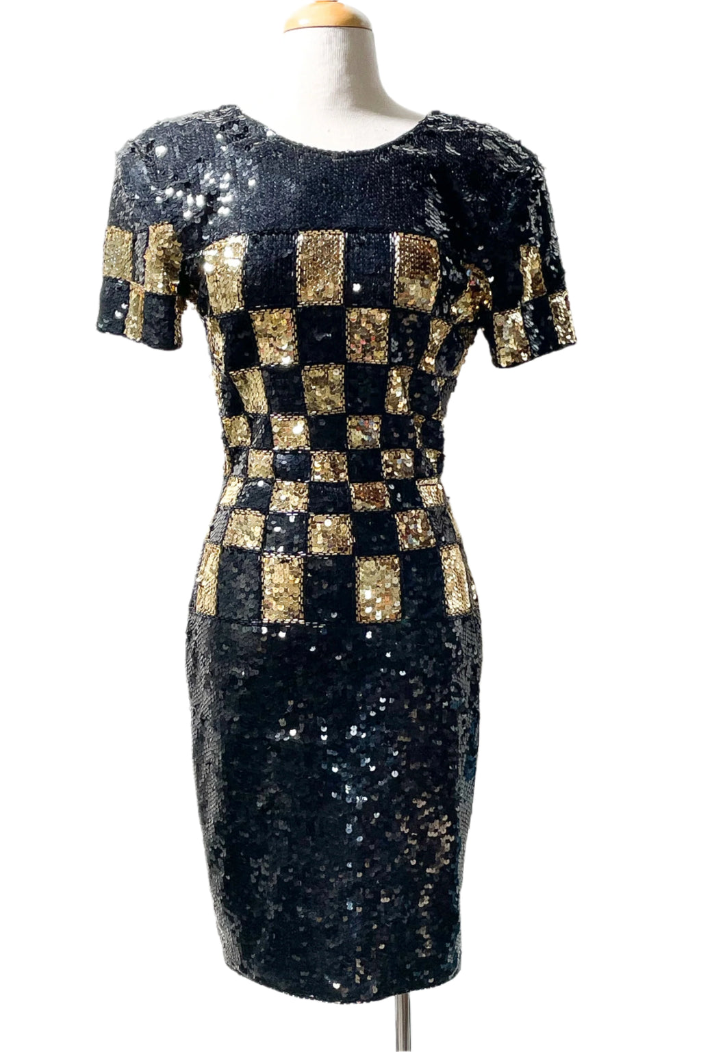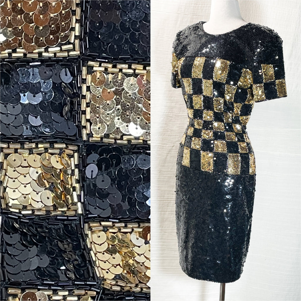 Vintage Tadashi Sexy Black + Gold Sequin Party Dress S/XS