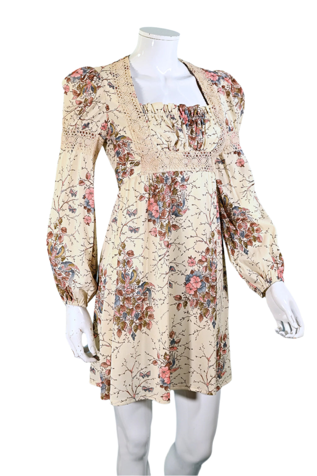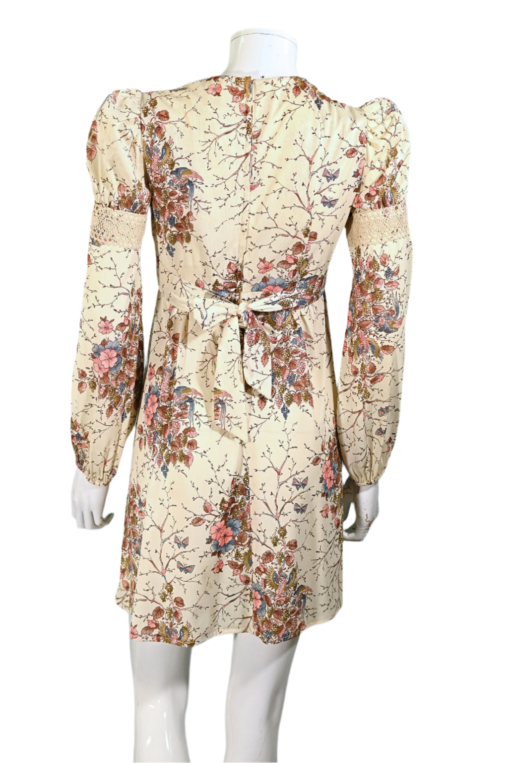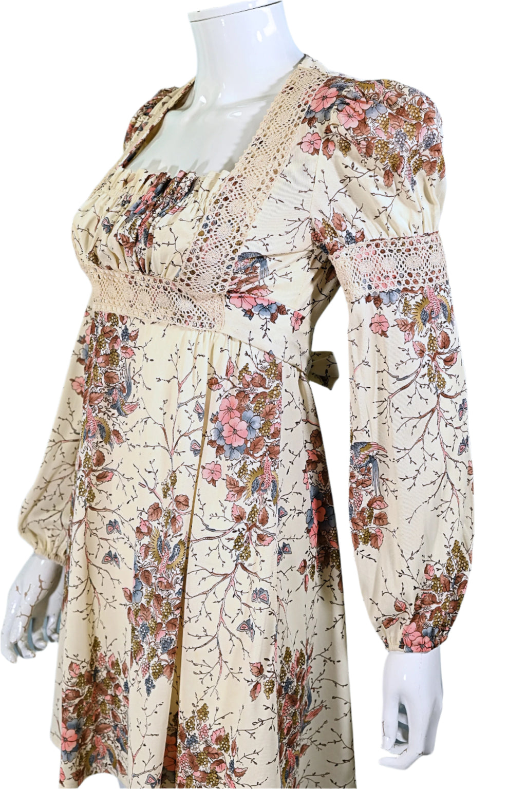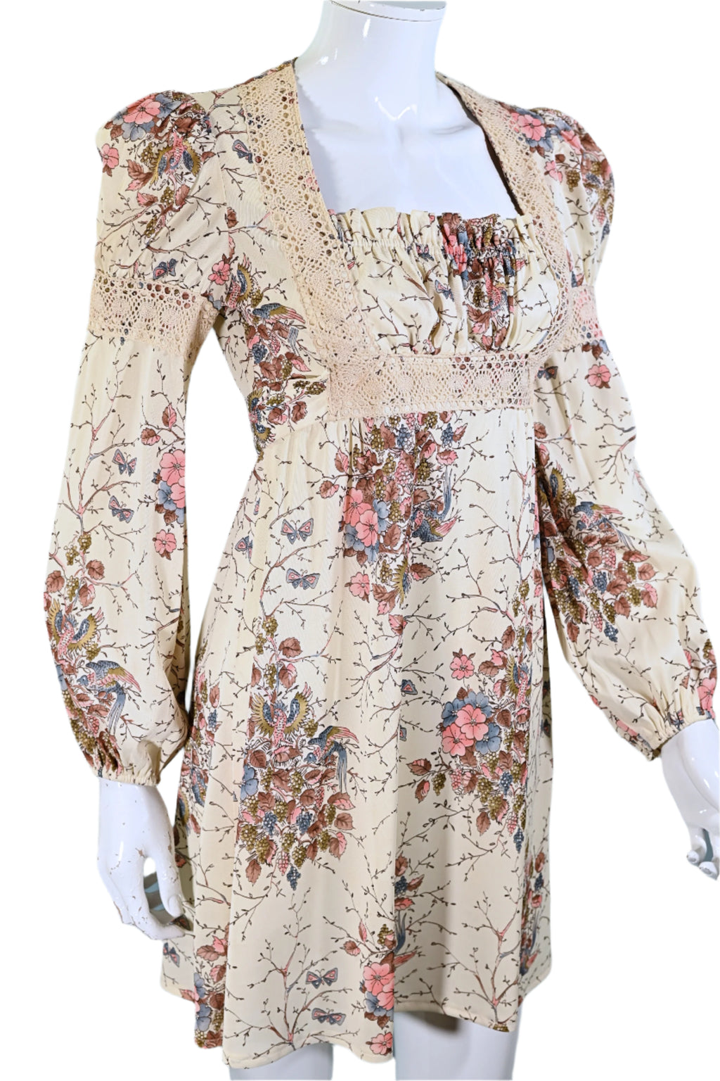 60s Mod Mini Dress, Lace Accent Juliette Sleeve, Flowers/Birds S