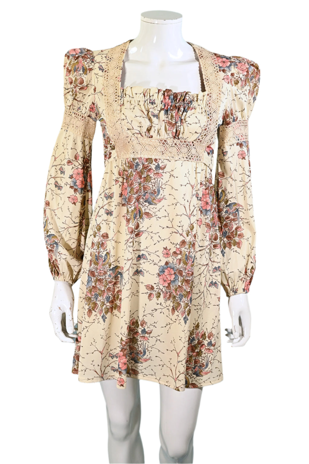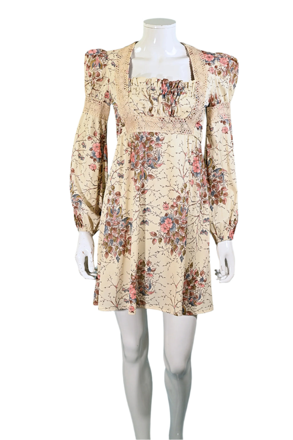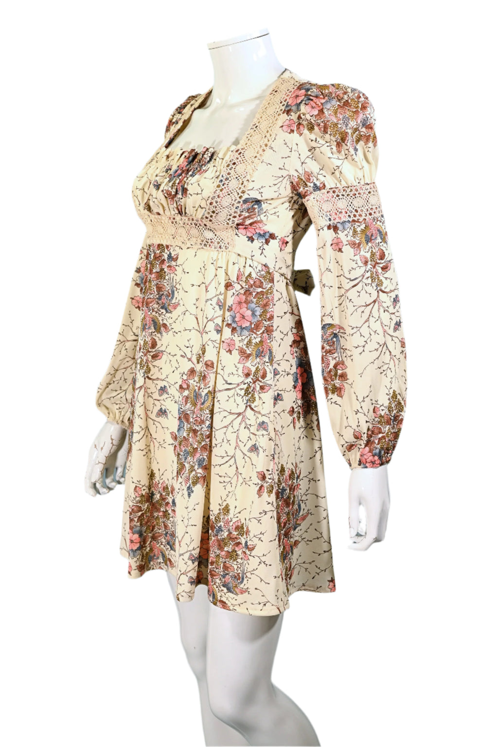 60s Mod Mini Dress, Lace Accent Juliette Sleeve, Flowers/Birds S
