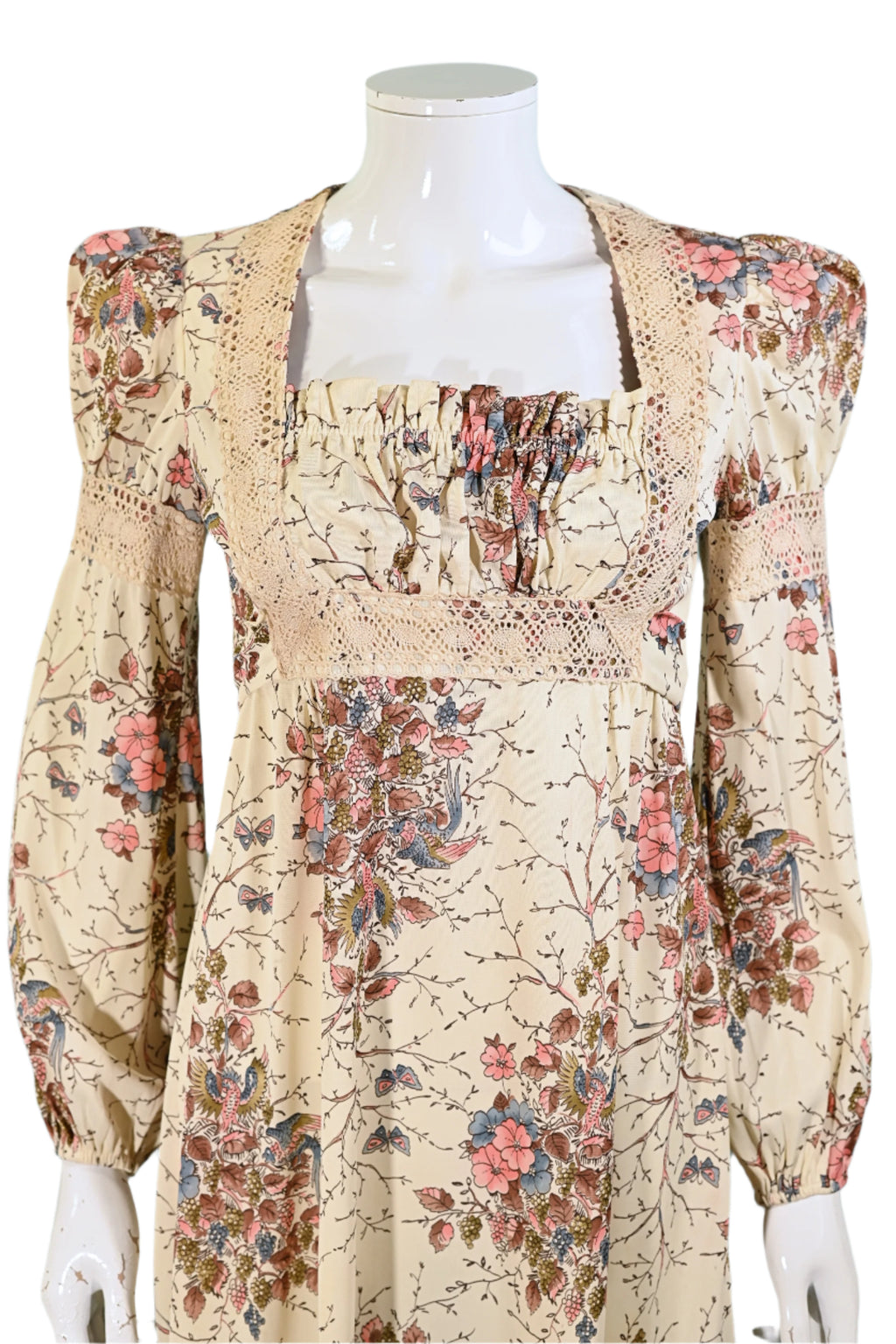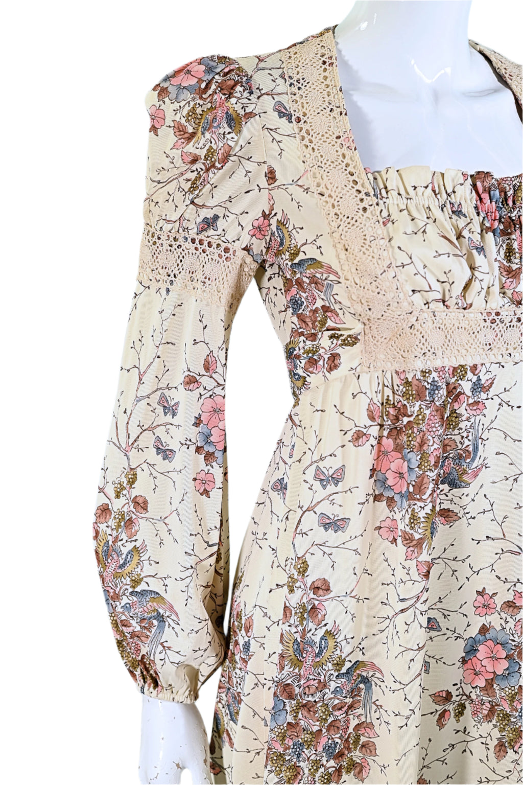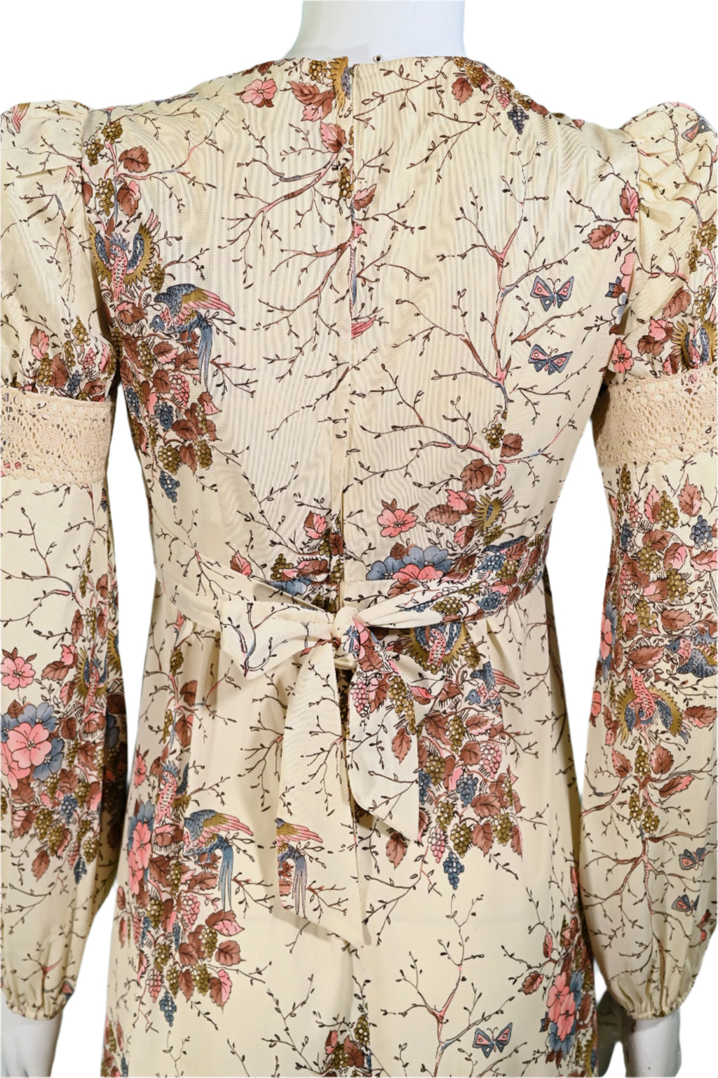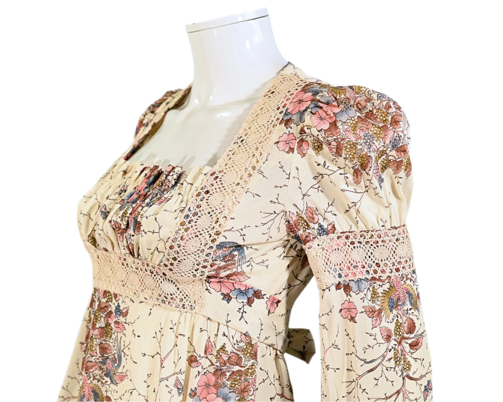 60s Mod Mini Dress, Lace Accent Juliette Sleeve, Flowers/Birds S