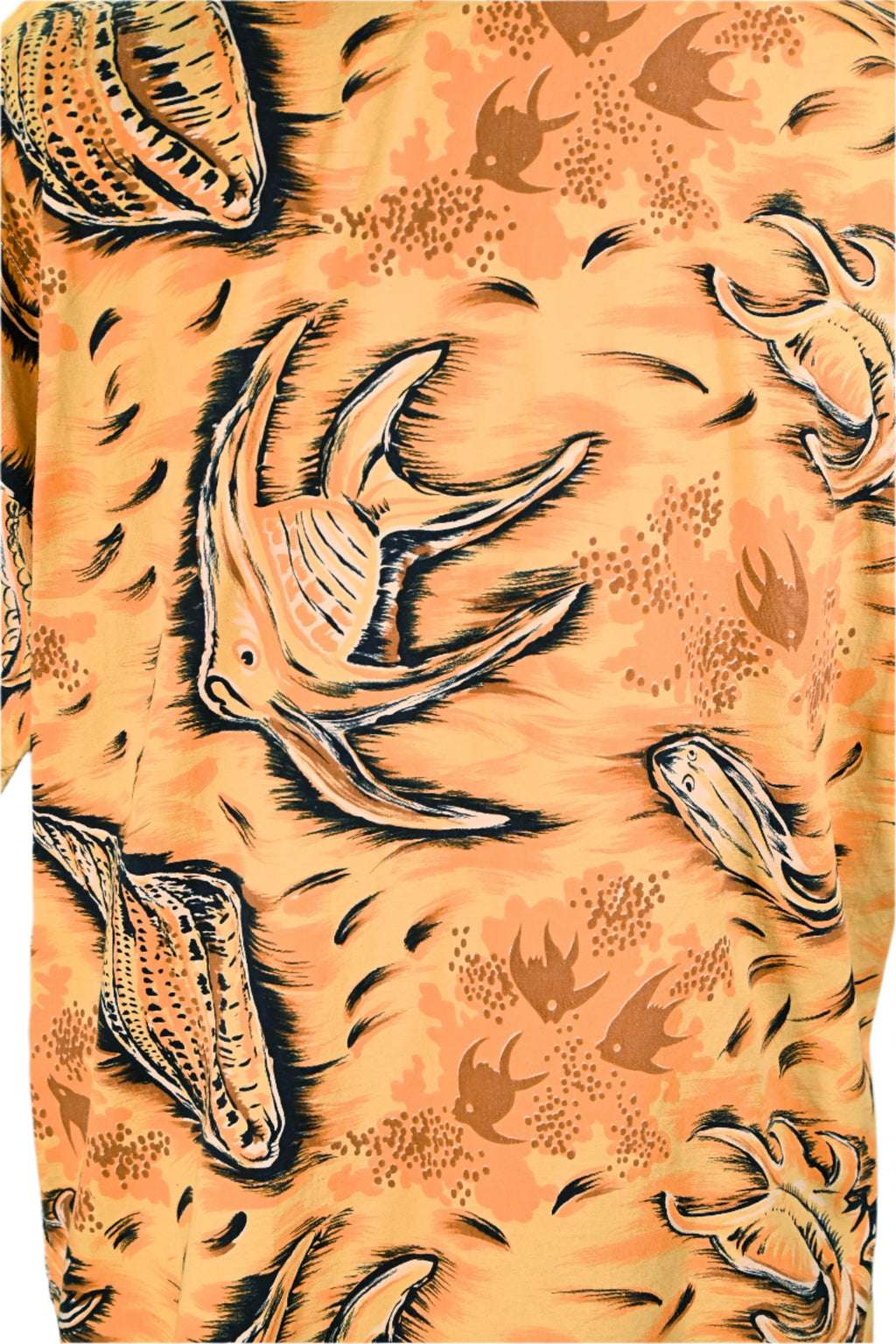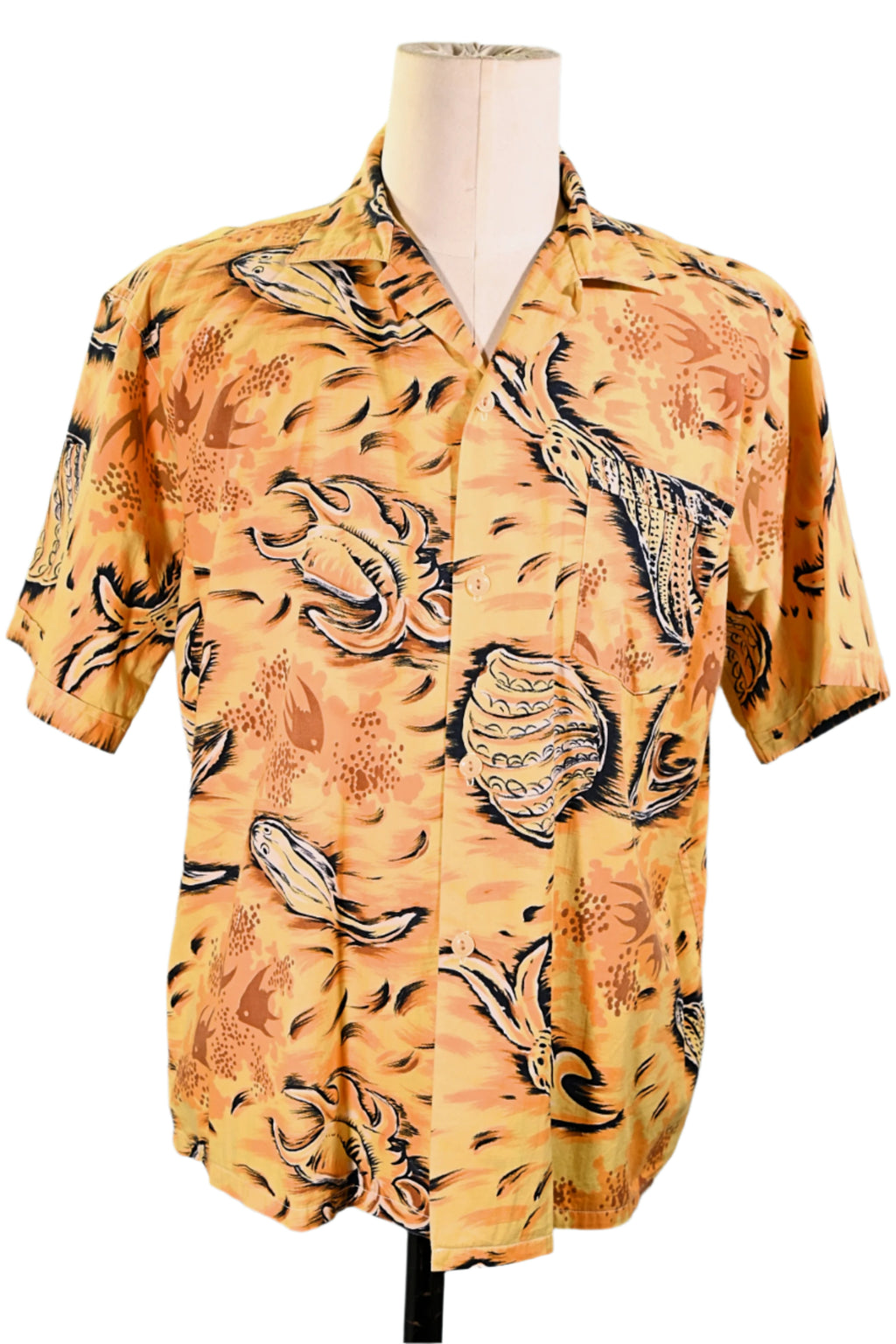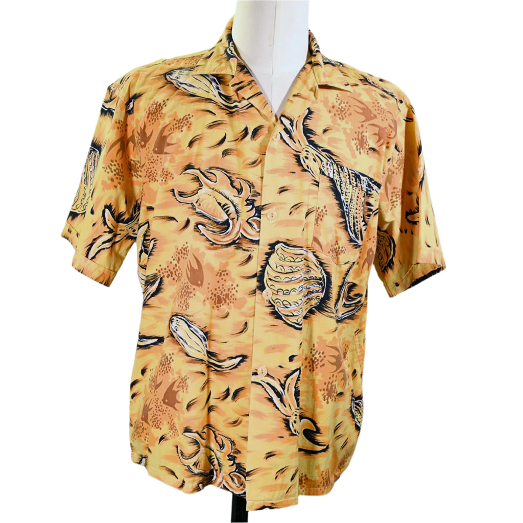 1950s cotton Aloha shirt with fish and seashell underwater scene.