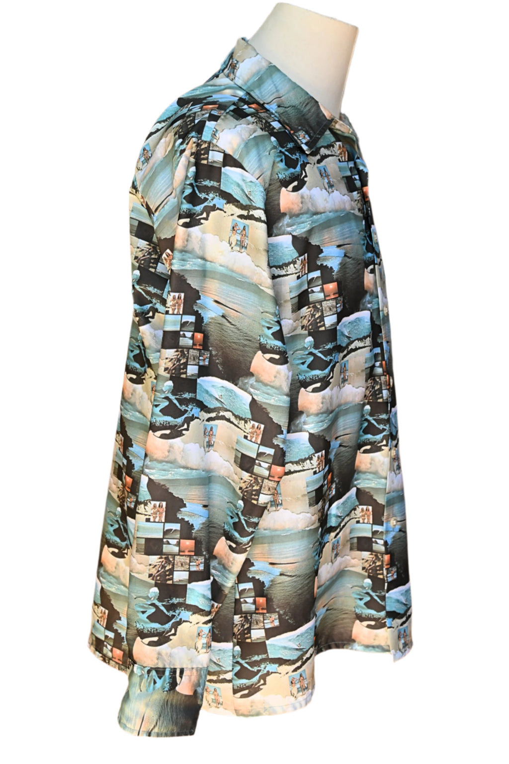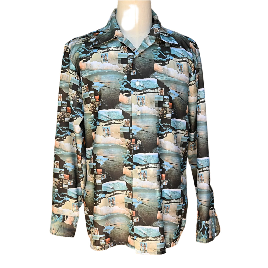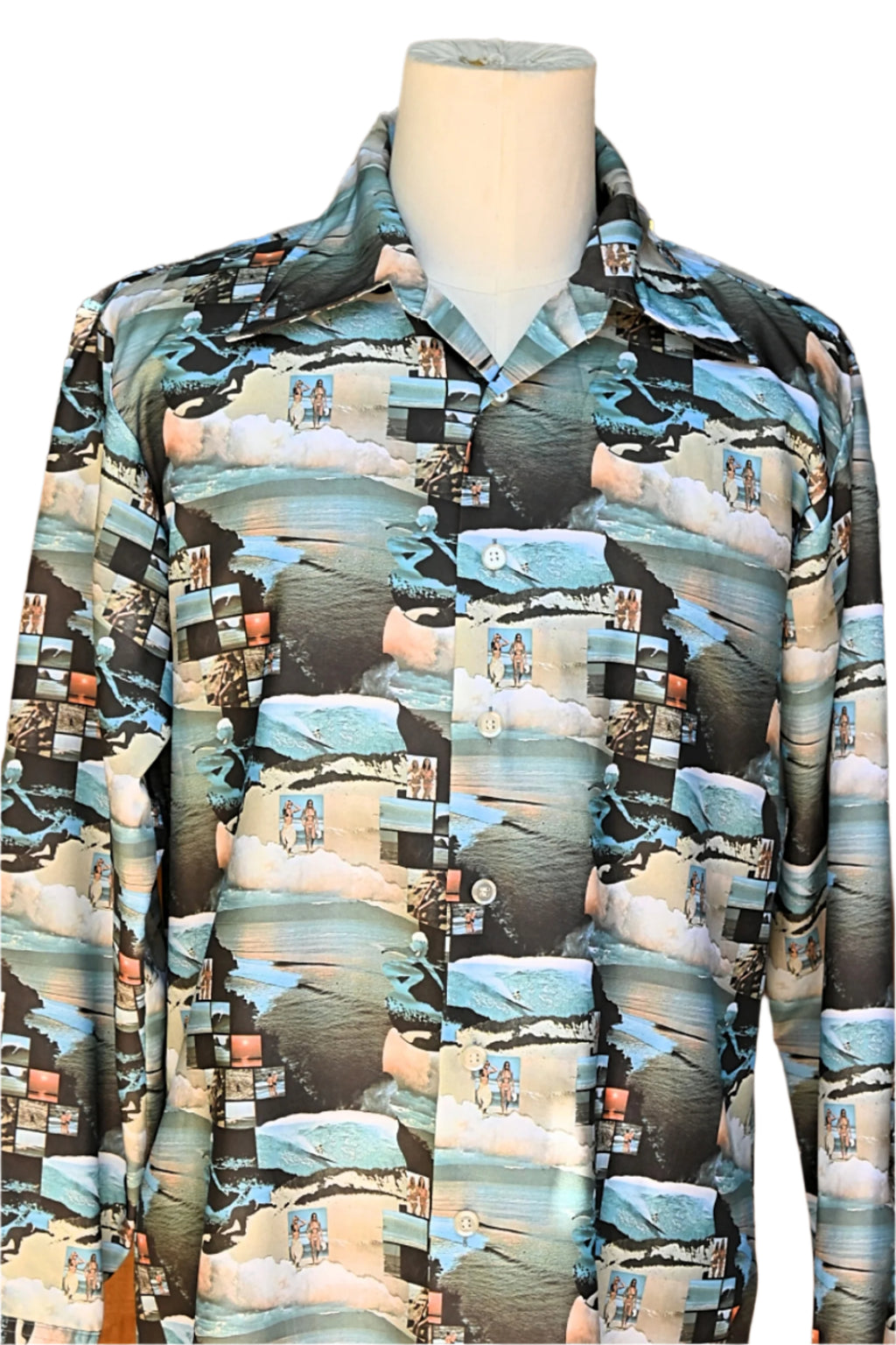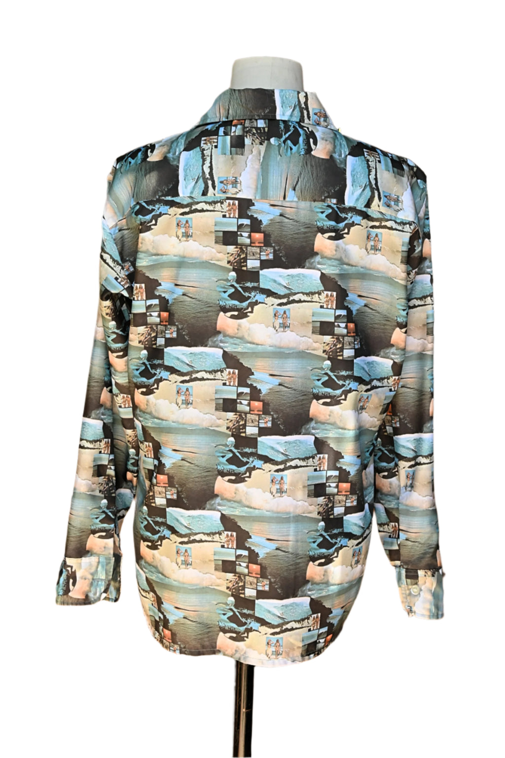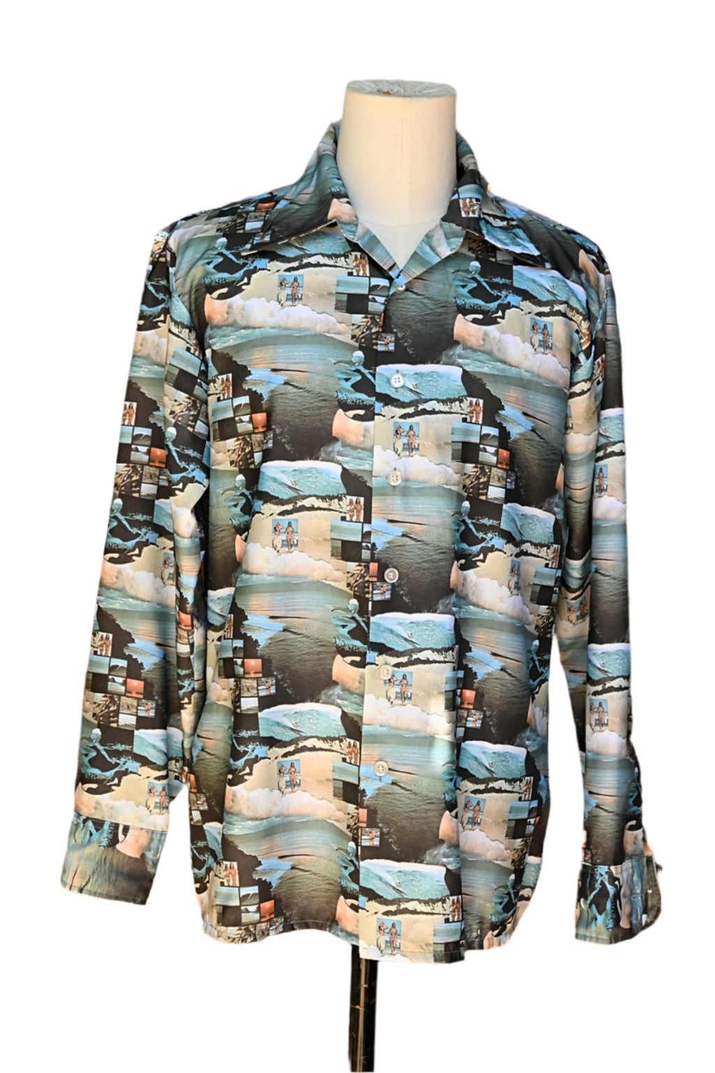 Repeating all over pattern, polyester shirt. Long sleeves.