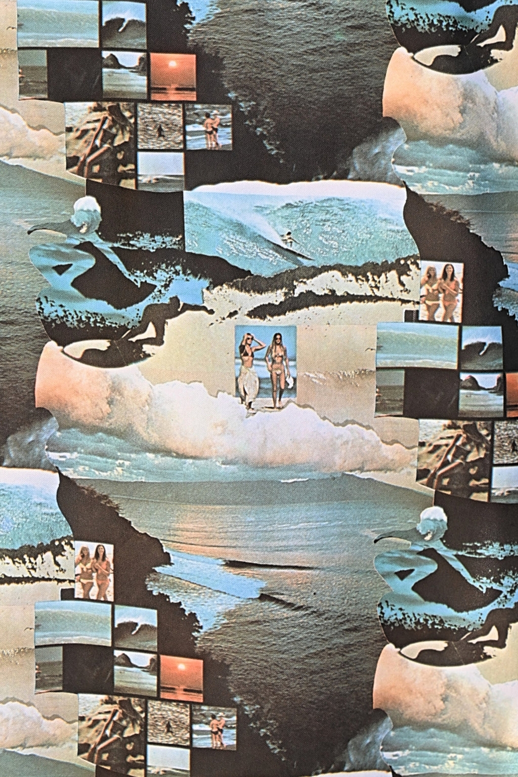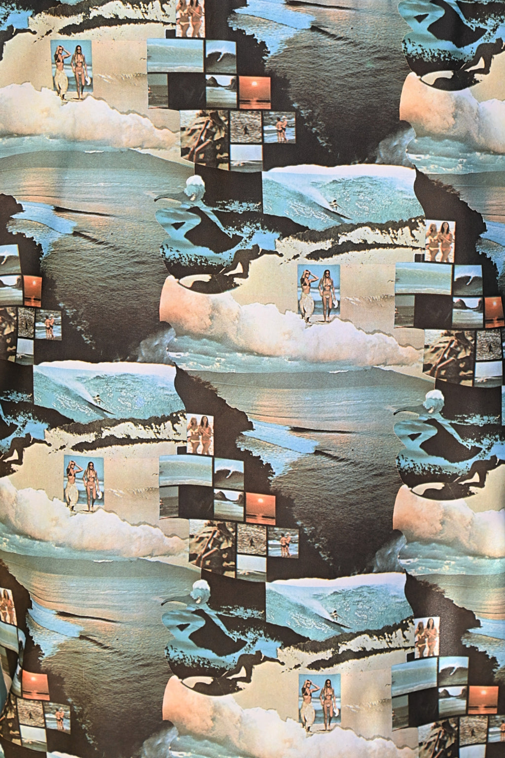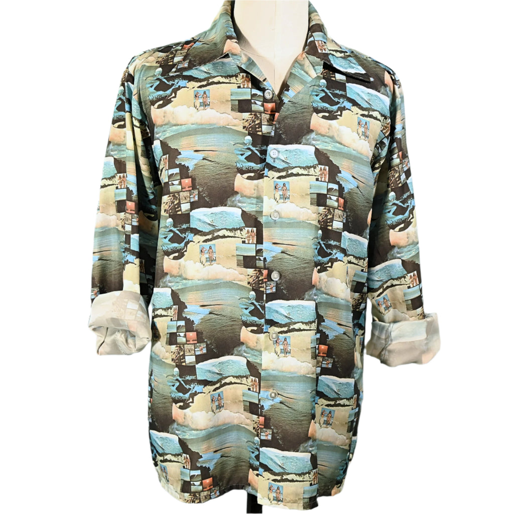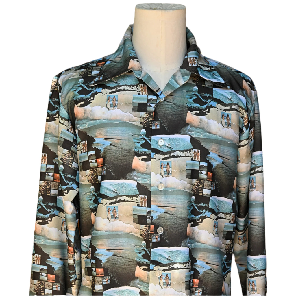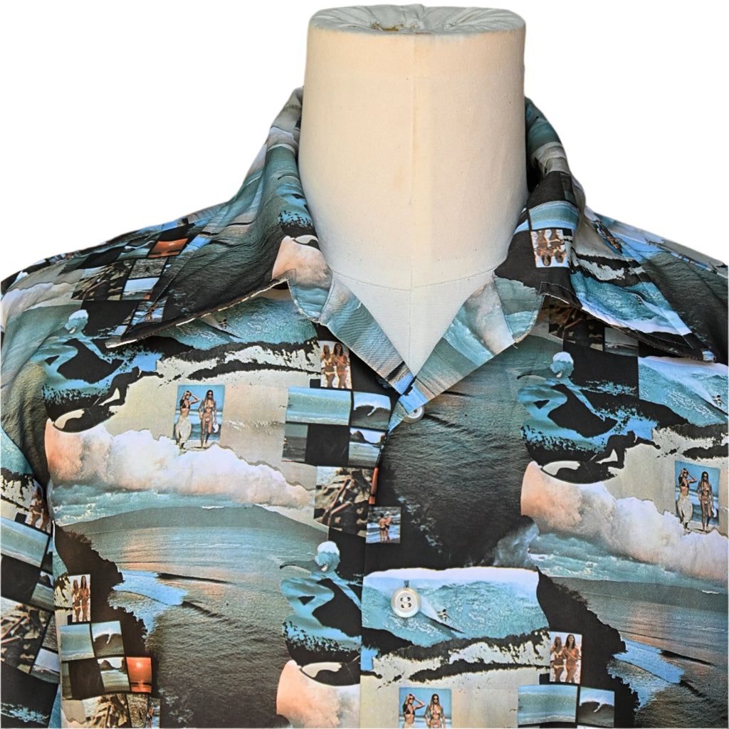Vintage 70s photo image shirt with beach, surfers & beach bunnies.
