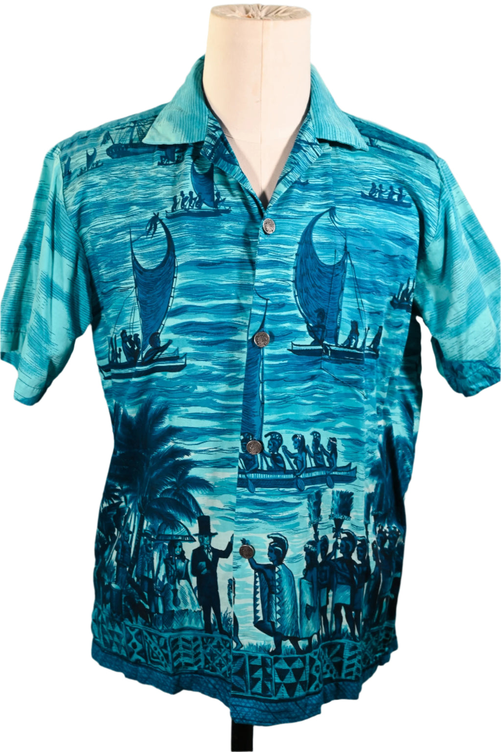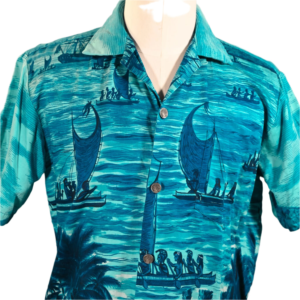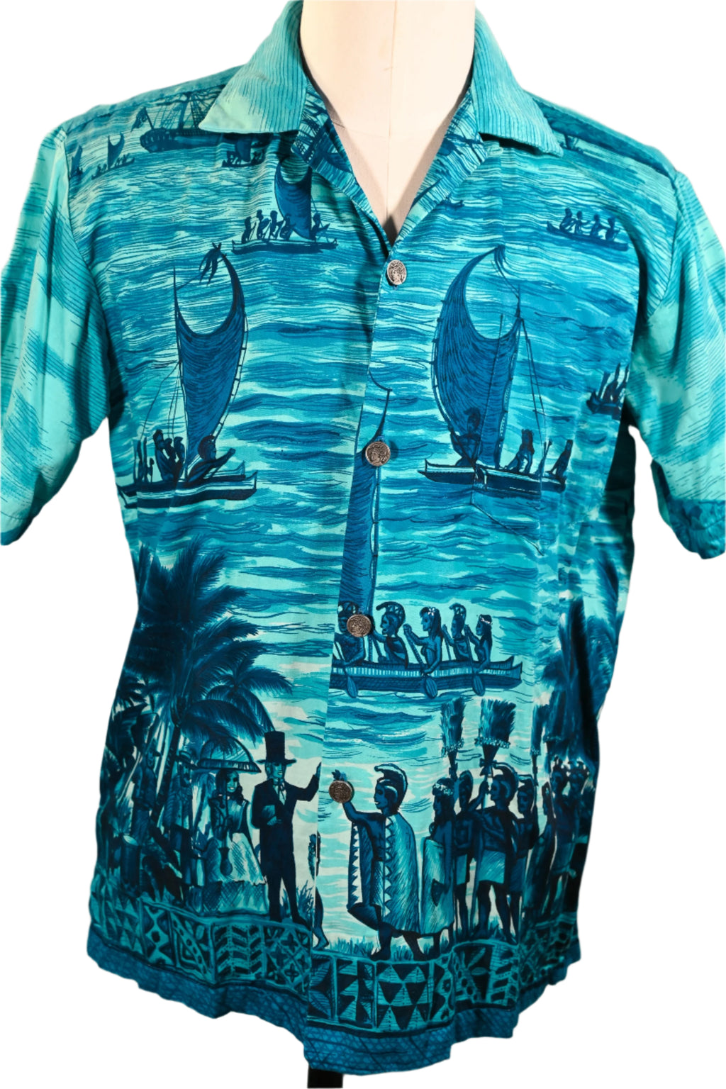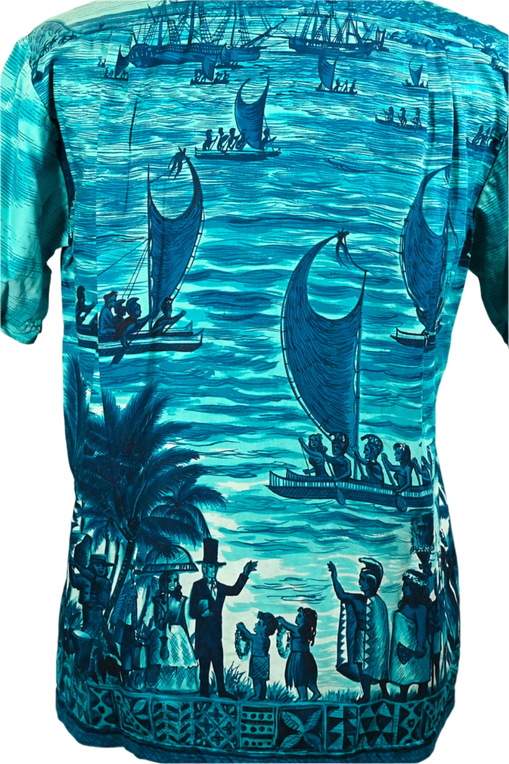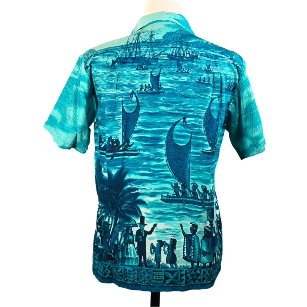 Vintage 60s Polynesian Bazaar shirt featuring early settlers and island natives greeting one another and exchanging gifts.