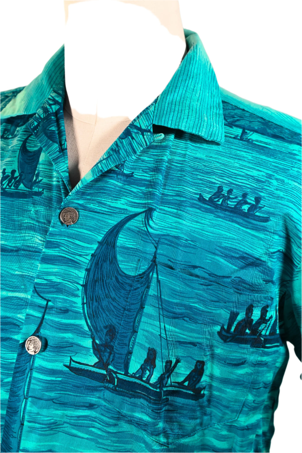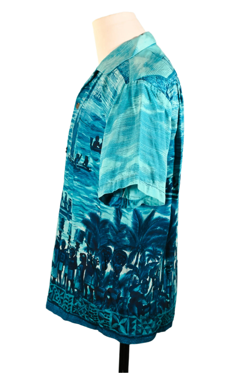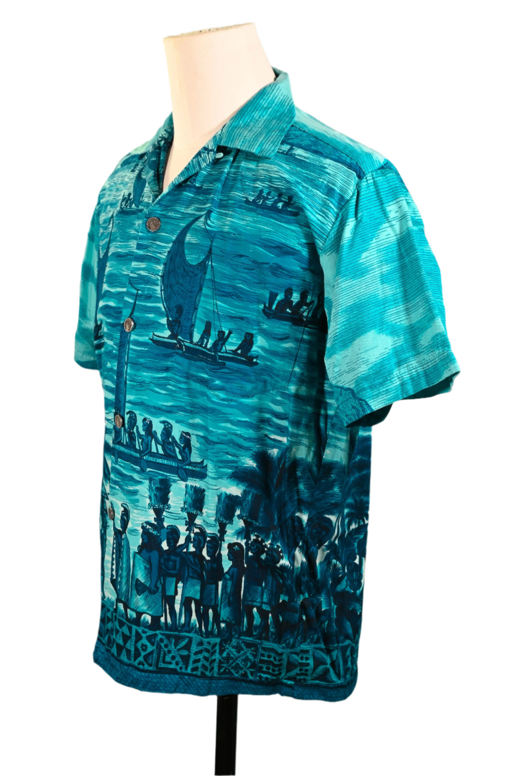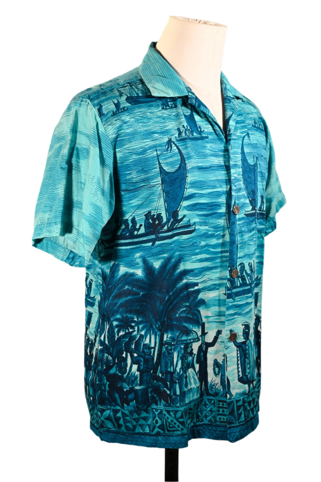 Vintage 60s Polynesian Bazaar shirt featuring early settlers and island natives greeting one another and exchanging gifts.
