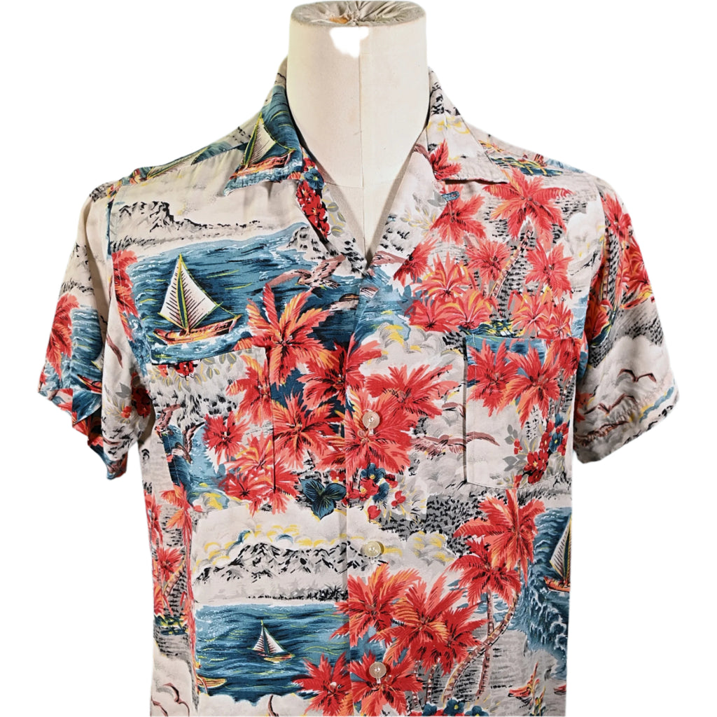 Made in Japan Aloha shirt with mountains, ocean, boats, palm trees.