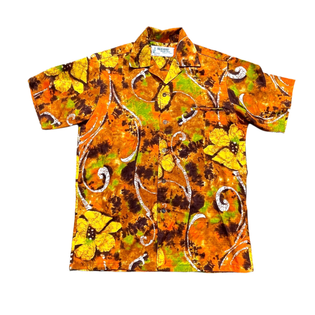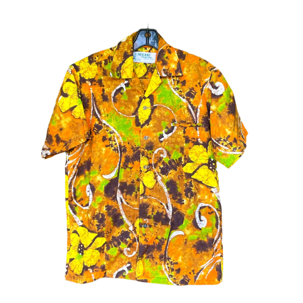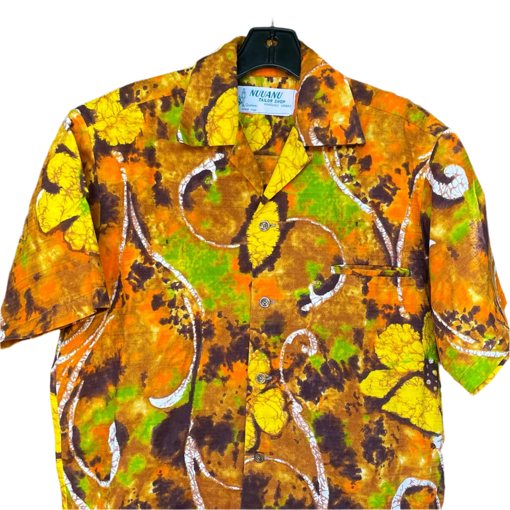 Vintage 70s Batik Hawaiian Shirt, Bright Barkcloth Aloha Shirt, Nuuanu Tailor Shop M