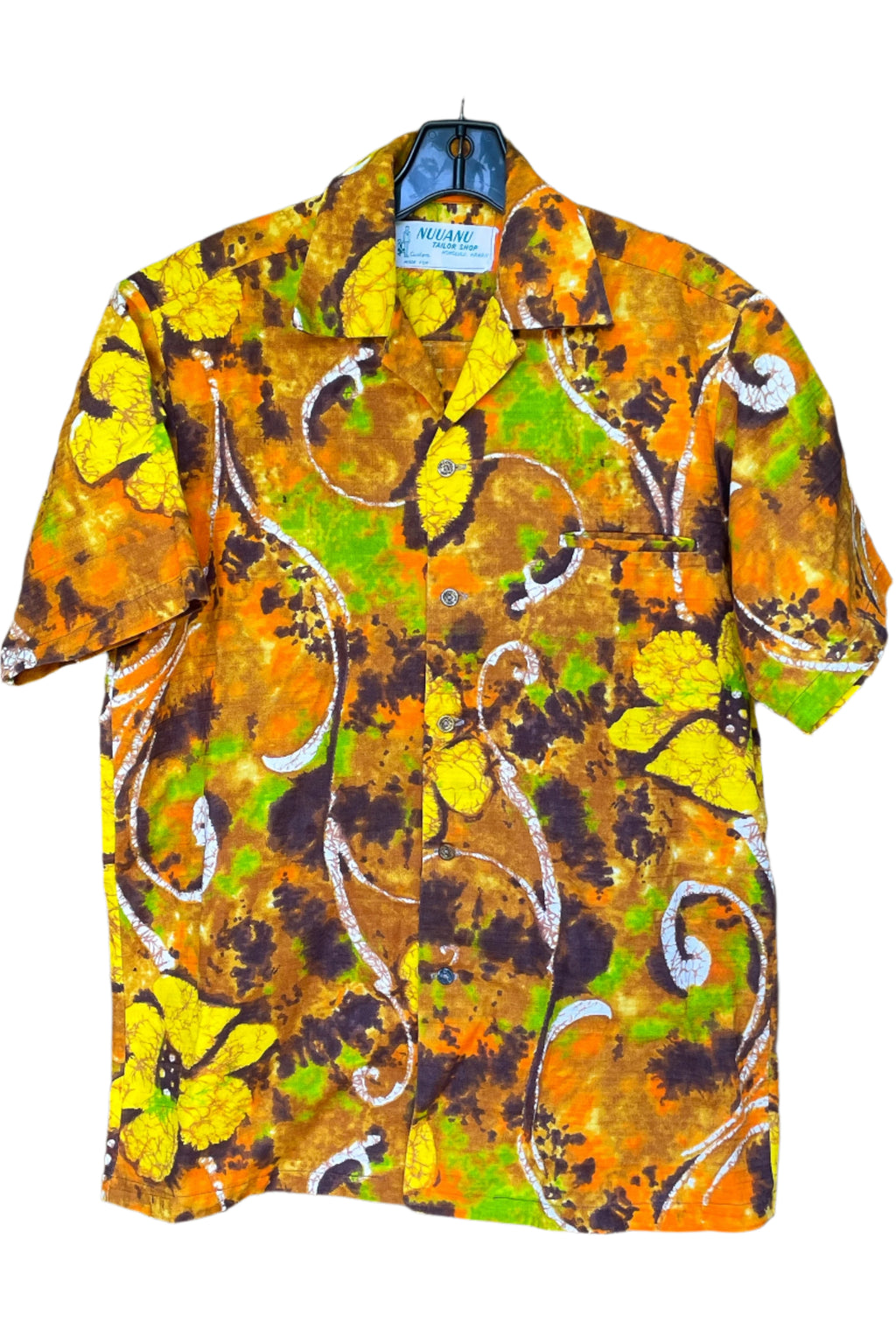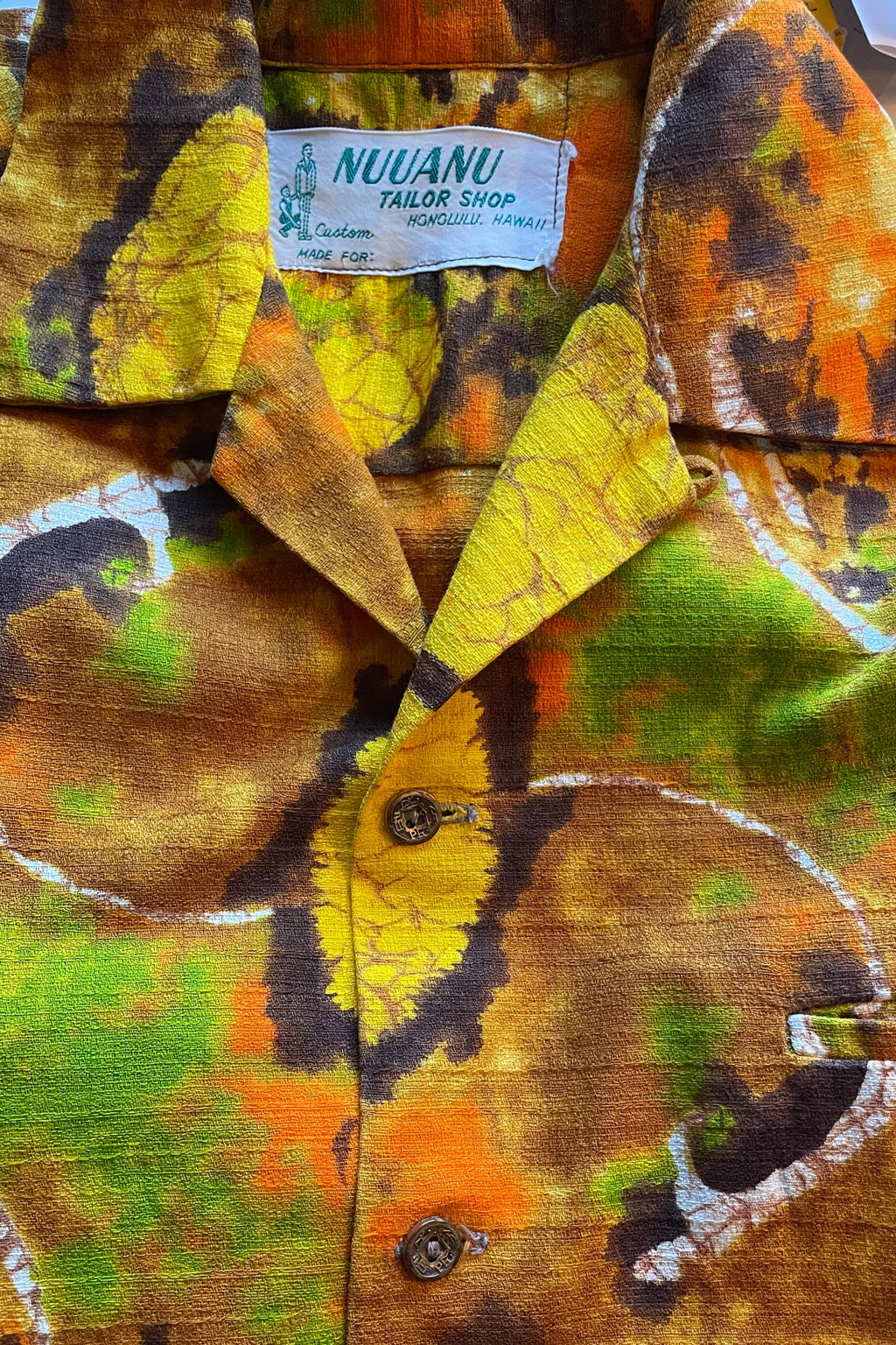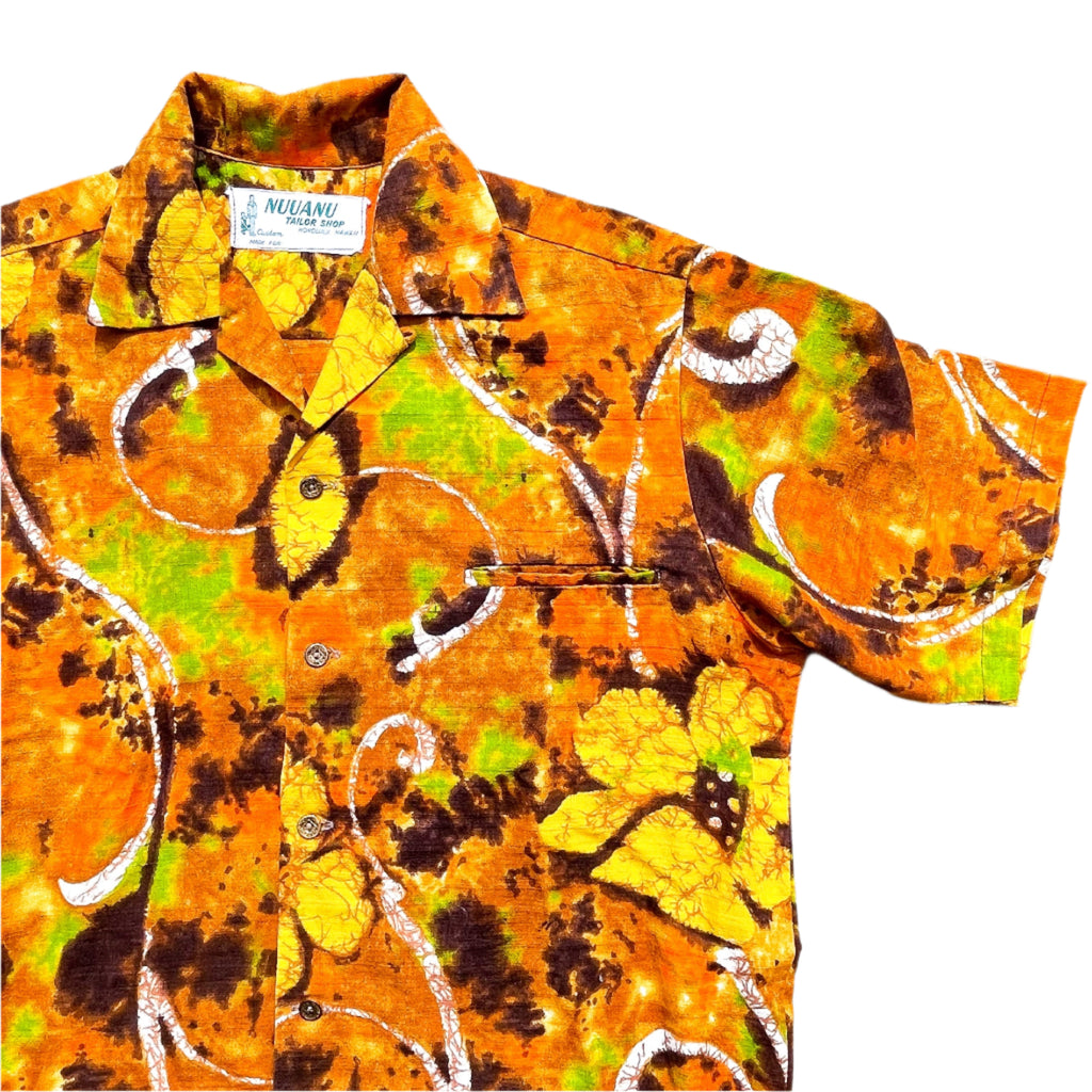 Vintage 70s Batik Hawaiian Shirt, Bright Barkcloth Aloha Shirt, Nuuanu Tailor Shop M