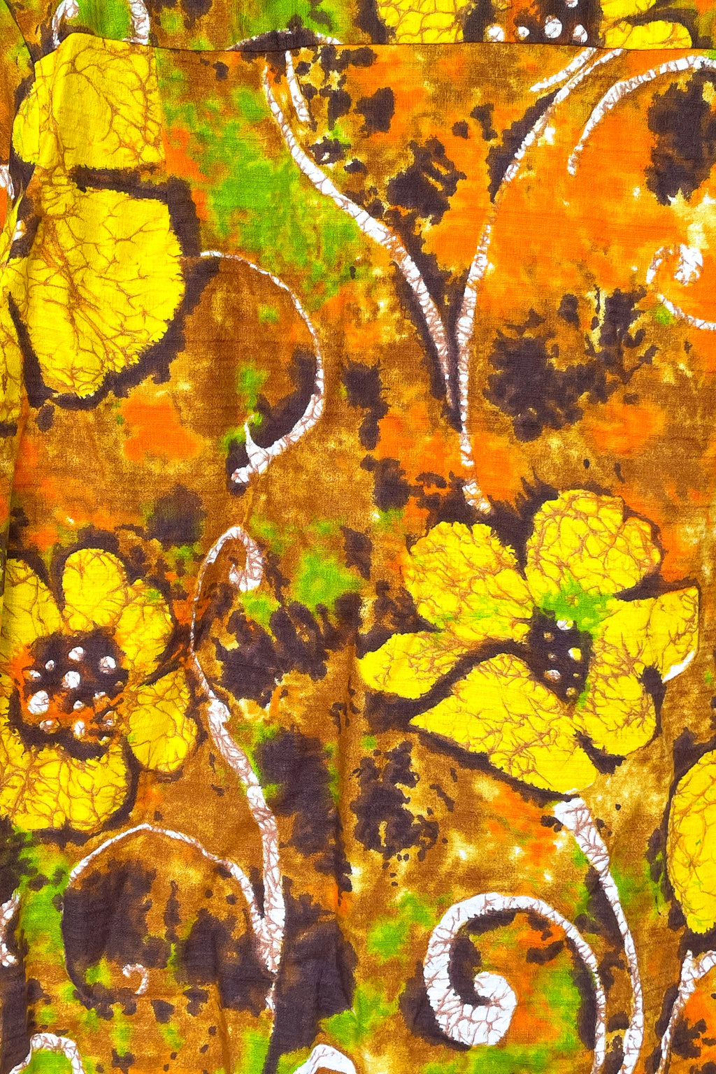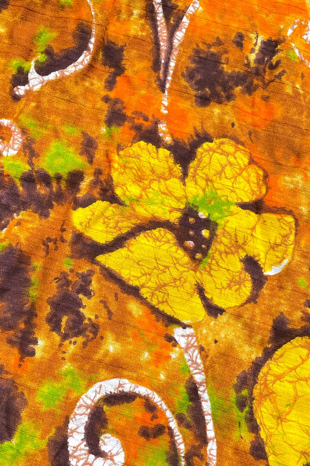 The pattern looks like watercolor Batik, Yellow, orange, brown, green, white.