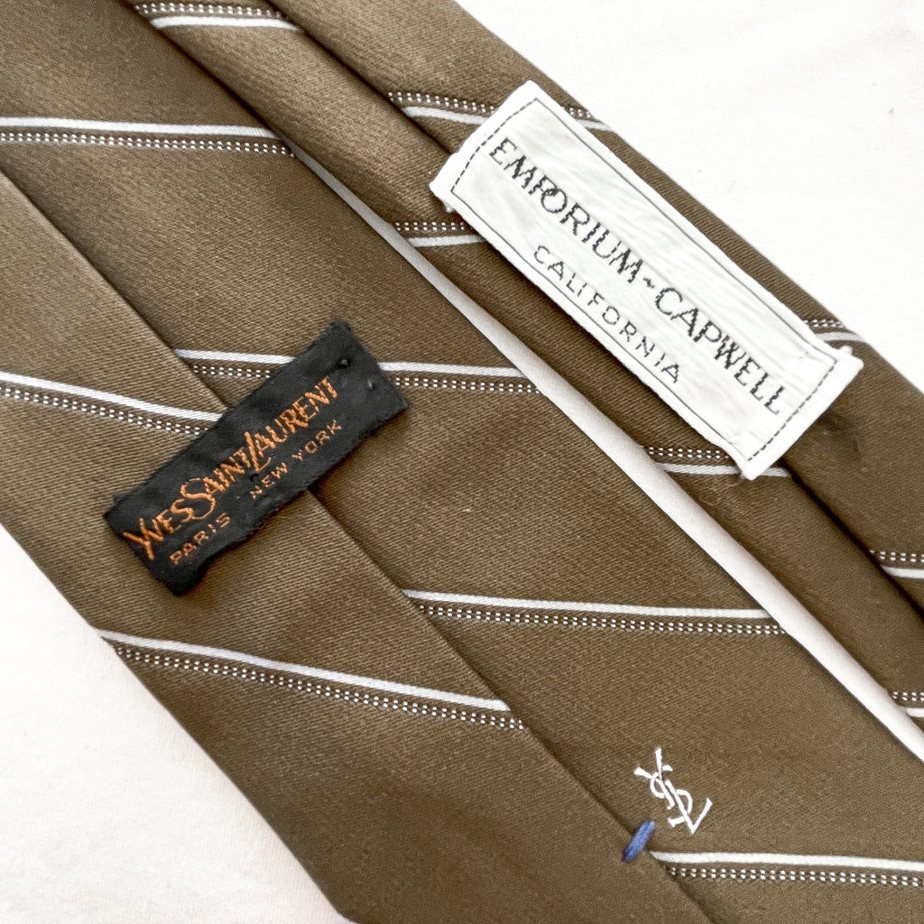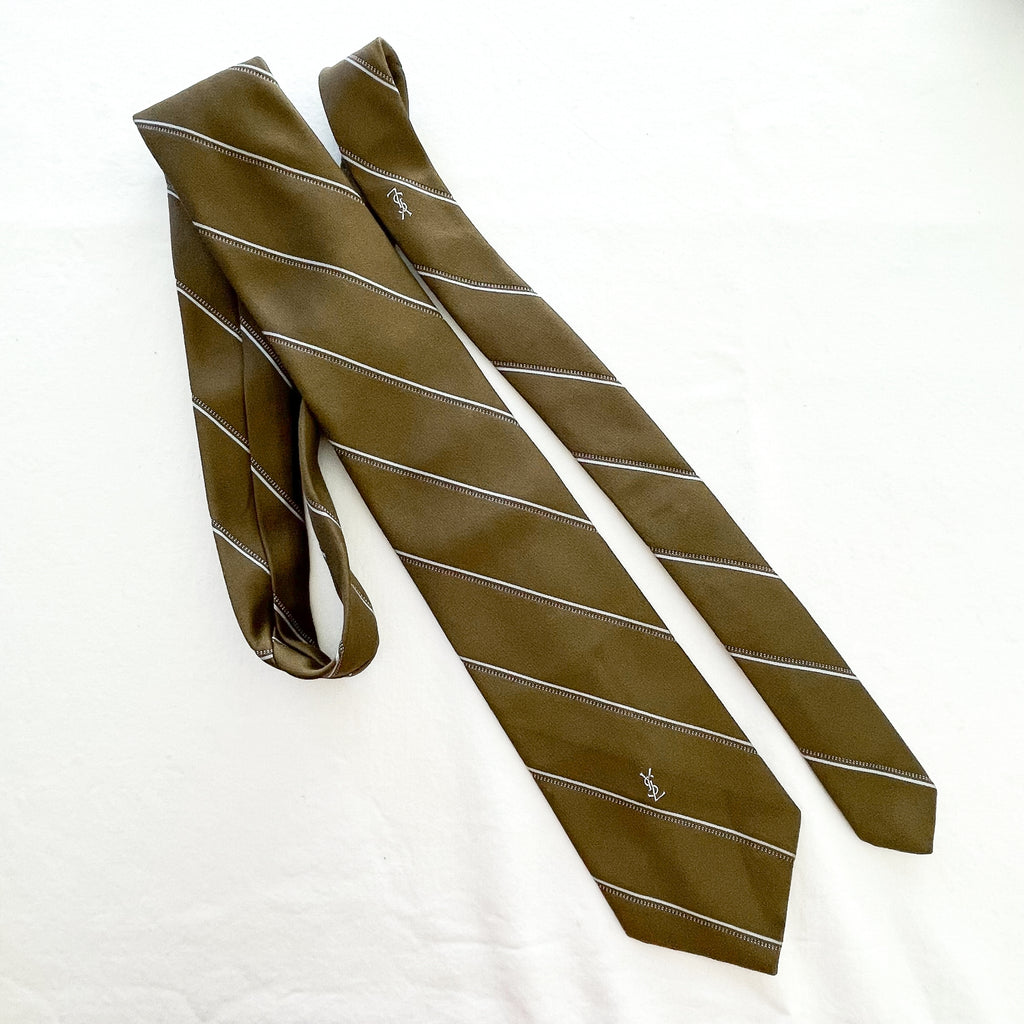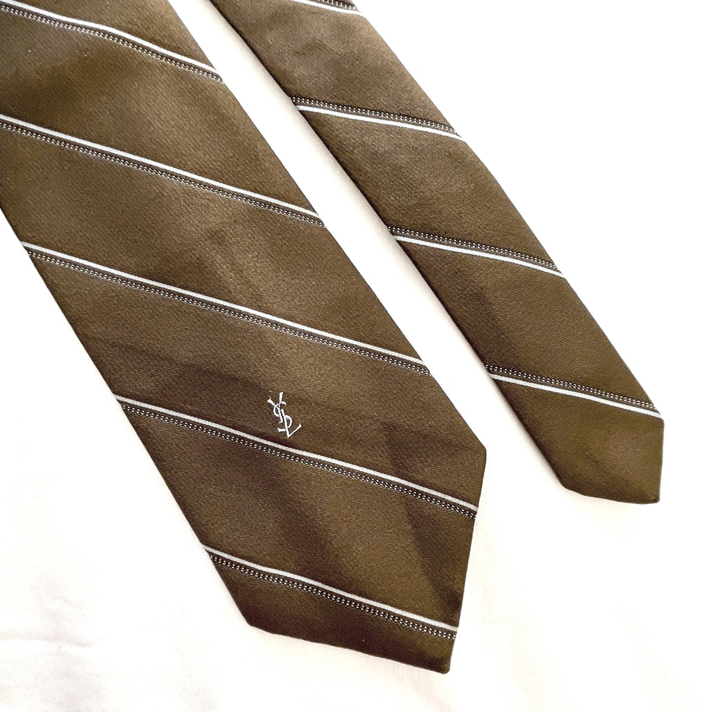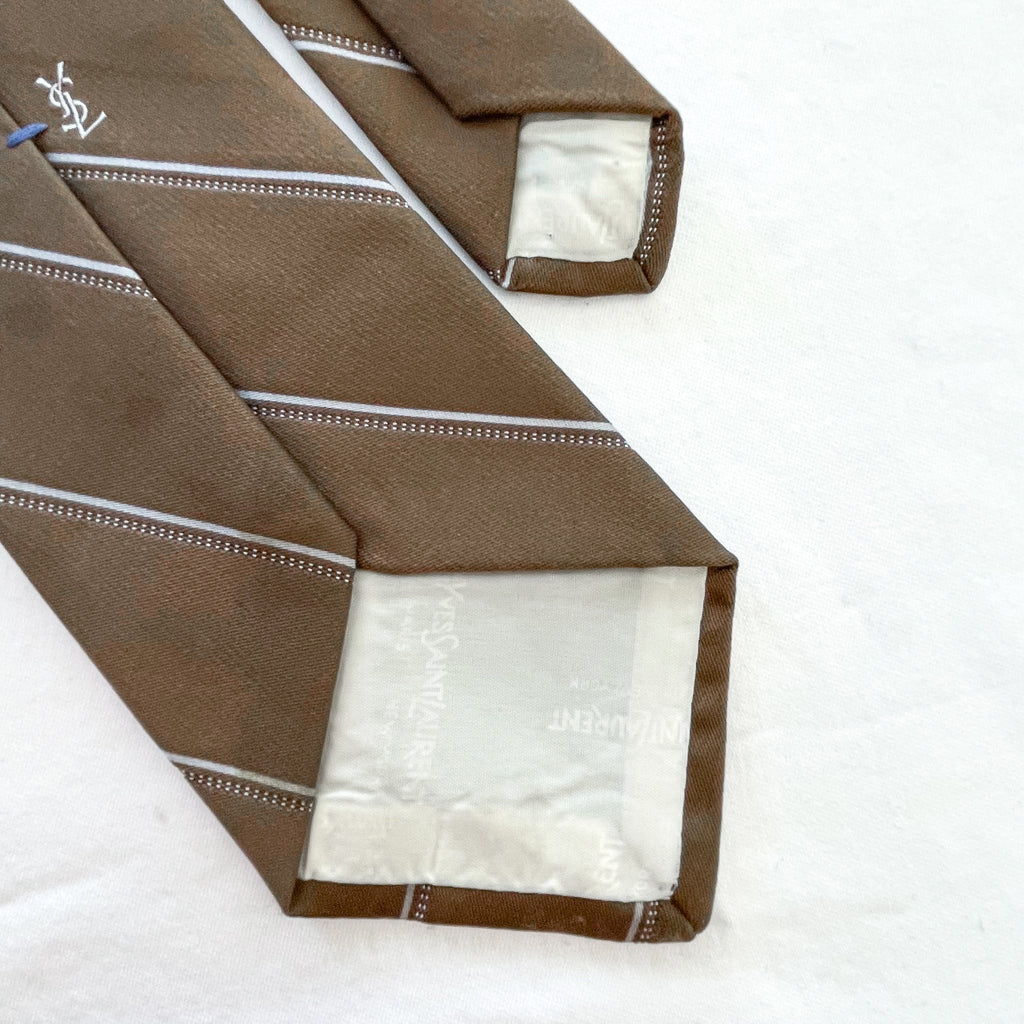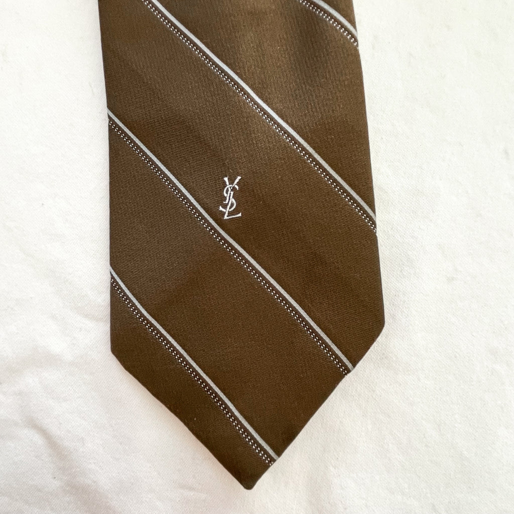 Vintage YSL brown diagonal striped tie and signature initials YSL. More traditional style.
