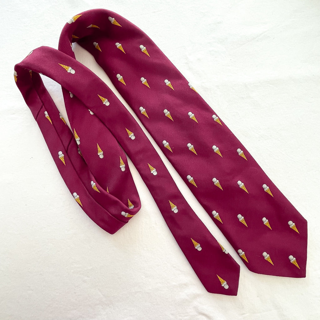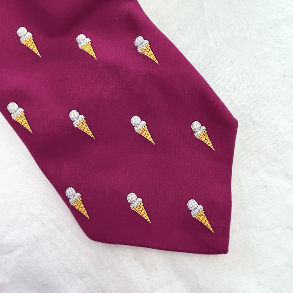 Deep red background, woven pattern of ice cream cones.