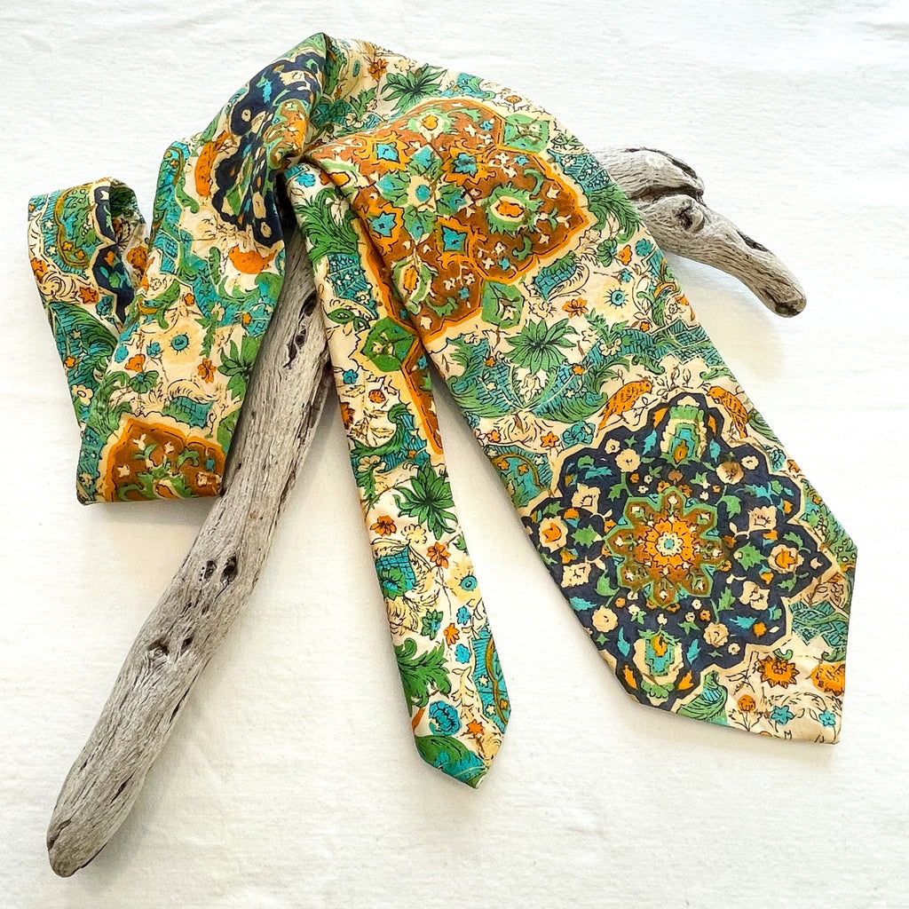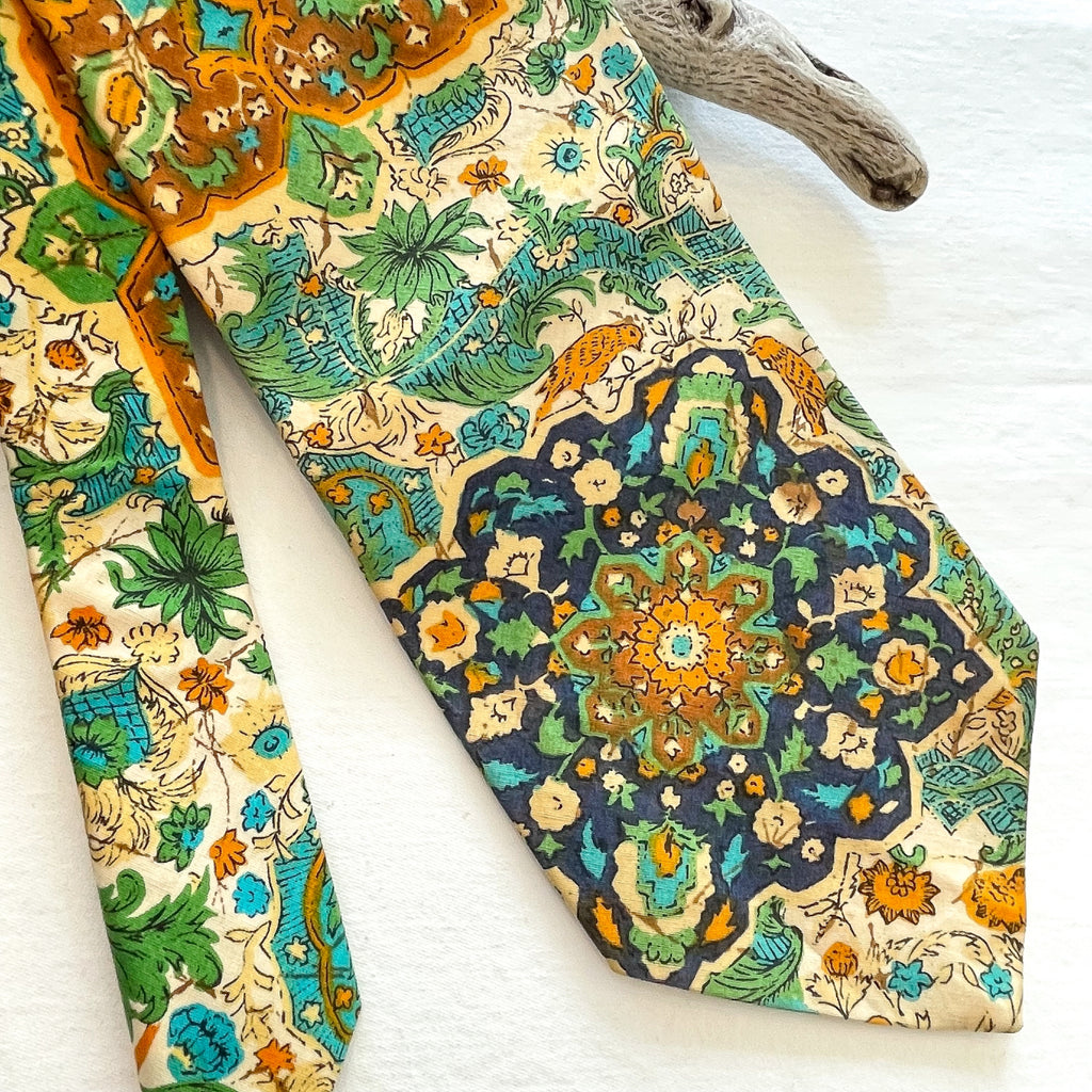 Beautiful colorful tie with tropical style graphics including birds, batik style print. Cream ground, navy, green, caramel, yellow.