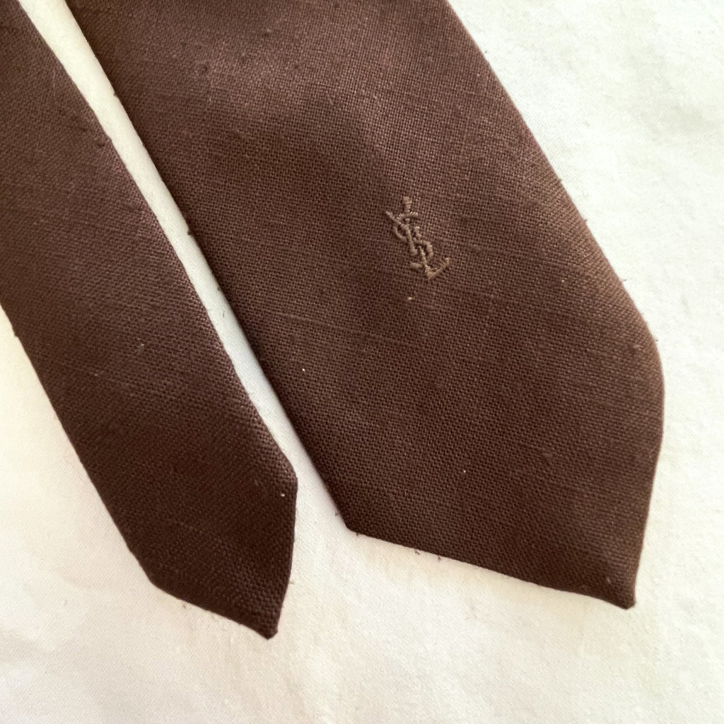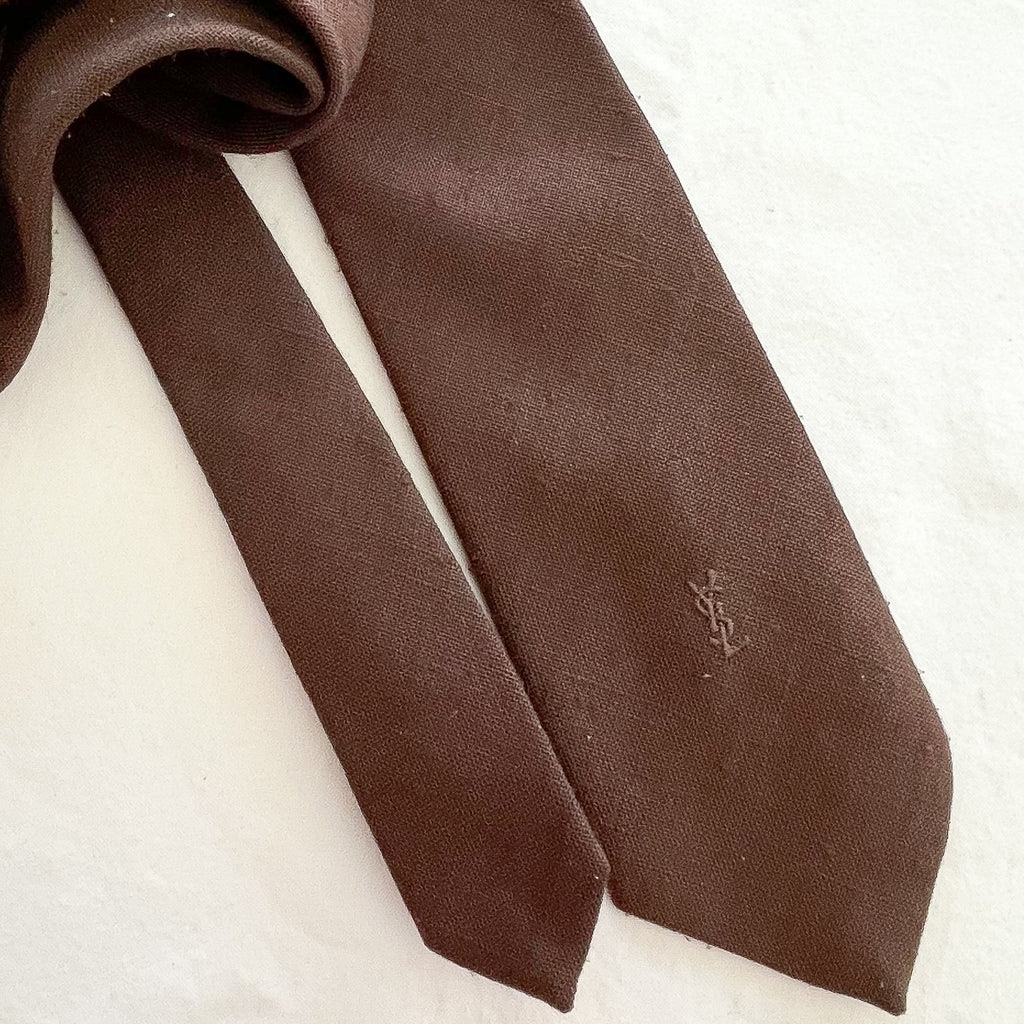 Vintage YSL brown linen necktie. Nubby linen, matching YSL logo embroidered on the front.