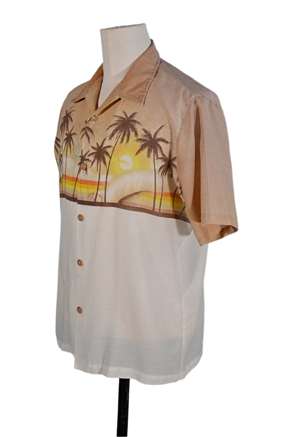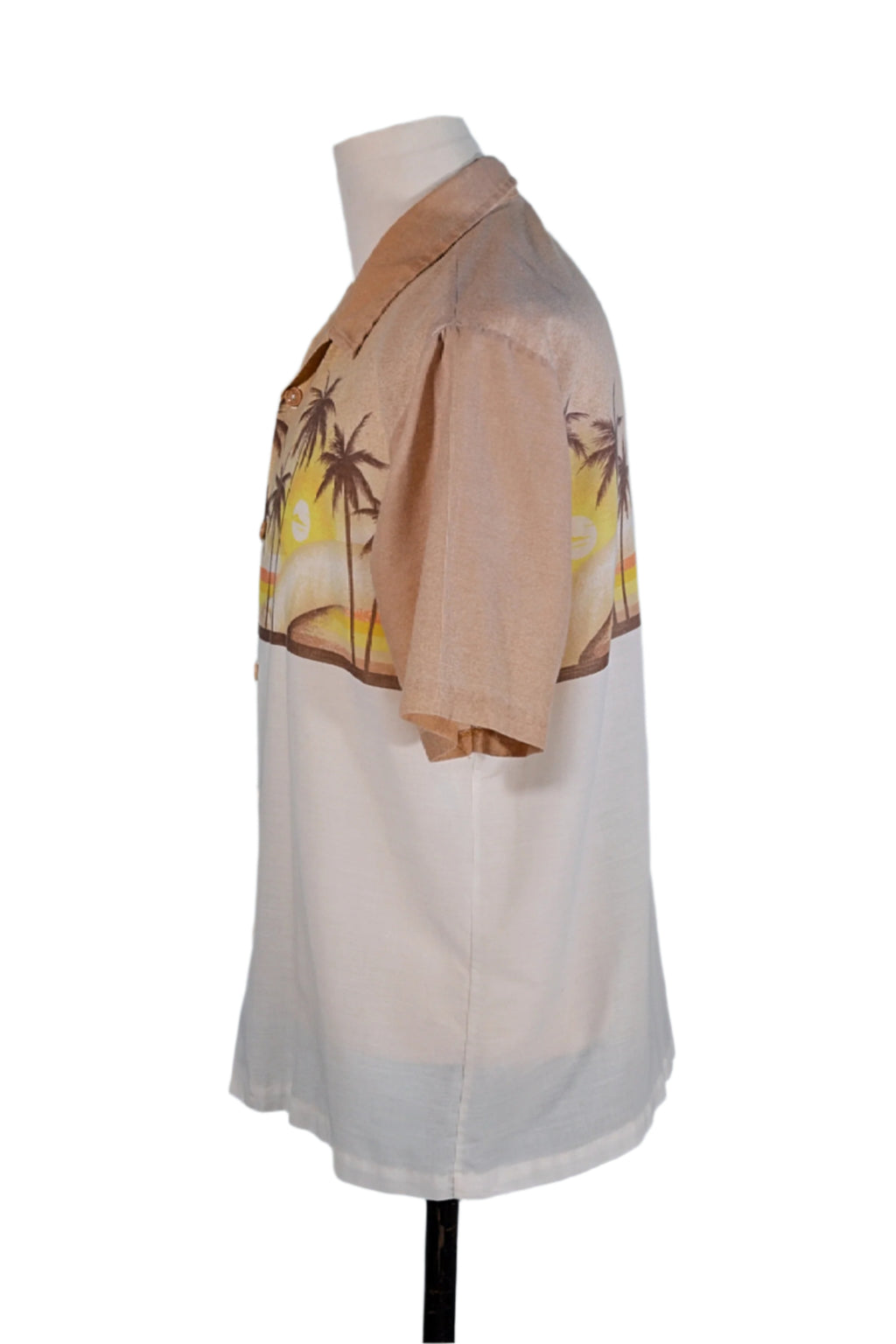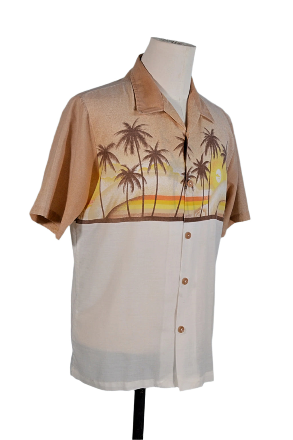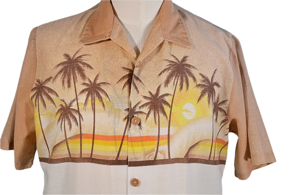 Great 1970s California Style Hawaiian Aloha shirt. Wooden buttons up the front. Palm trees, sunset, and a rainbow.