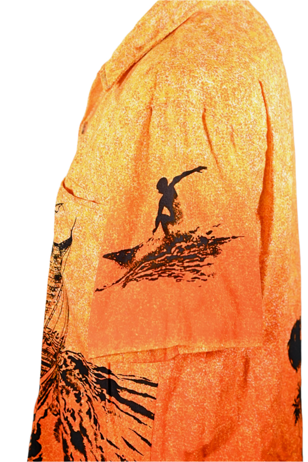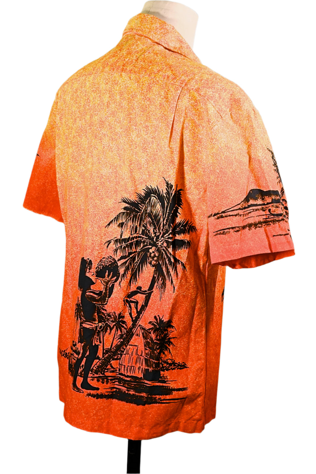Coconut boy with palm trees, outrigger boat, surfers in silhouette.