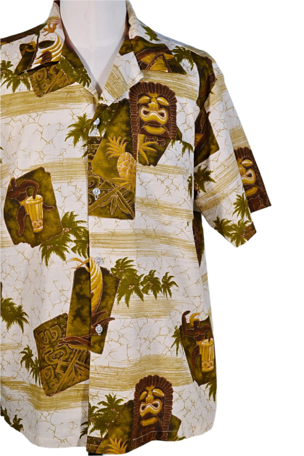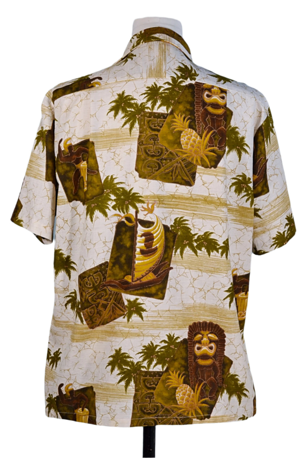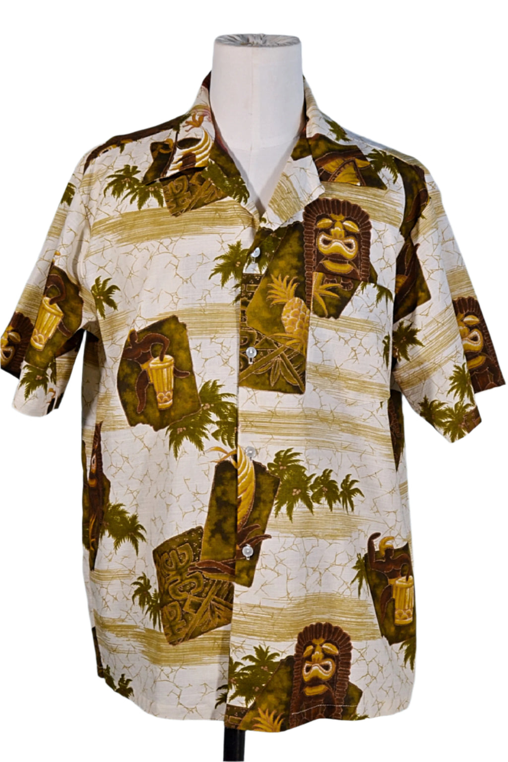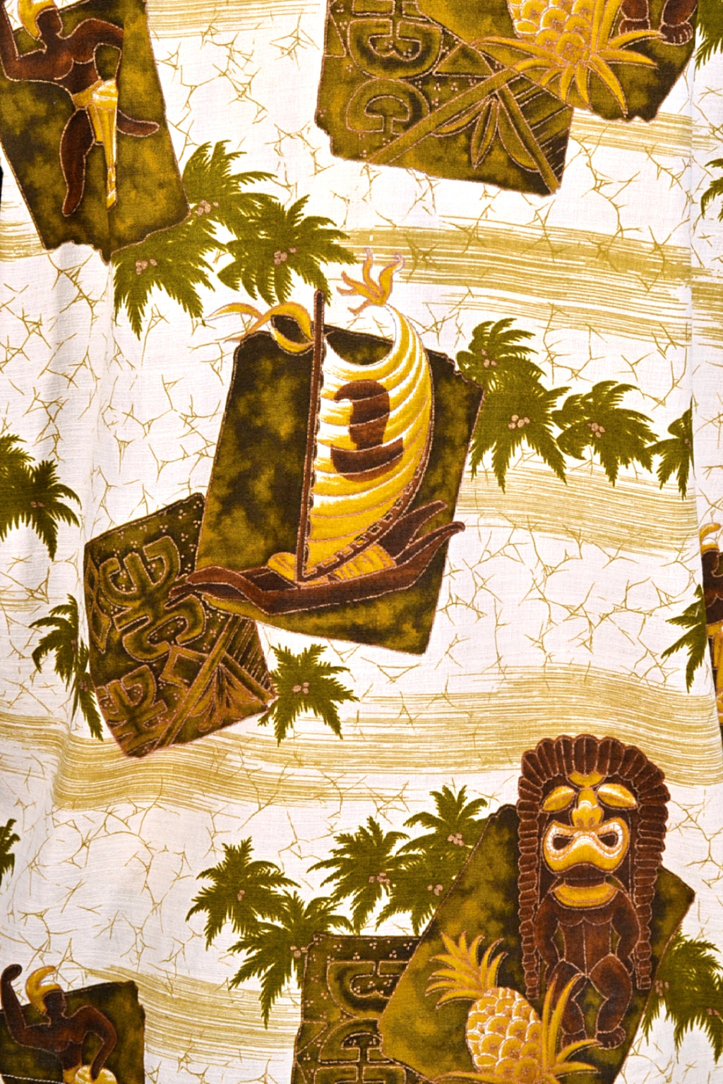 This is a great vintage Polynesian Hawaiian print Aloha shirt. The print on the textural fabric is palm trees, dancers with drums, ships, pineapples and Tikis.