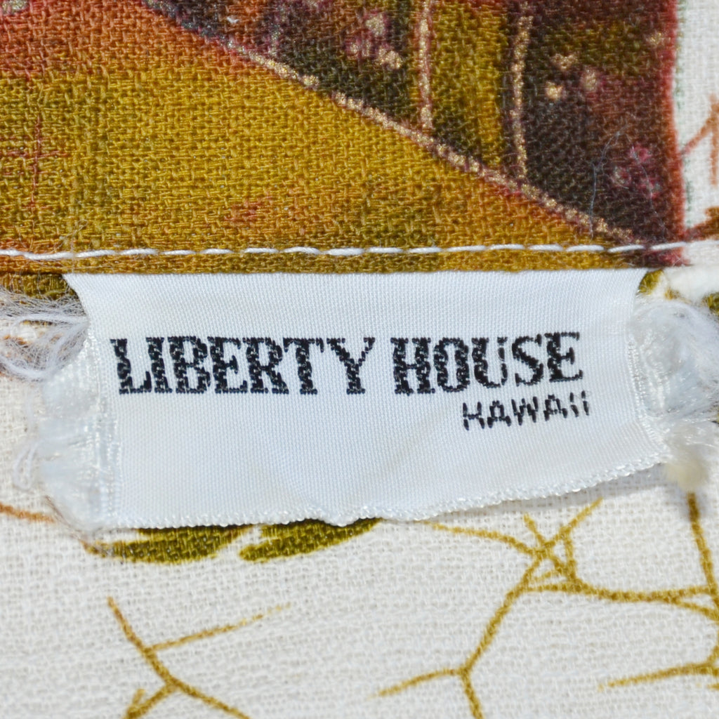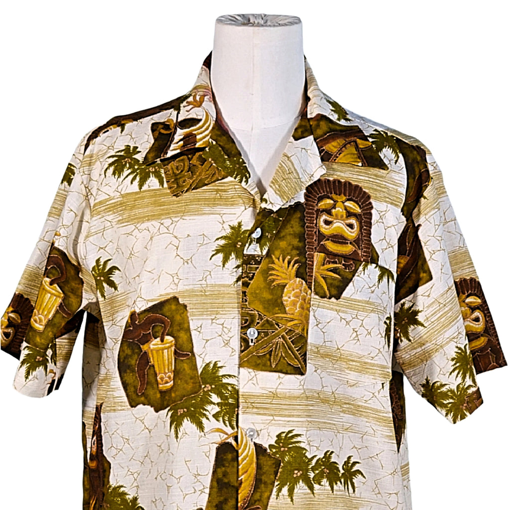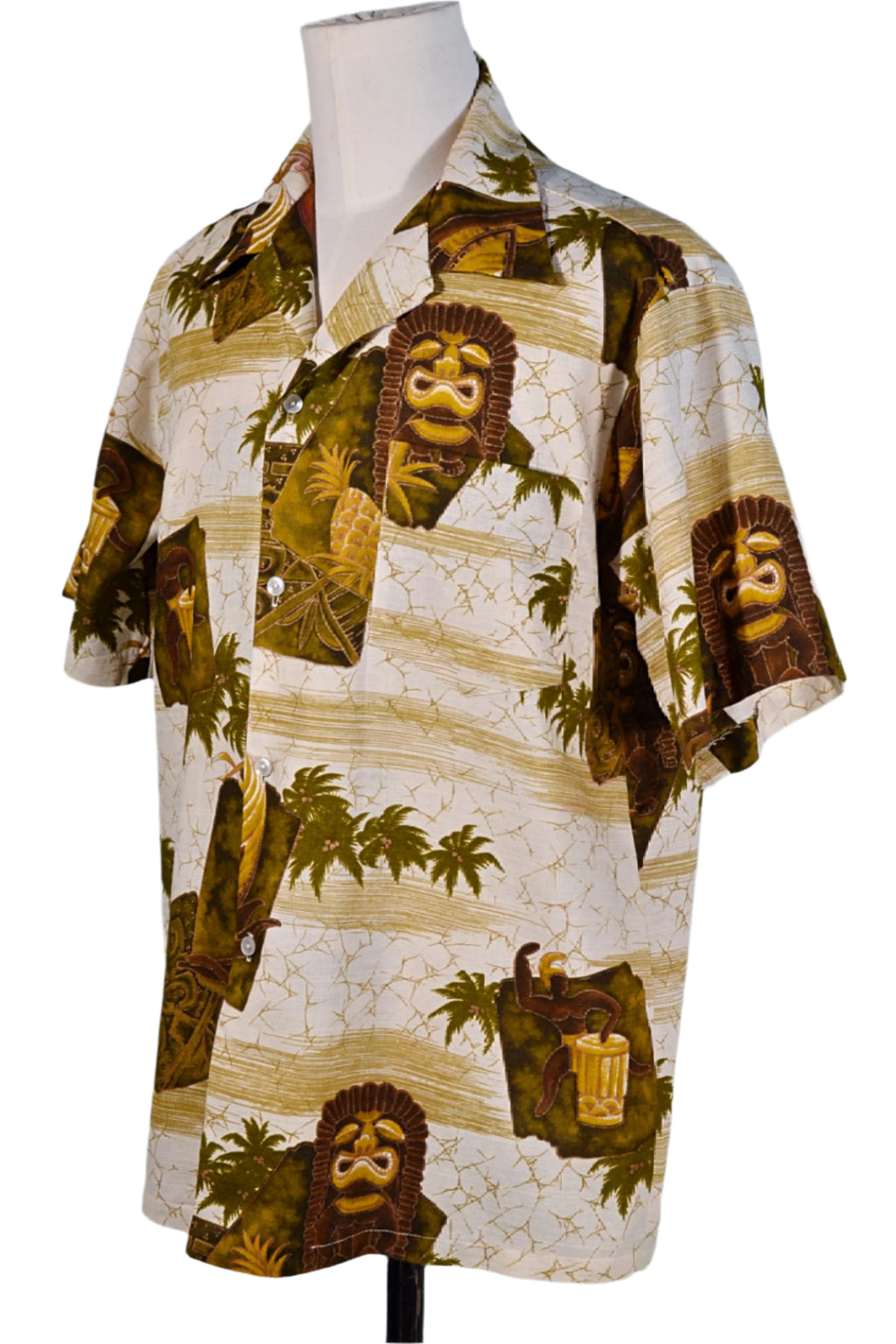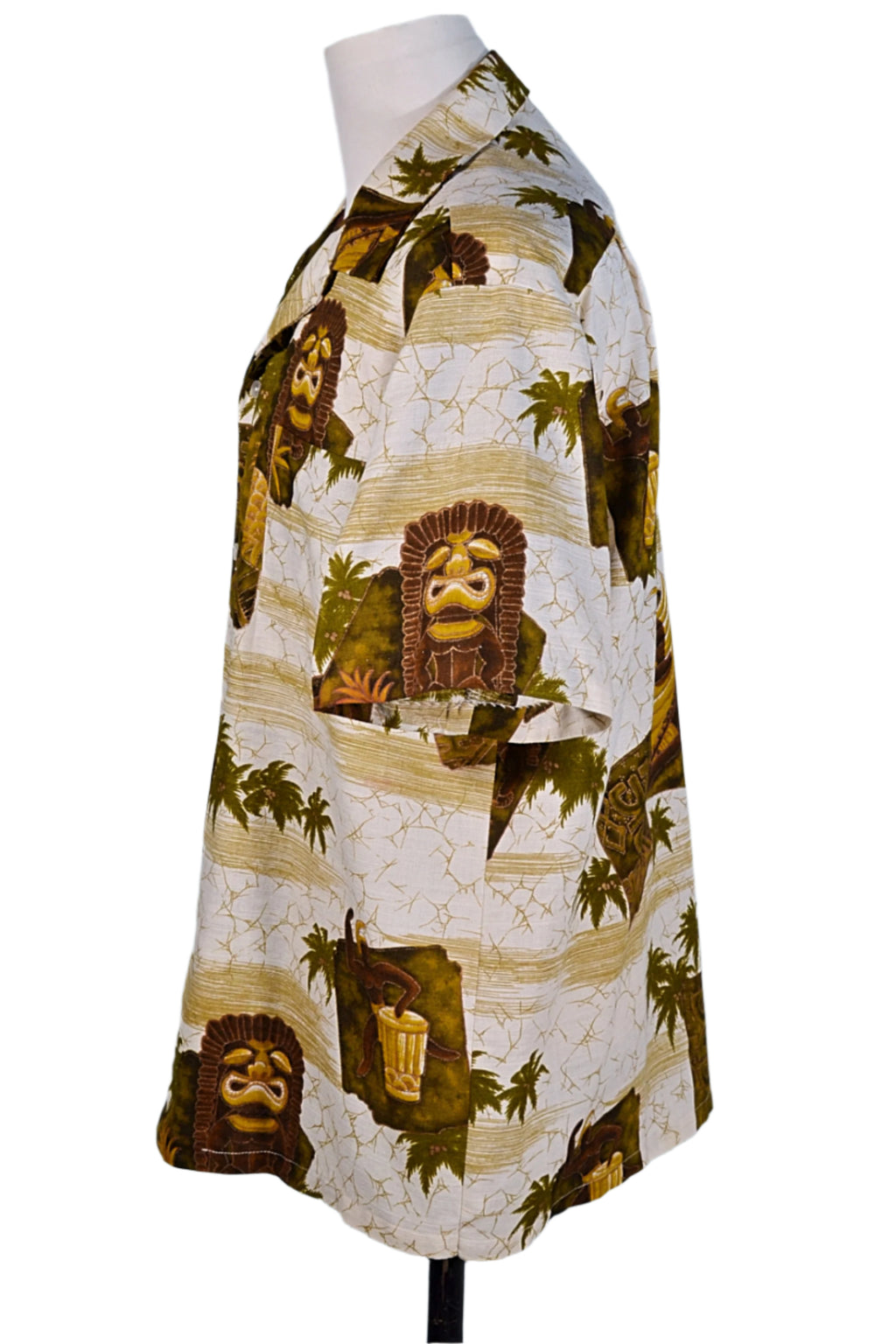 This is a great vintage Polynesian Hawaiian print Aloha shirt. The print on the textural fabric is palm trees, dancers with drums, ships, pineapples and Tikis.